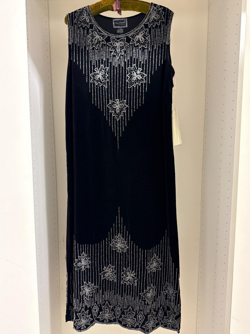 Lot # 18 - April Cornell Black Cotton Dress With Silver Beaded 1920s Design Starting Bid: $ 5.00 Bids: This sale will end in: |