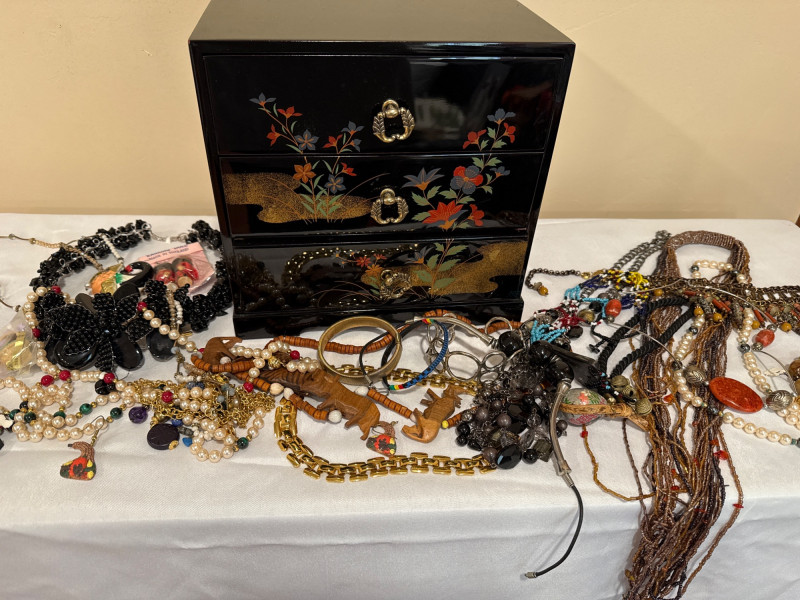 Lot # 30 - Three-Drawer Black Lacquer Jewelry Box And Assorted Fashion Jewelry Starting Bid: $ 5.00 Bids: This sale will end in: |