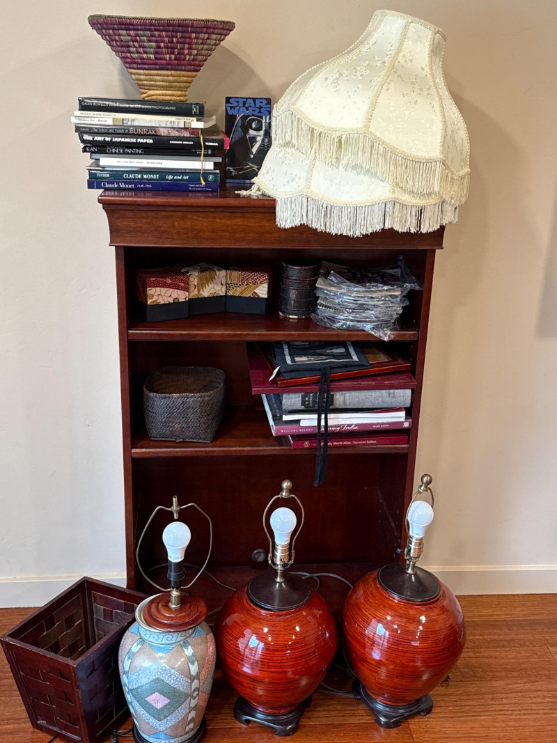 Lot # 36 - Bookcase With Assorted Books Three Table Lamps And Twelve Salad Plates Starting Bid: $ 5.00 Bids: This sale will end in: |