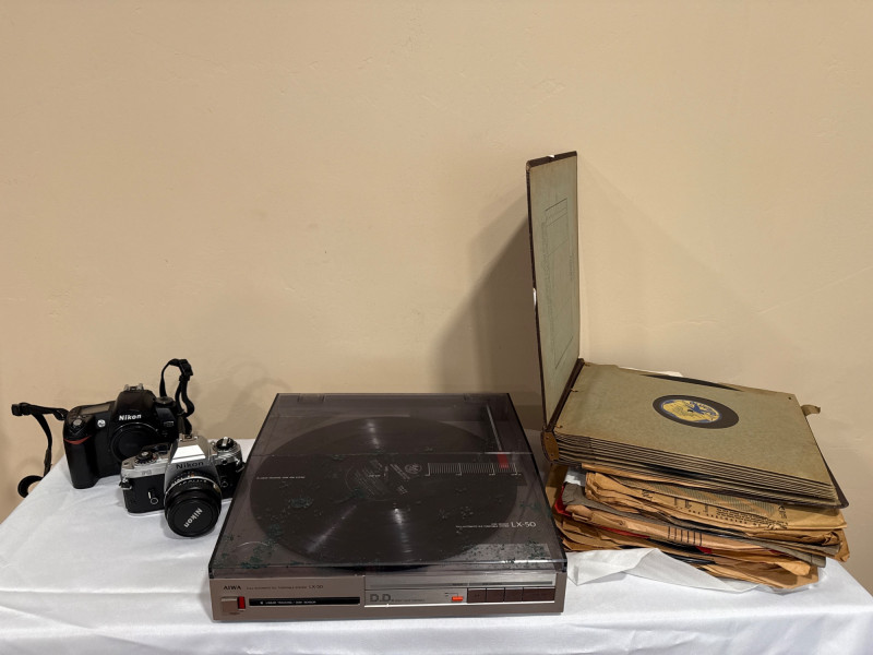 Lot # 38 - Vintage Aiwa Turntable Nikon Cameras And Assorted Shellac Records Starting Bid: $ 5.00 Bids: This sale will end in: |