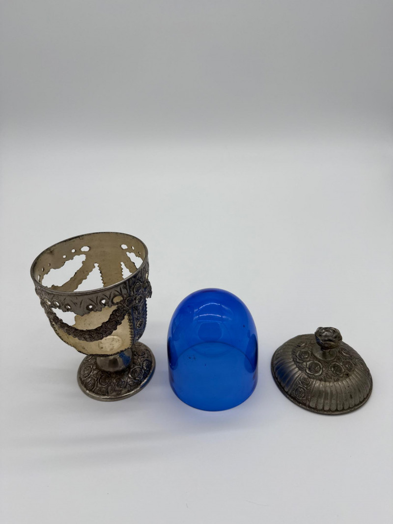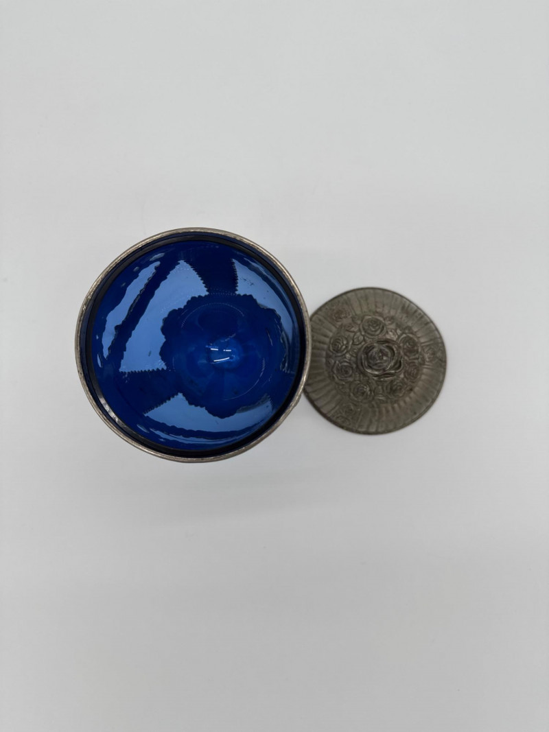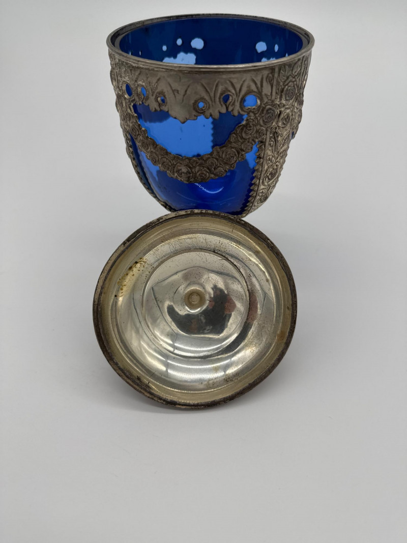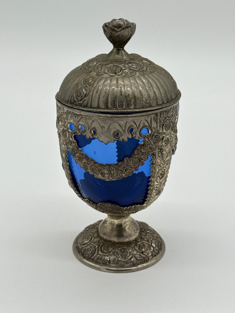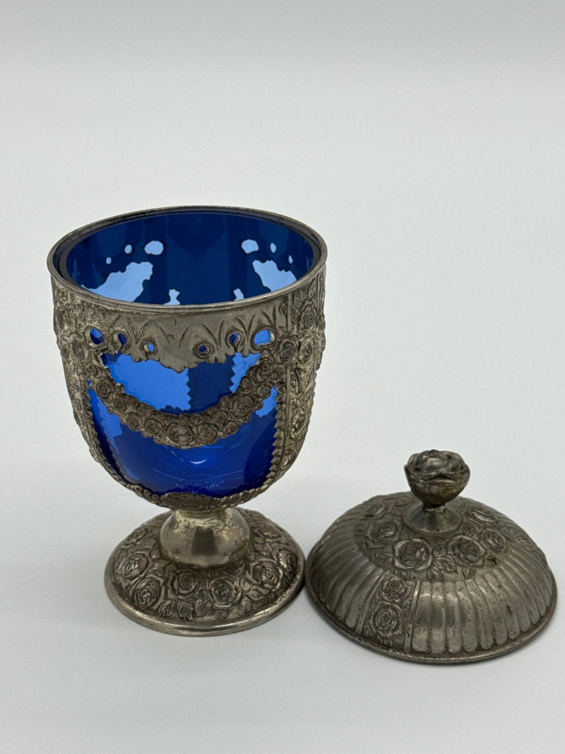Vintage Decorative Covered Compote or Candy Dish Vintage Decorative Covered Compote or Candy Dish featuring blue glass and an ornate metal overlay with floral designs. The mark "MADE IN OCCUPIED JAPAN" on the bottom indicates that it was produced in Japan during the Allied occupation period following World War II, specifically between 1947 and 1952. Items from this era were predominantly made for export and are now collectible due to their historical context. The combination of blue glass insert and detailed metal filigree is typical of export novelty ware from Occupied Japan; such pieces often mimic Victorian or Edwardian styles, though they are mid-20th century in origin. Pieces like this were often used as candy dishes, bonbon holders, or decorative table items.