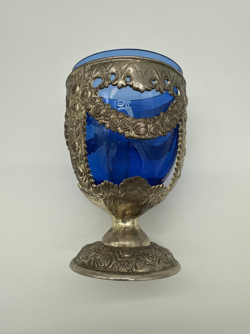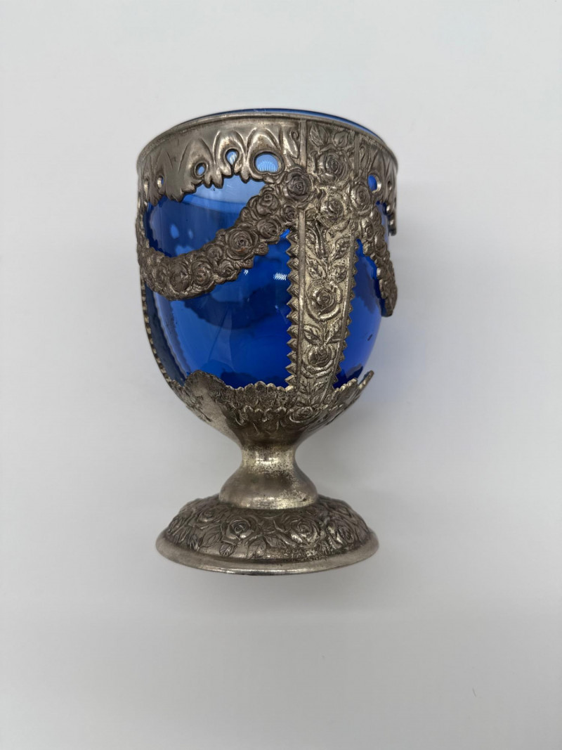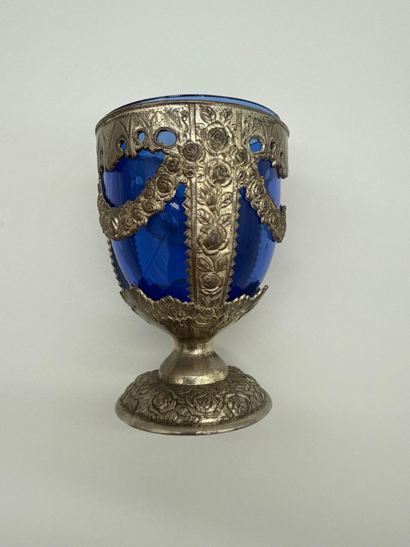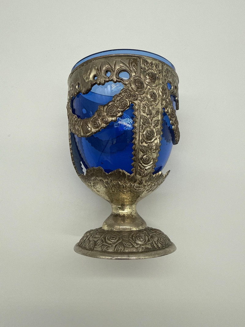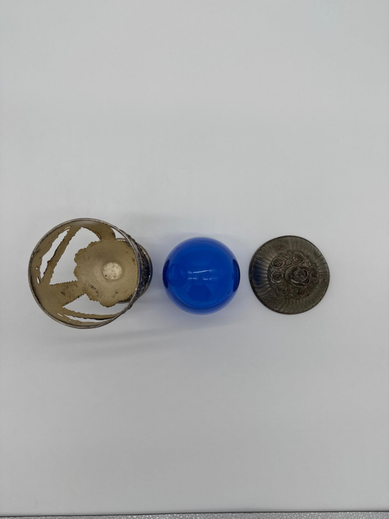 Vintage Decorative Covered Compote or Candy Dish Vintage Decorative Covered Compote or Candy Dish featuring blue glass and an ornate metal overlay with floral designs. The mark "MADE IN OCCUPIED JAPAN" on the bottom indicates that it was produced in Japan during the Allied occupation period following World War II, specifically between 1947 and 1952. Items from this era were predominantly made for export and are now collectible due to their historical context. The combination of blue glass insert and detailed metal filigree is typical of export novelty ware from Occupied Japan; such pieces often mimic Victorian or Edwardian styles, though they are mid-20th century in origin. Pieces like this were often used as candy dishes, bonbon holders, or decorative table items.