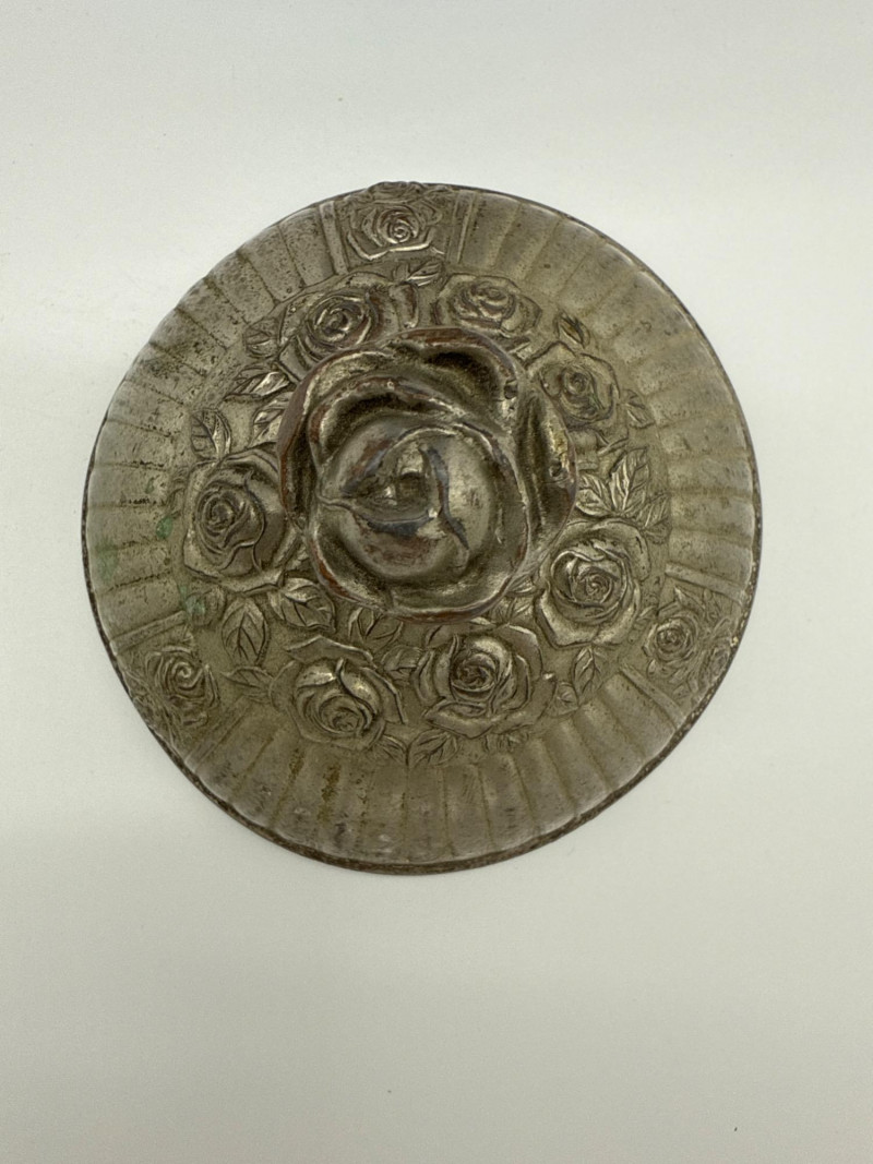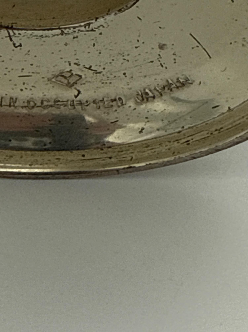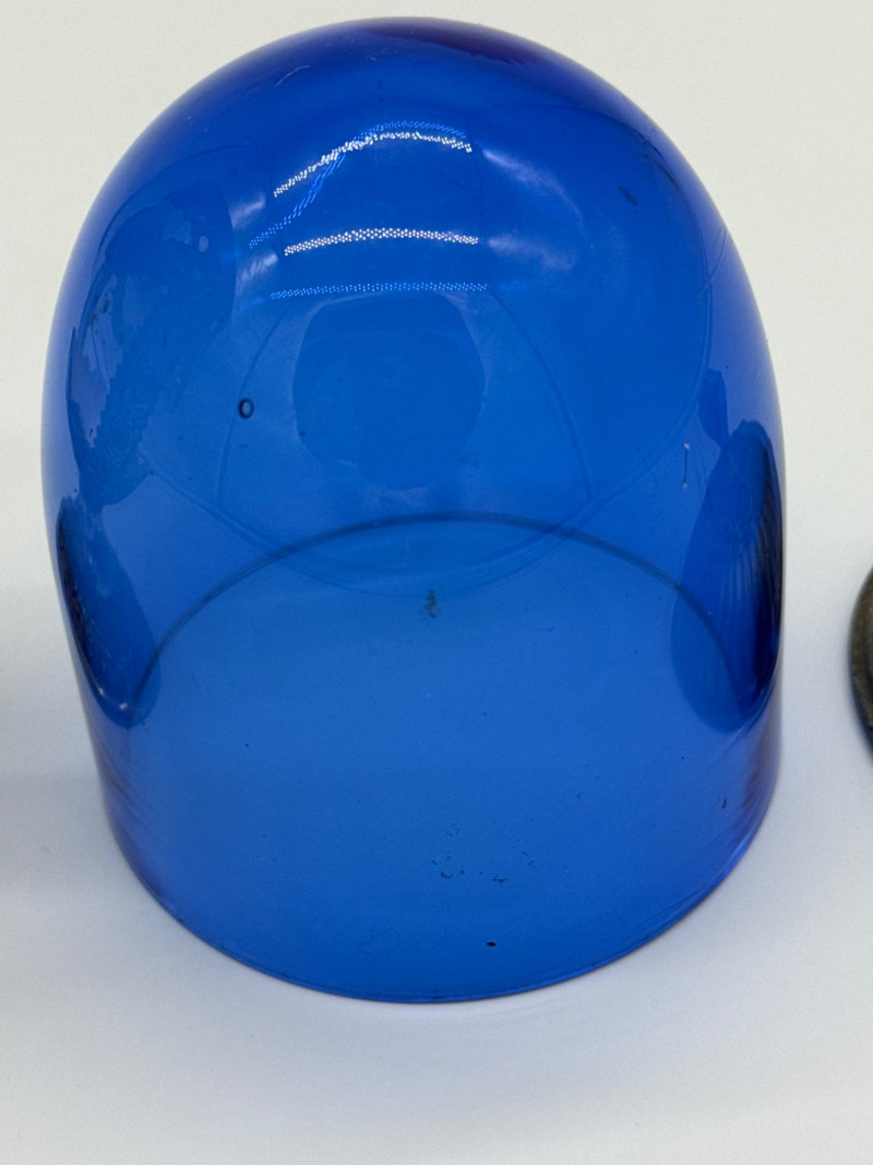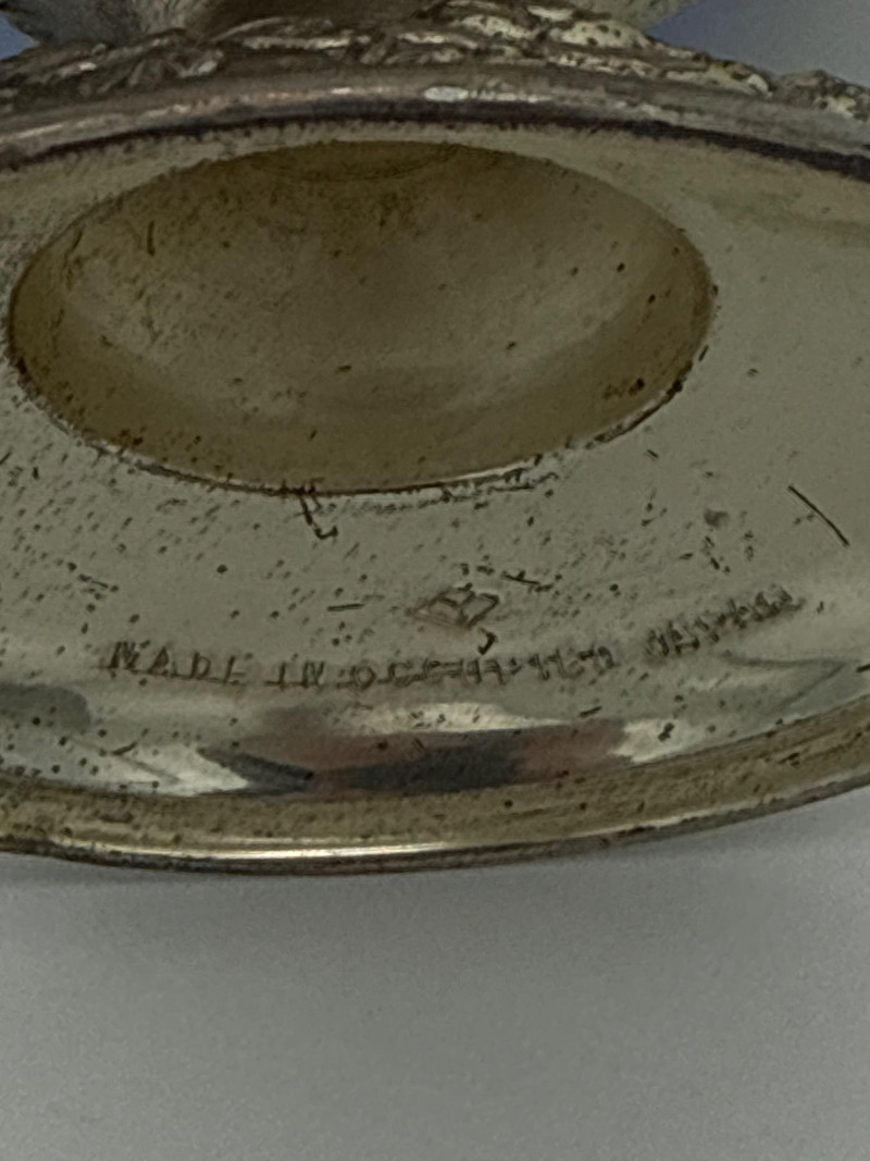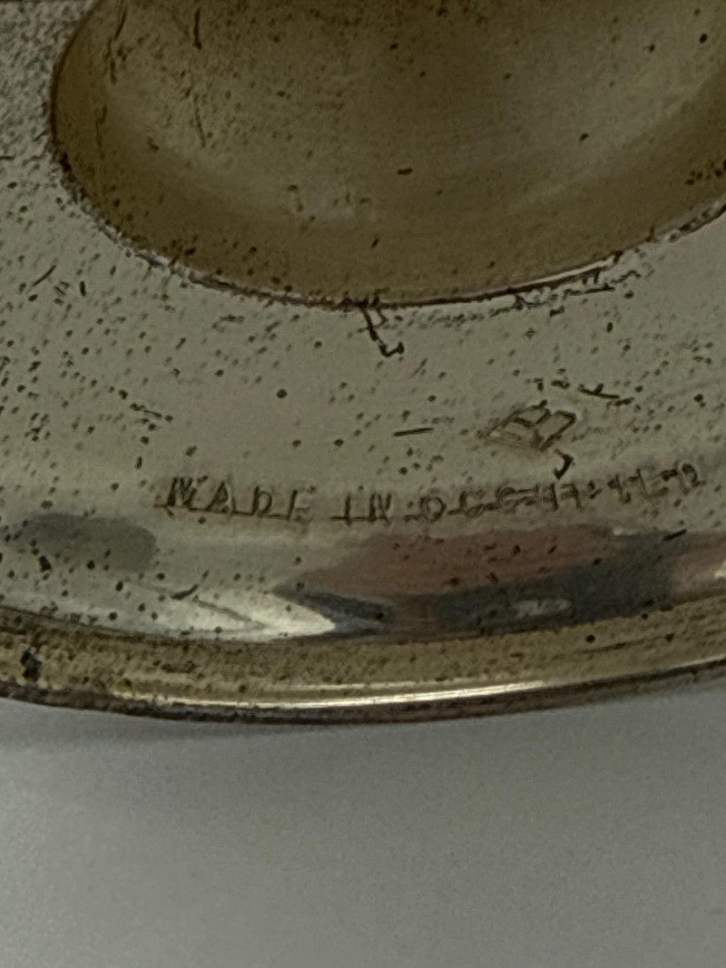 Vintage Decorative Covered Compote or Candy Dish Vintage Decorative Covered Compote or Candy Dish featuring blue glass and an ornate metal overlay with floral designs. The mark "MADE IN OCCUPIED JAPAN" on the bottom indicates that it was produced in Japan during the Allied occupation period following World War II, specifically between 1947 and 1952. Items from this era were predominantly made for export and are now collectible due to their historical context. The combination of blue glass insert and detailed metal filigree is typical of export novelty ware from Occupied Japan; such pieces often mimic Victorian or Edwardian styles, though they are mid-20th century in origin. Pieces like this were often used as candy dishes, bonbon holders, or decorative table items.