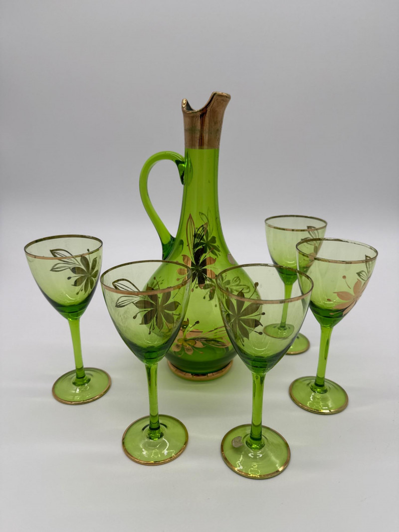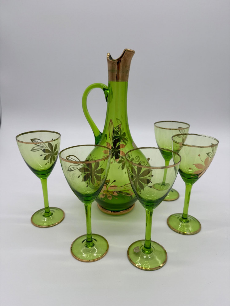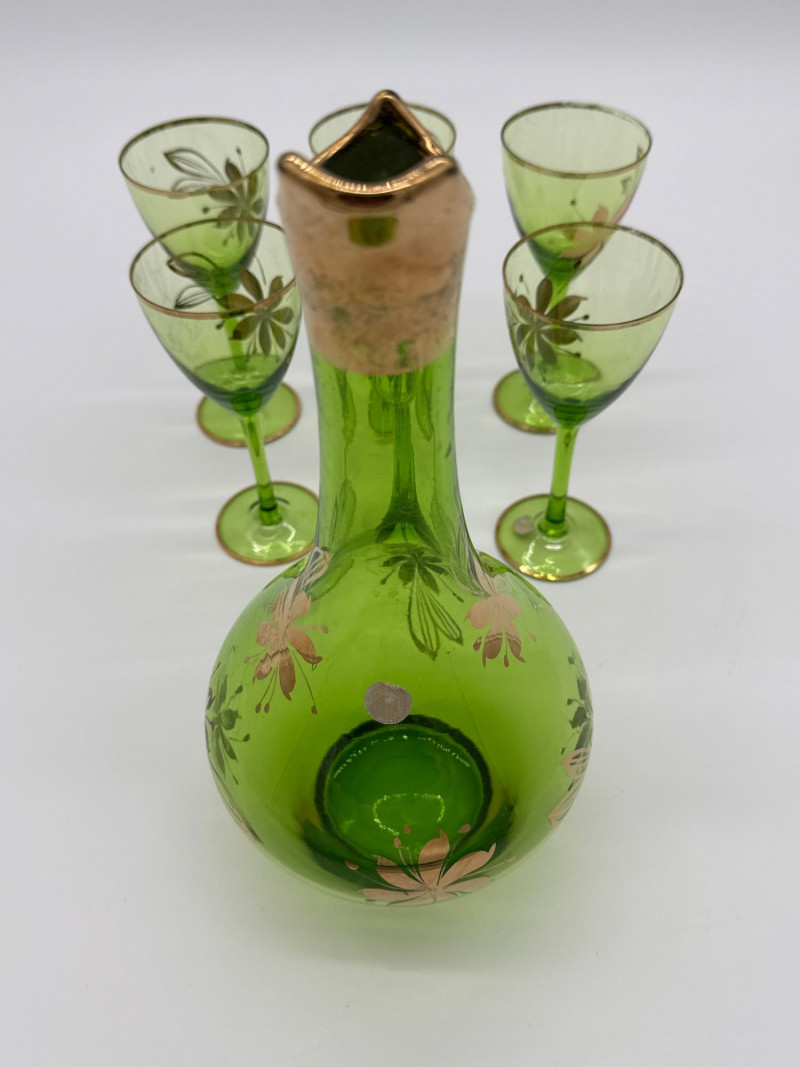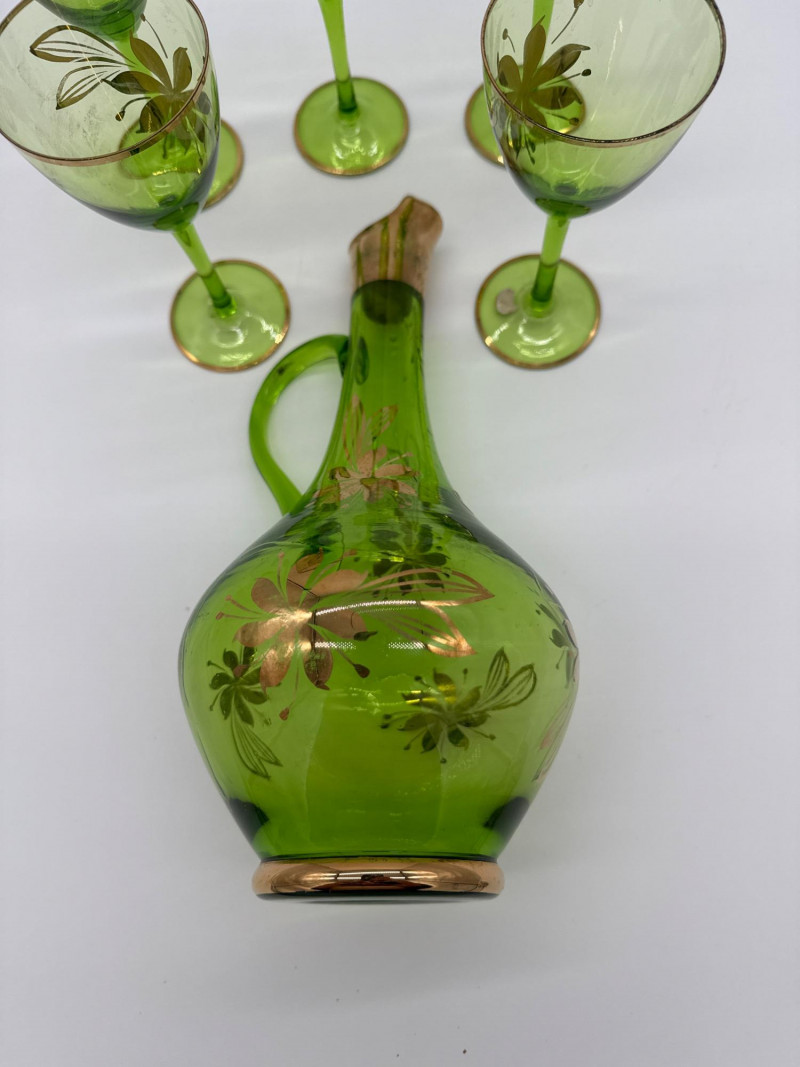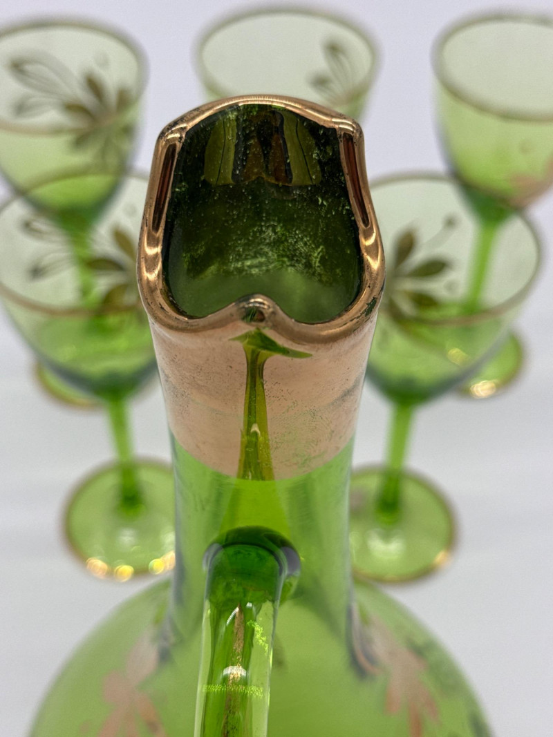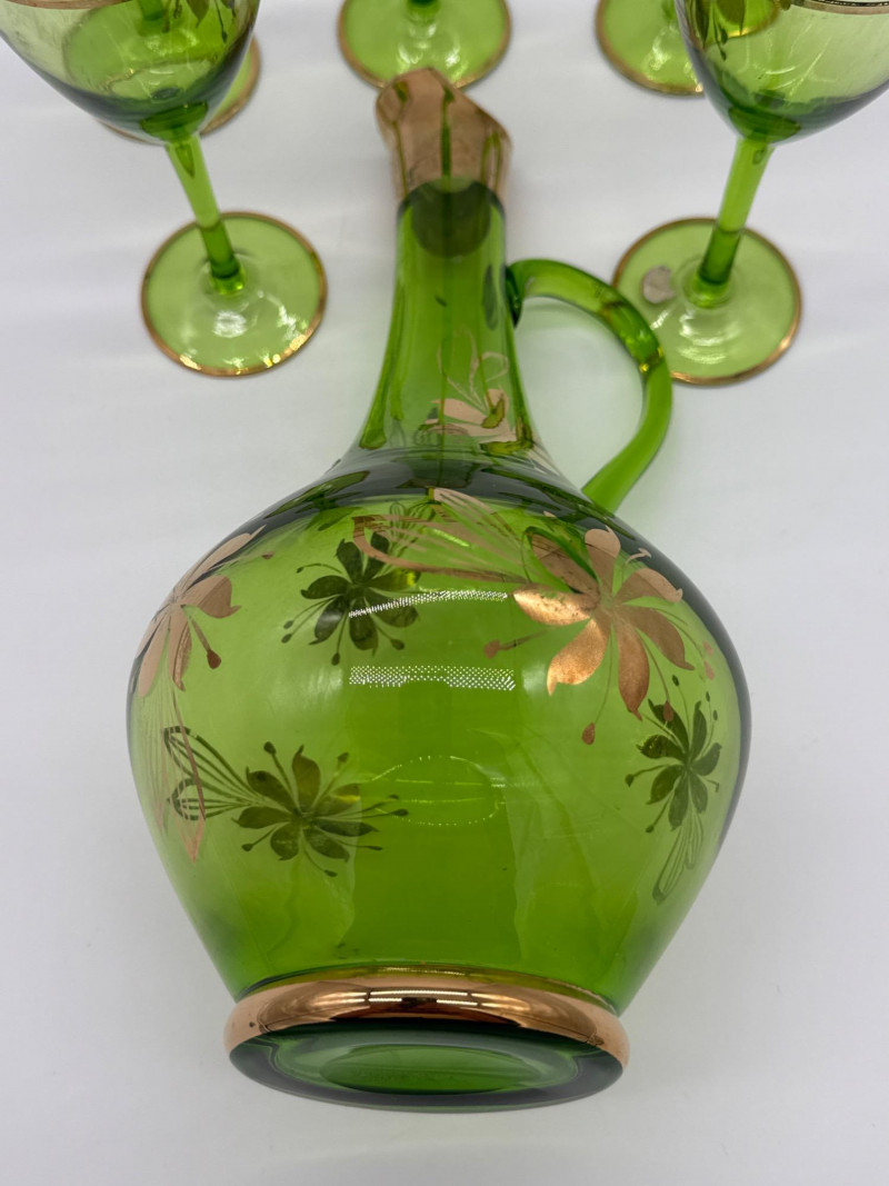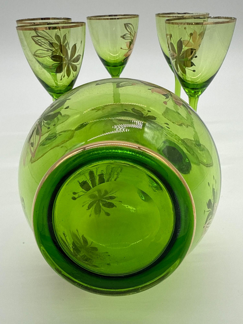 green glass decanter and five matching stemmed goblets. Each piece is decorated
