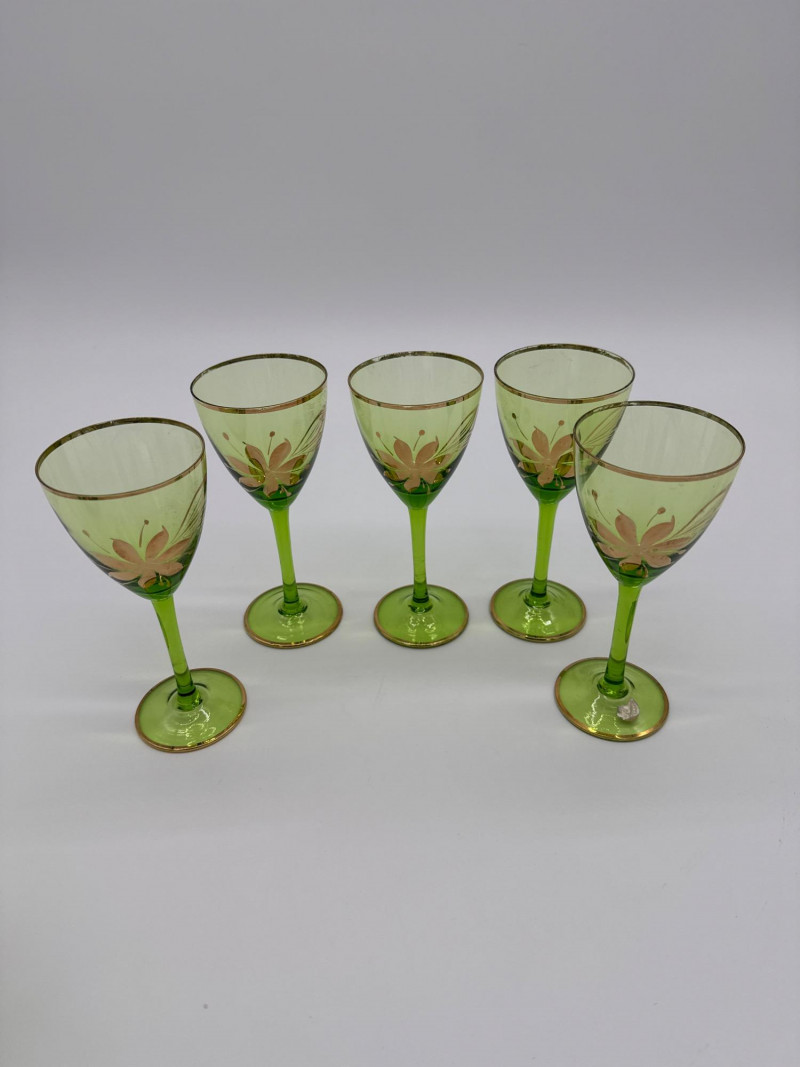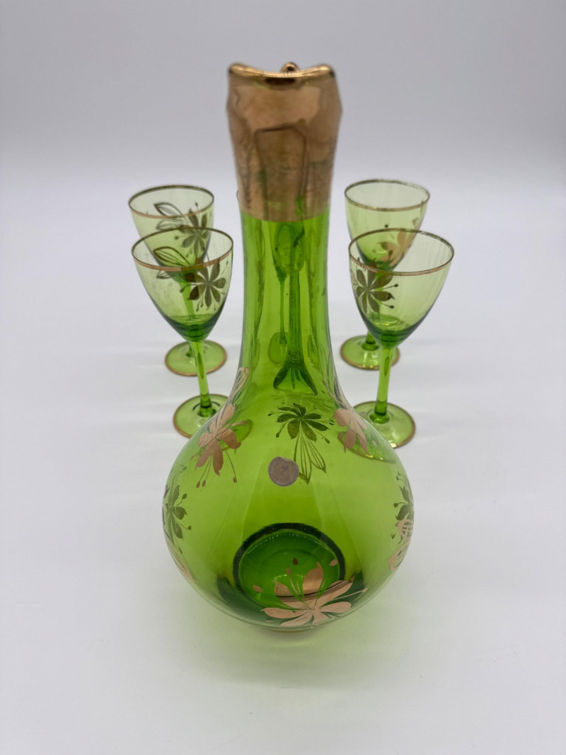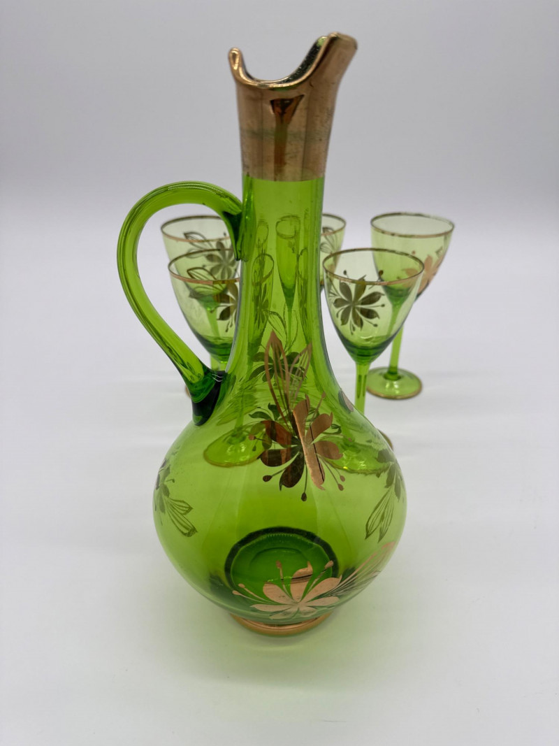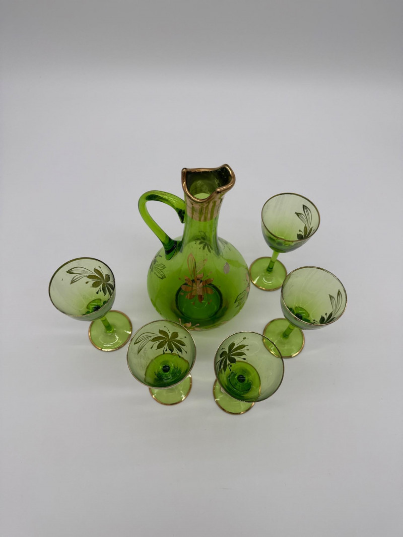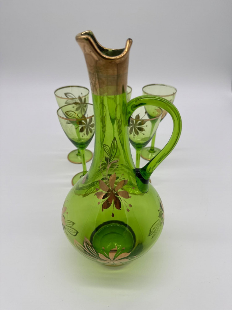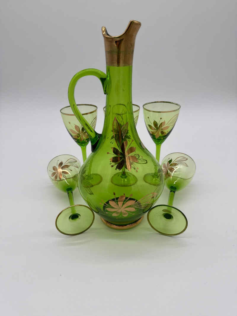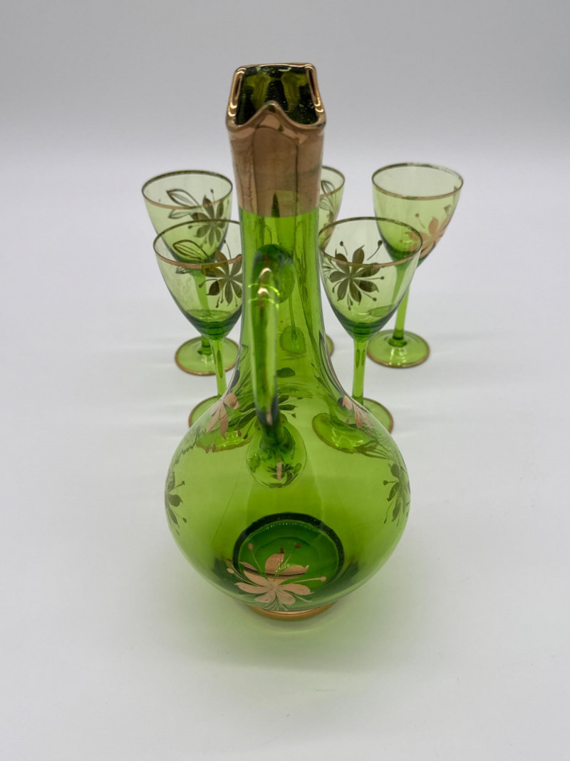 green glass decanter and five matching stemmed goblets. Each piece is decorated