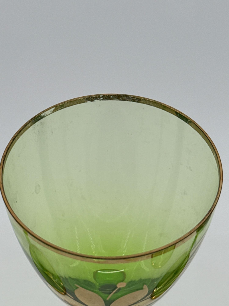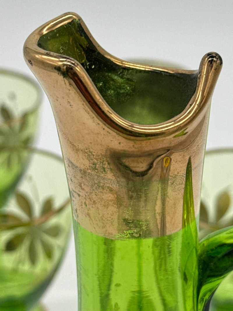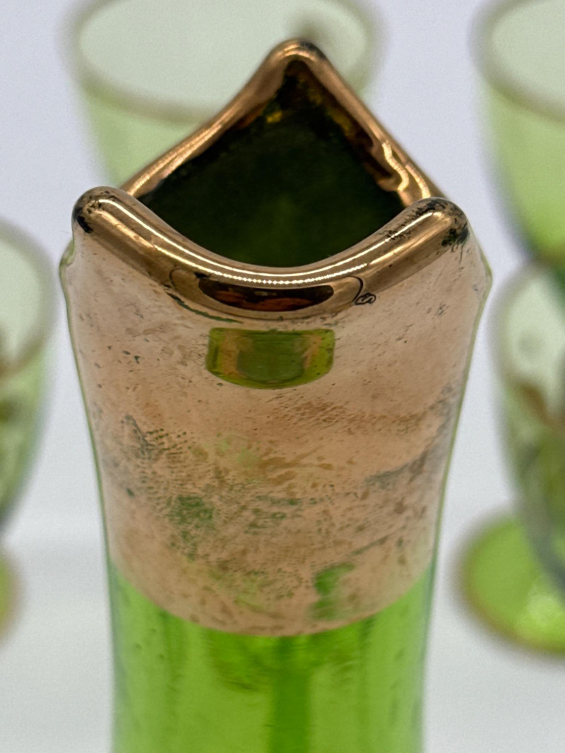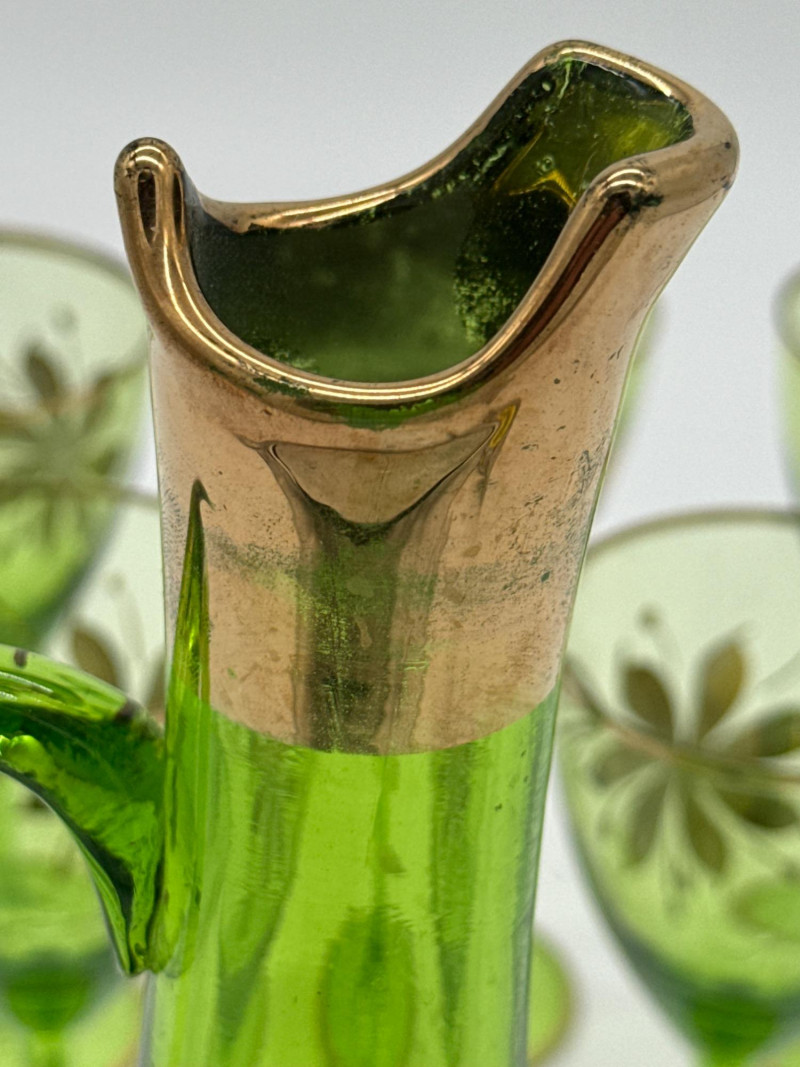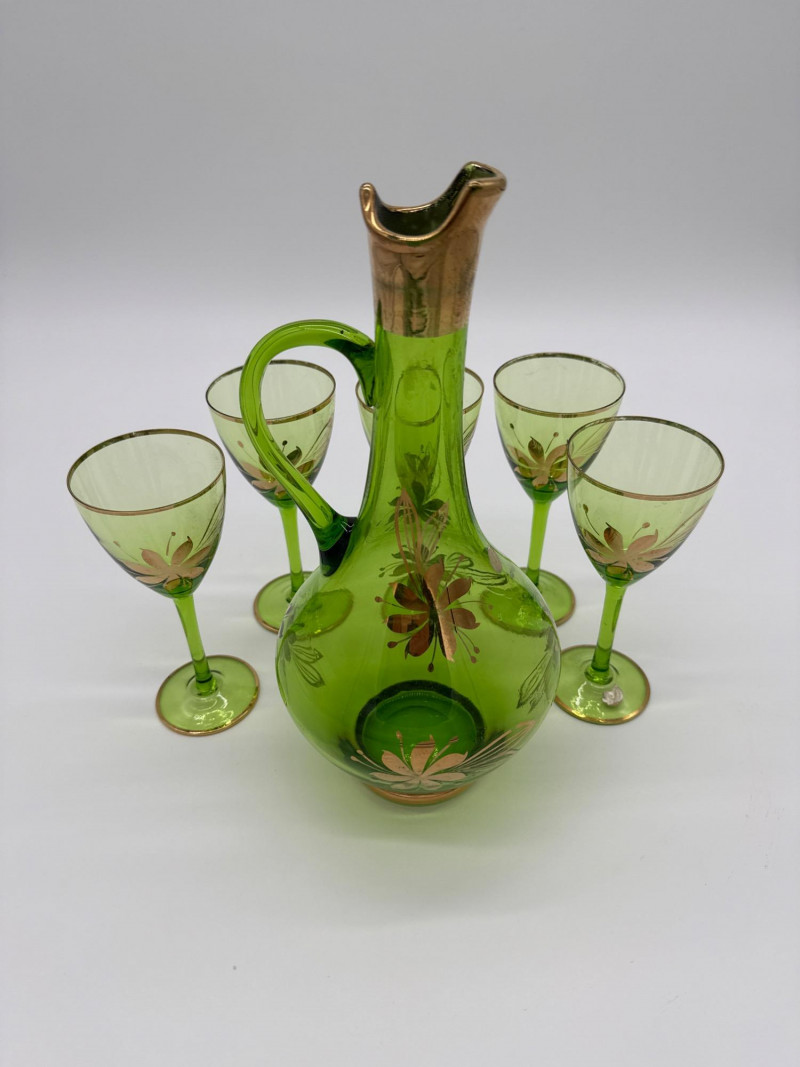 Romanian Green Glass Wine Decanter And Five Goblets With Gold
