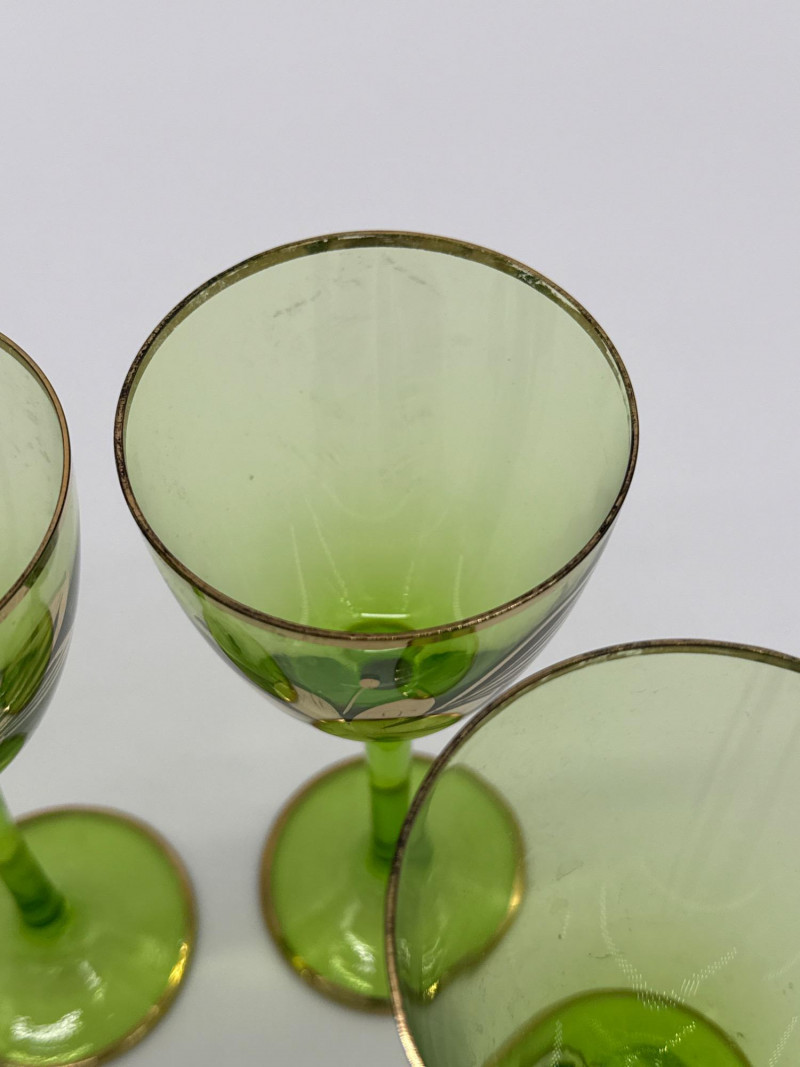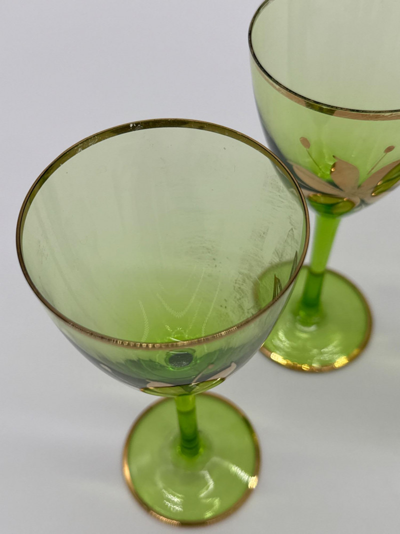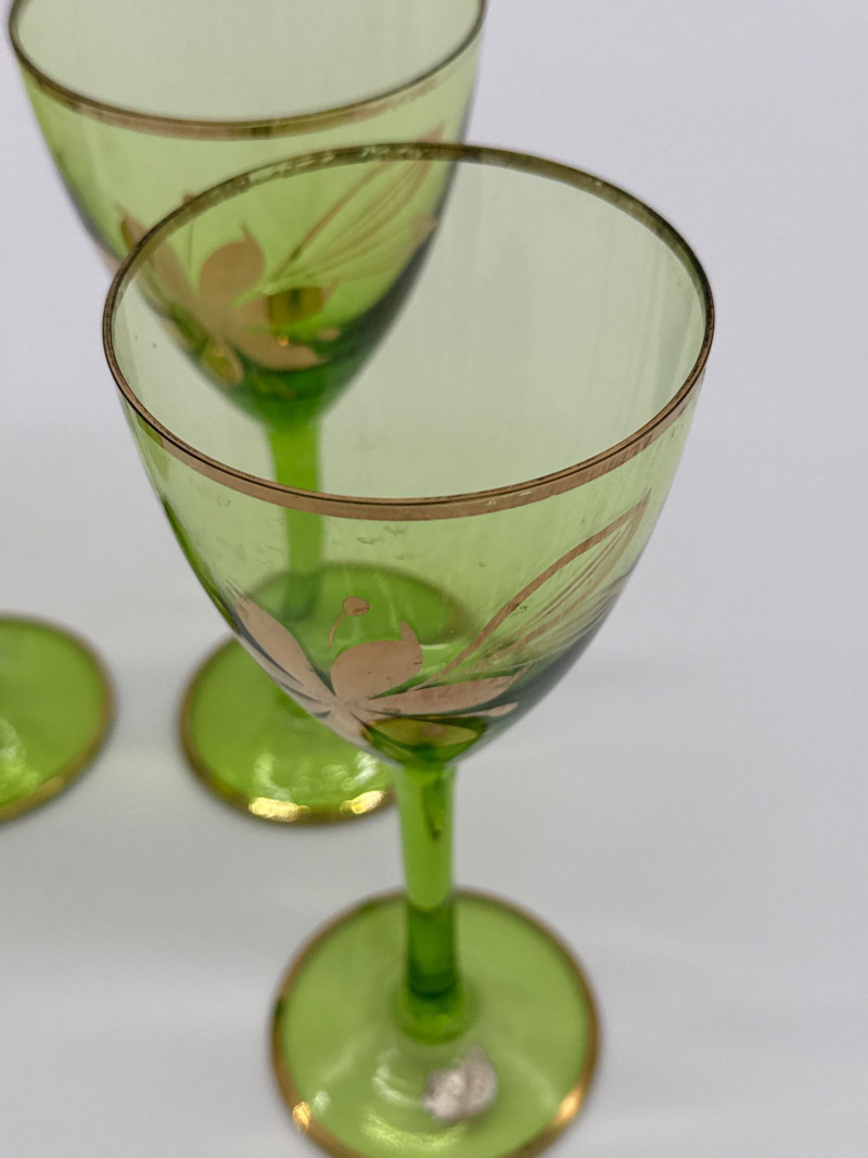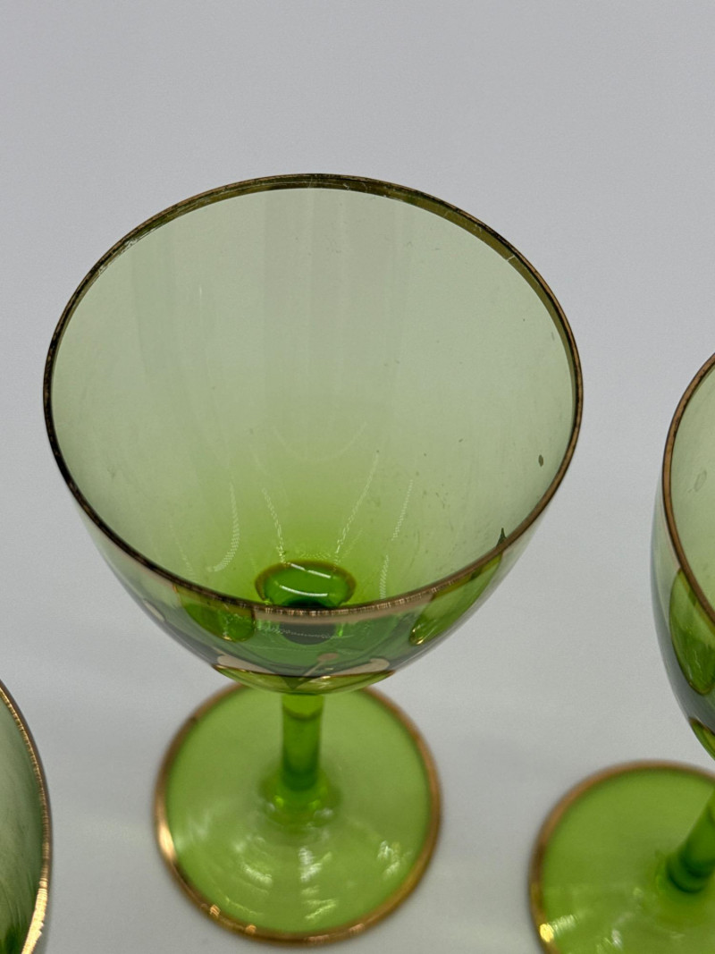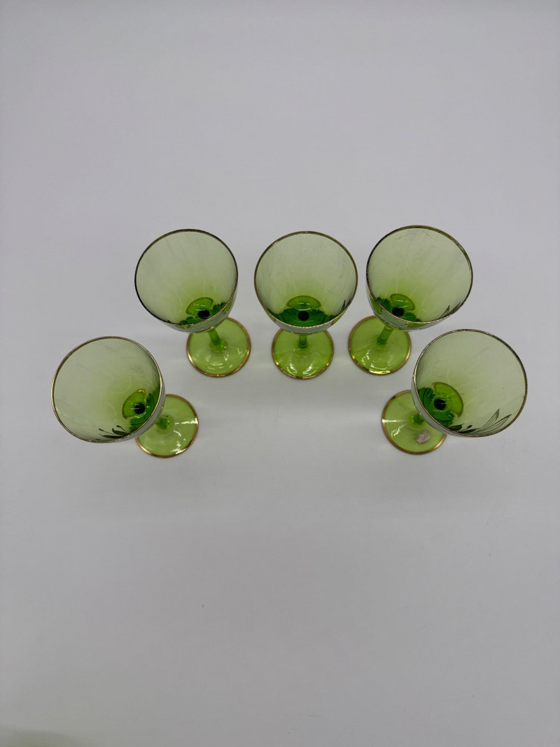 Romanian Green Glass Wine Decanter And Five Goblets With Gold