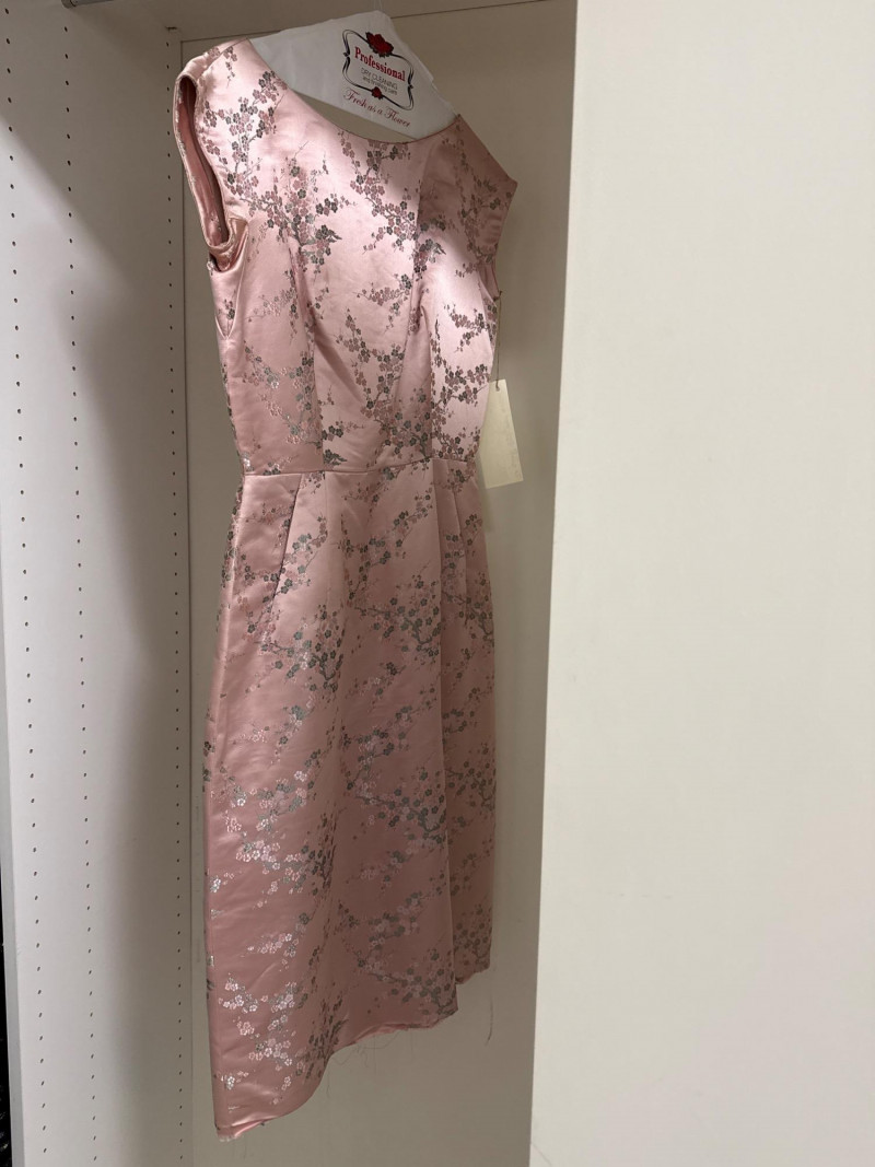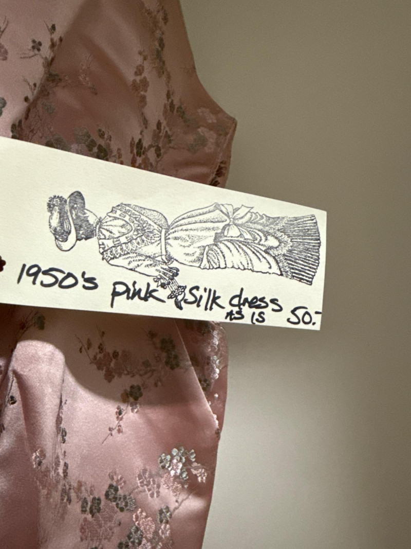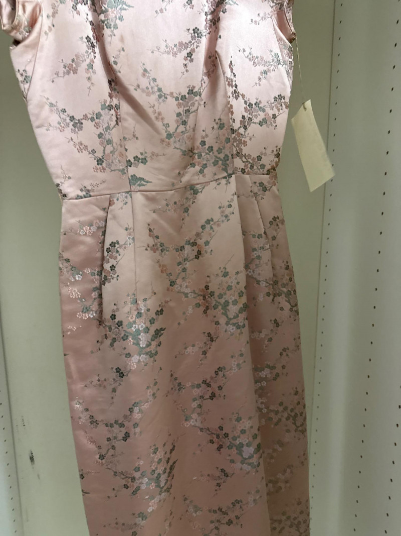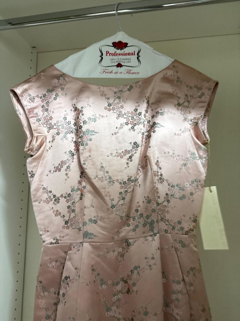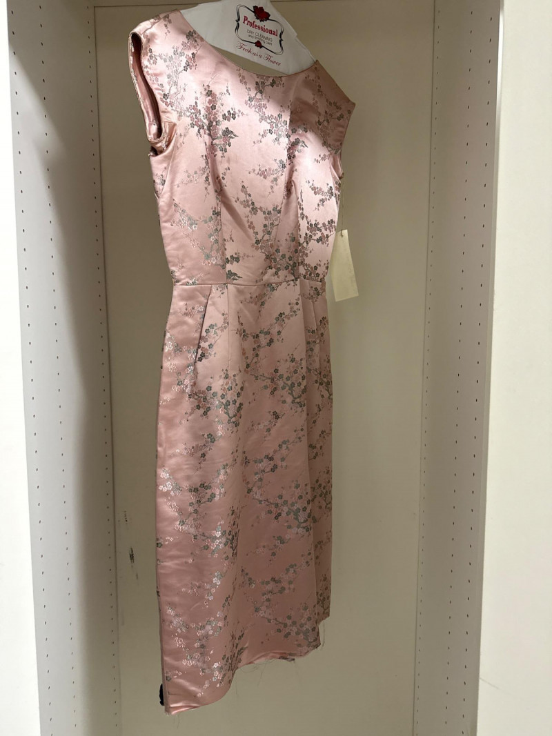 The second dress is a pink silk piece with a floral jacquard pattern, labeled