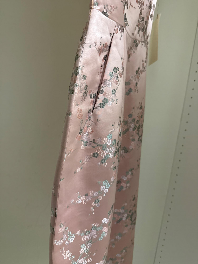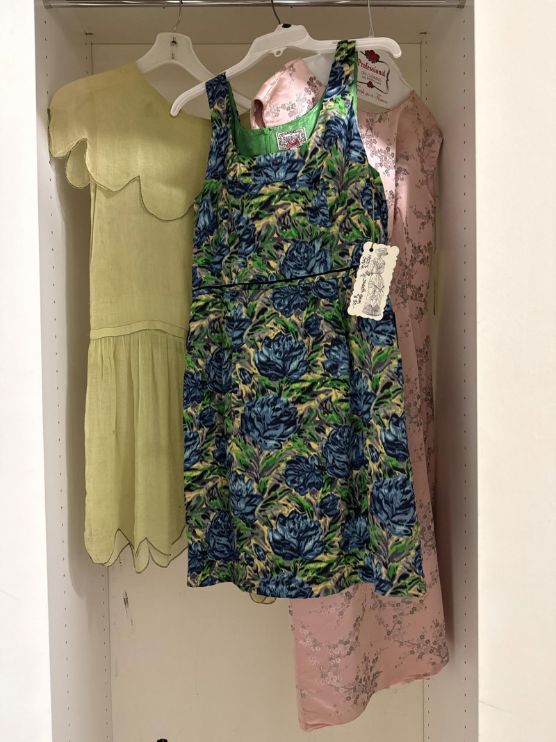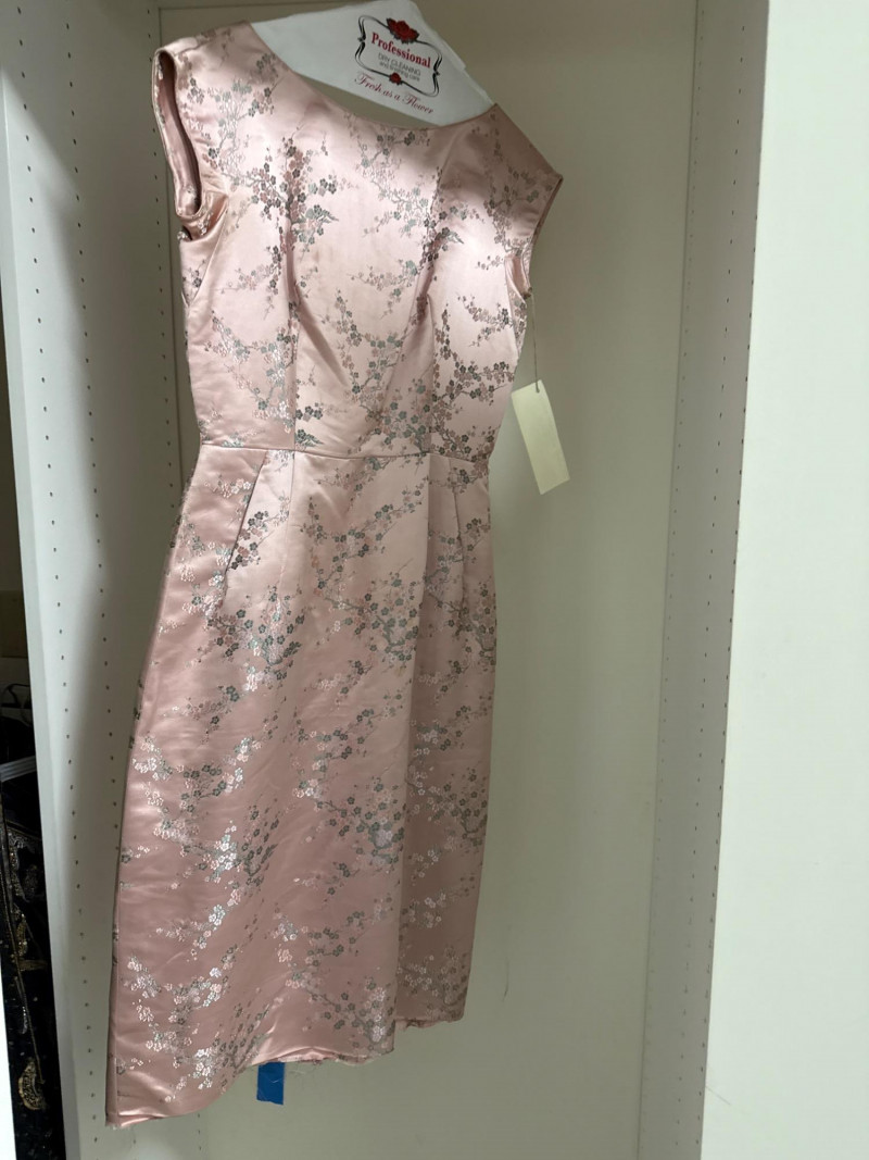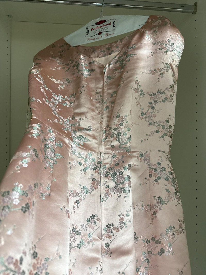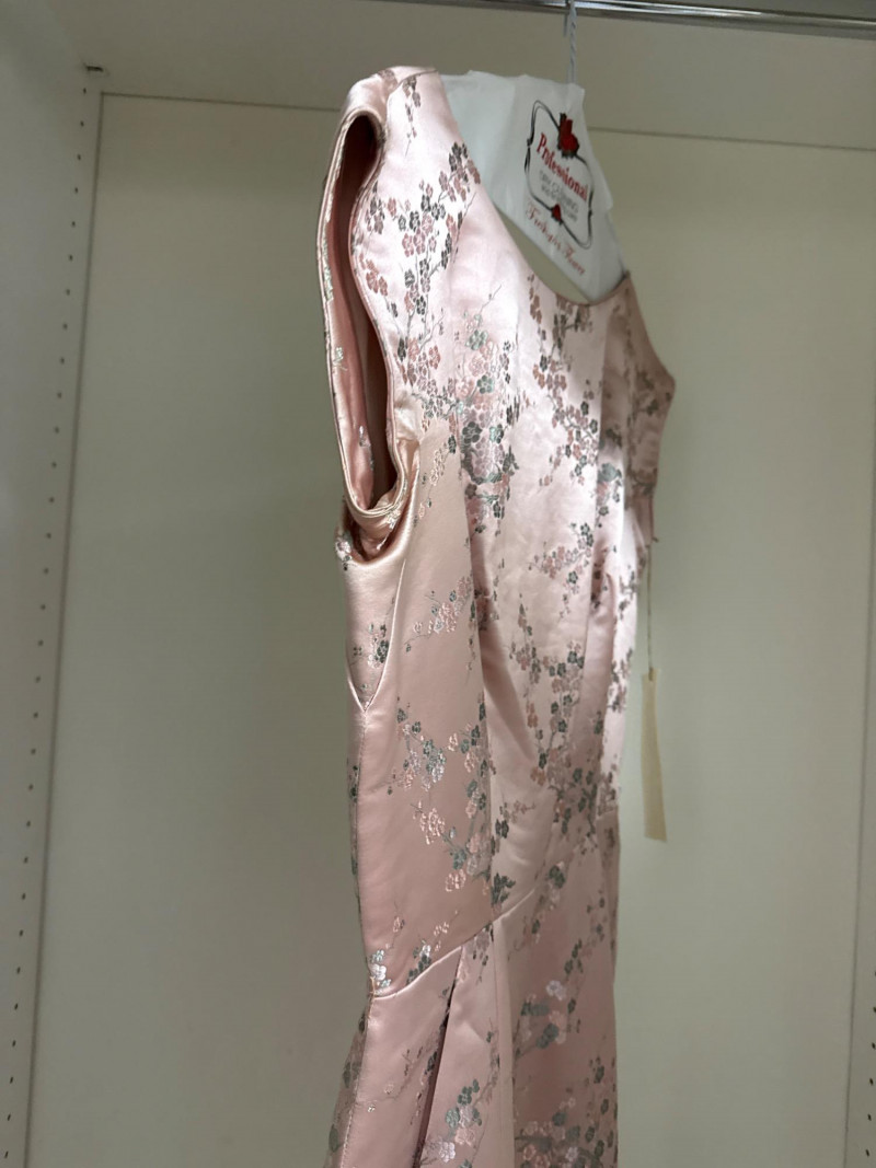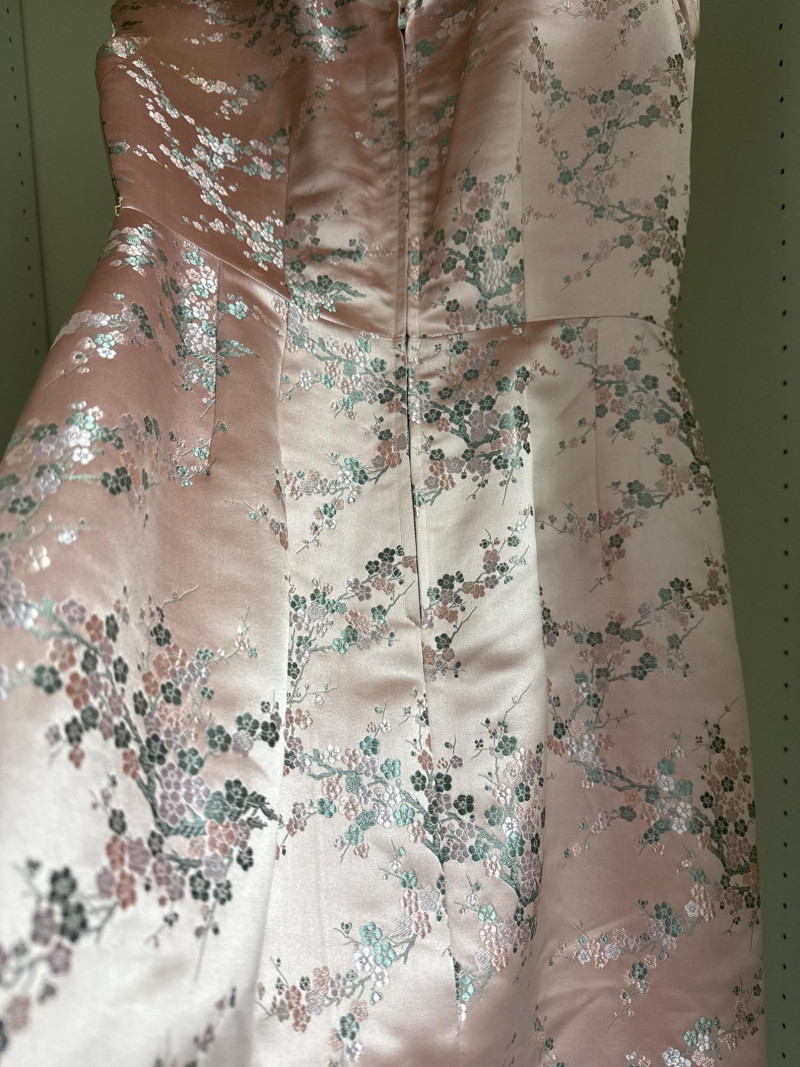 The second dress is a pink silk piece with a floral jacquard pattern, labeled
