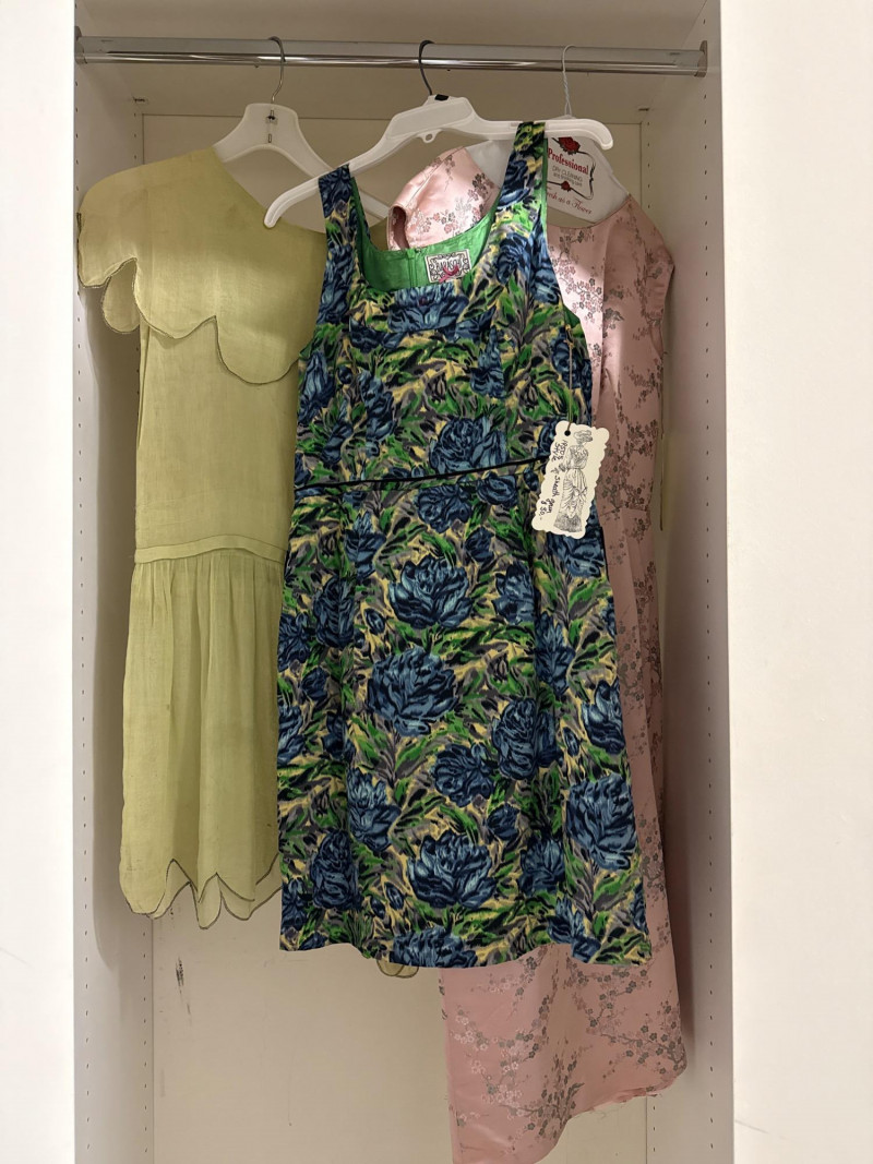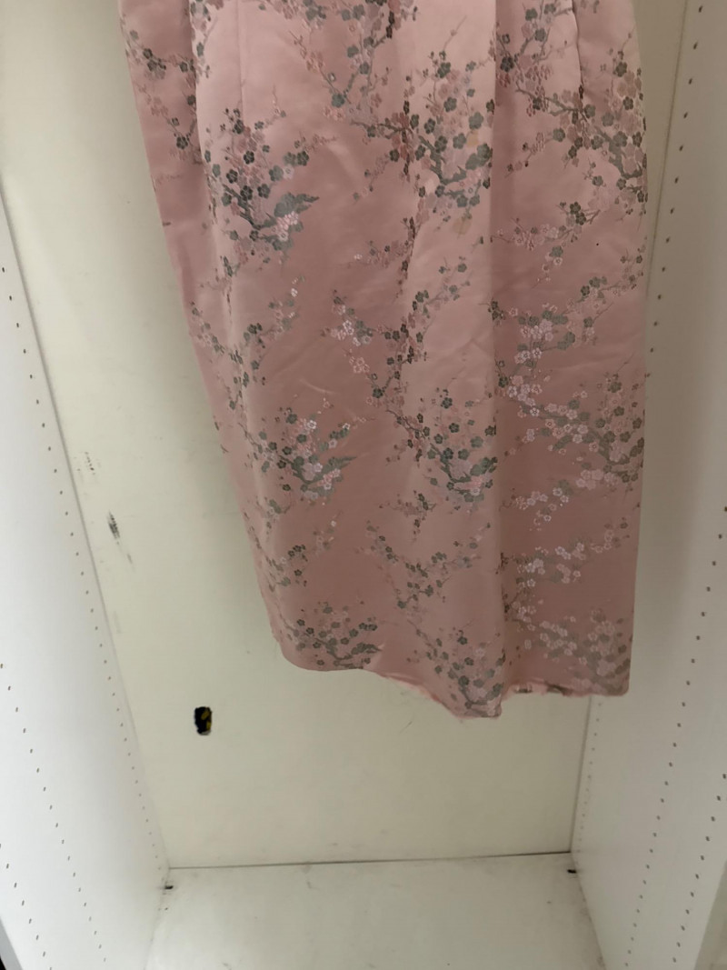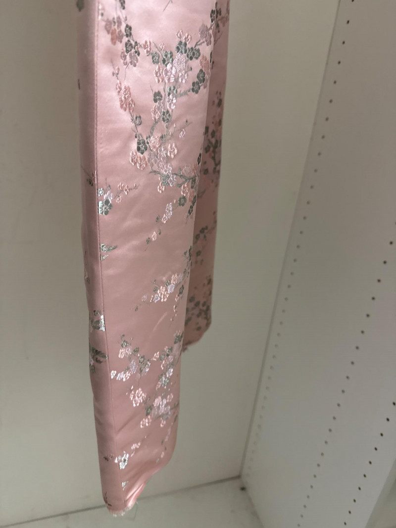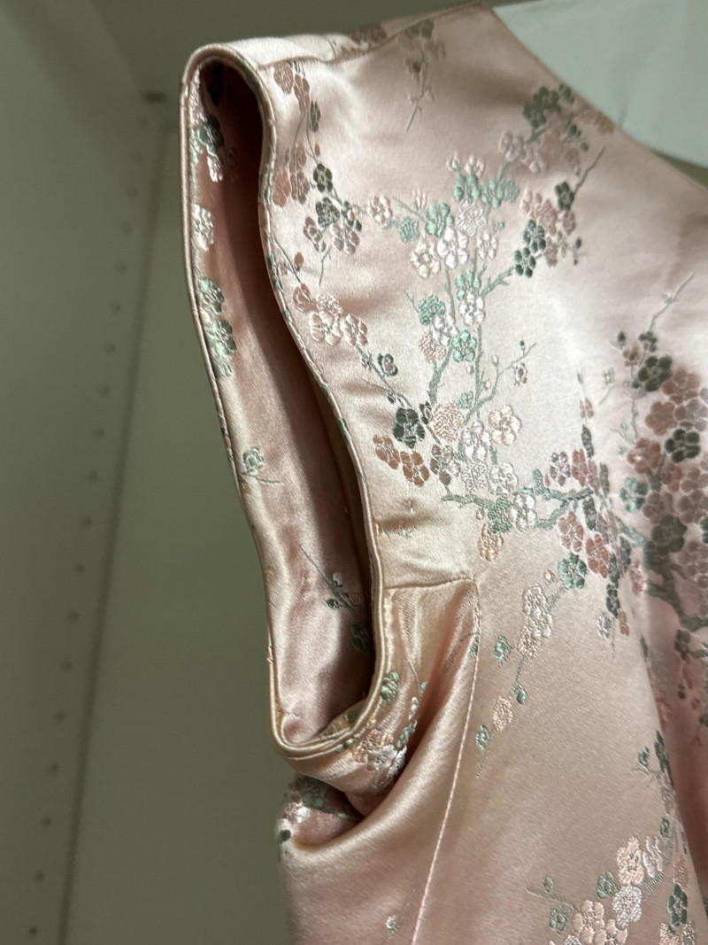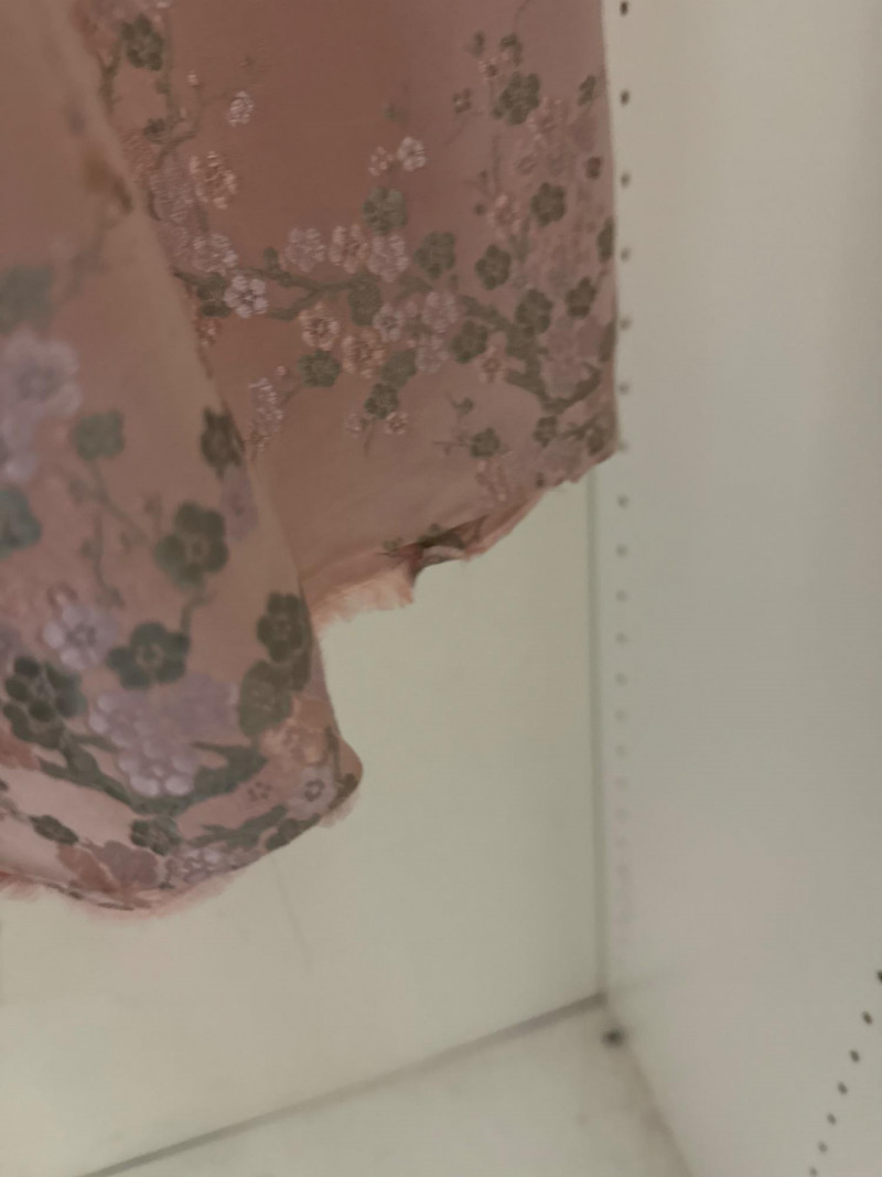 The second dress is a pink silk piece with a floral jacquard pattern, labeled