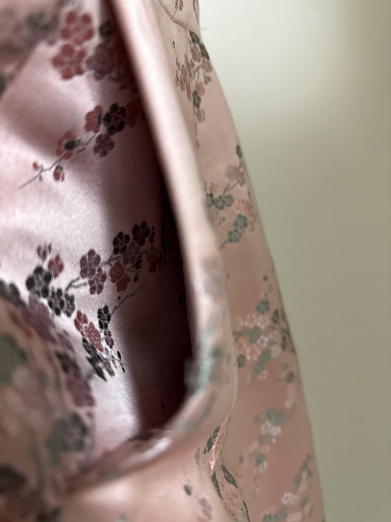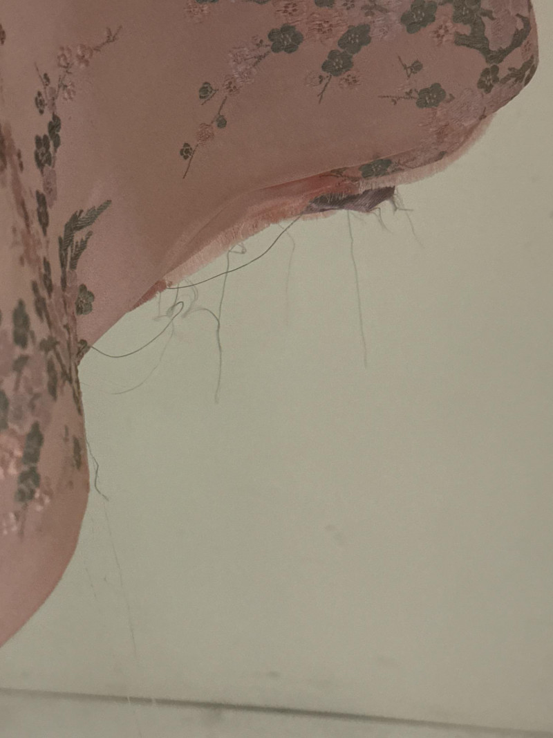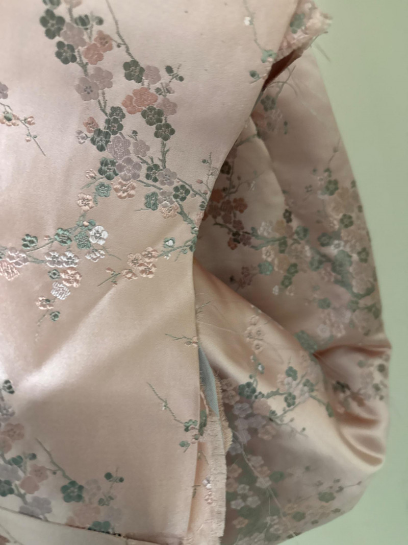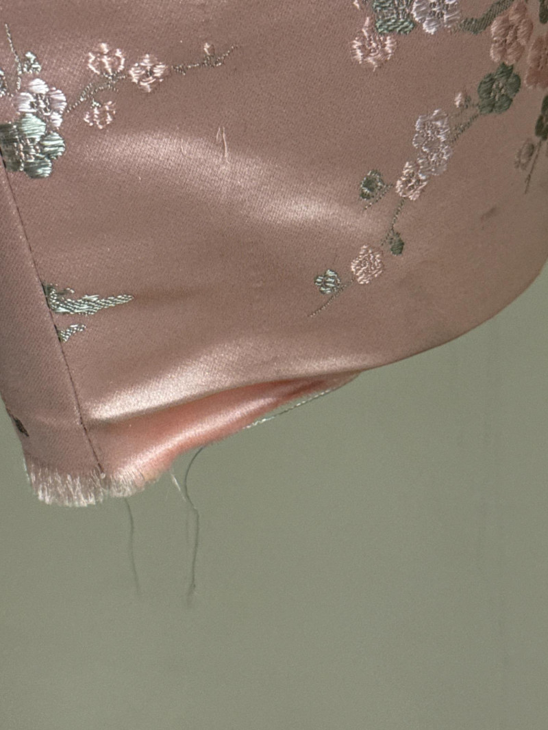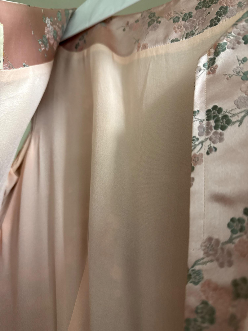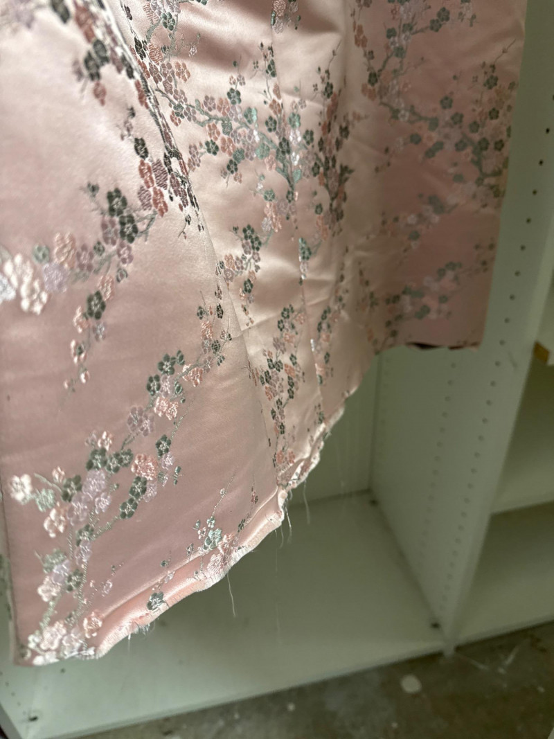 The second dress is a pink silk piece with a floral jacquard pattern, labeled
