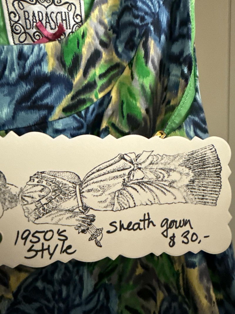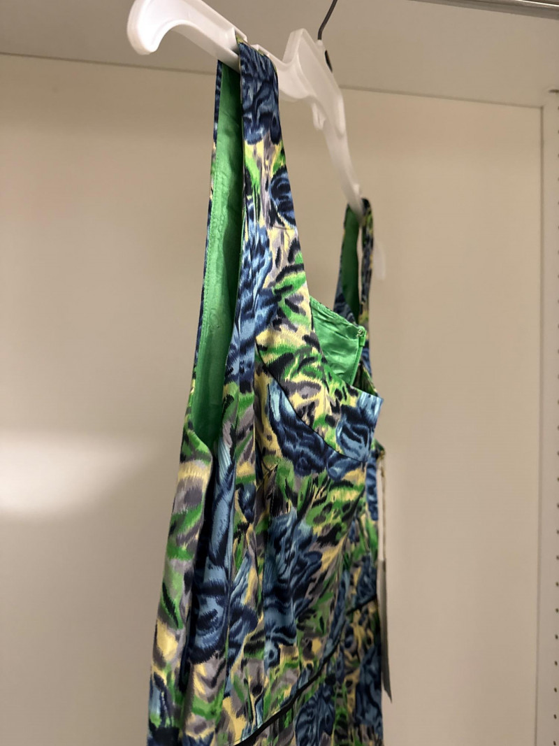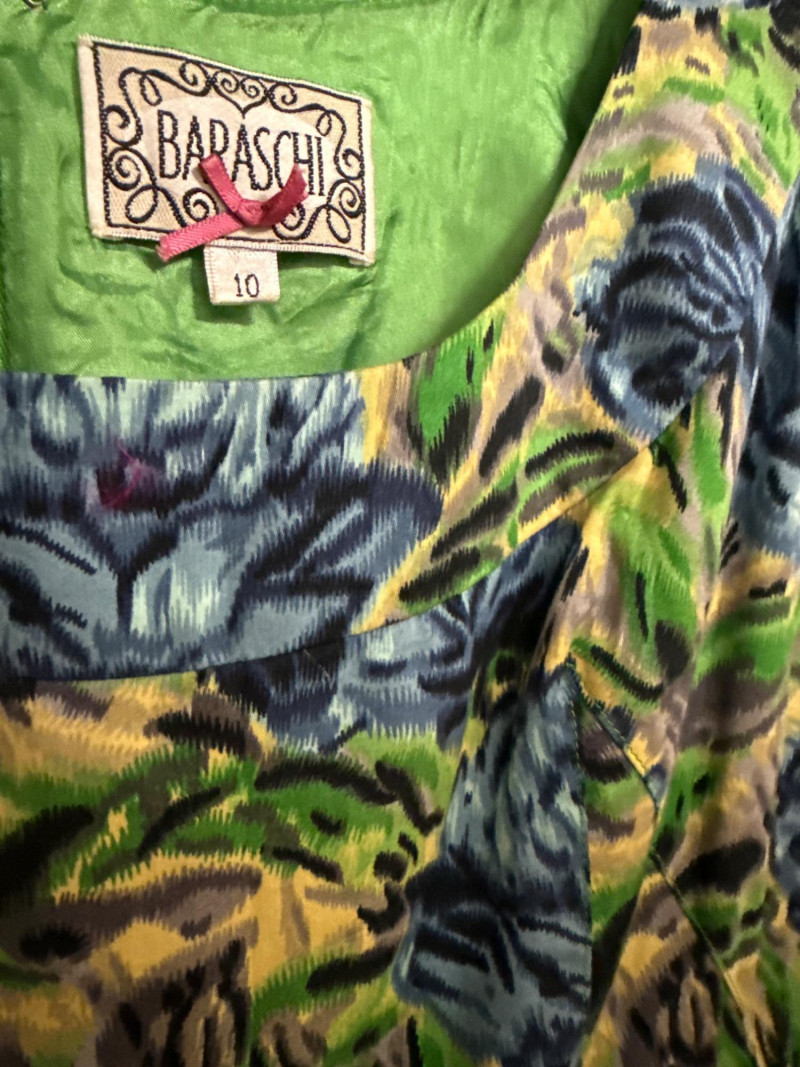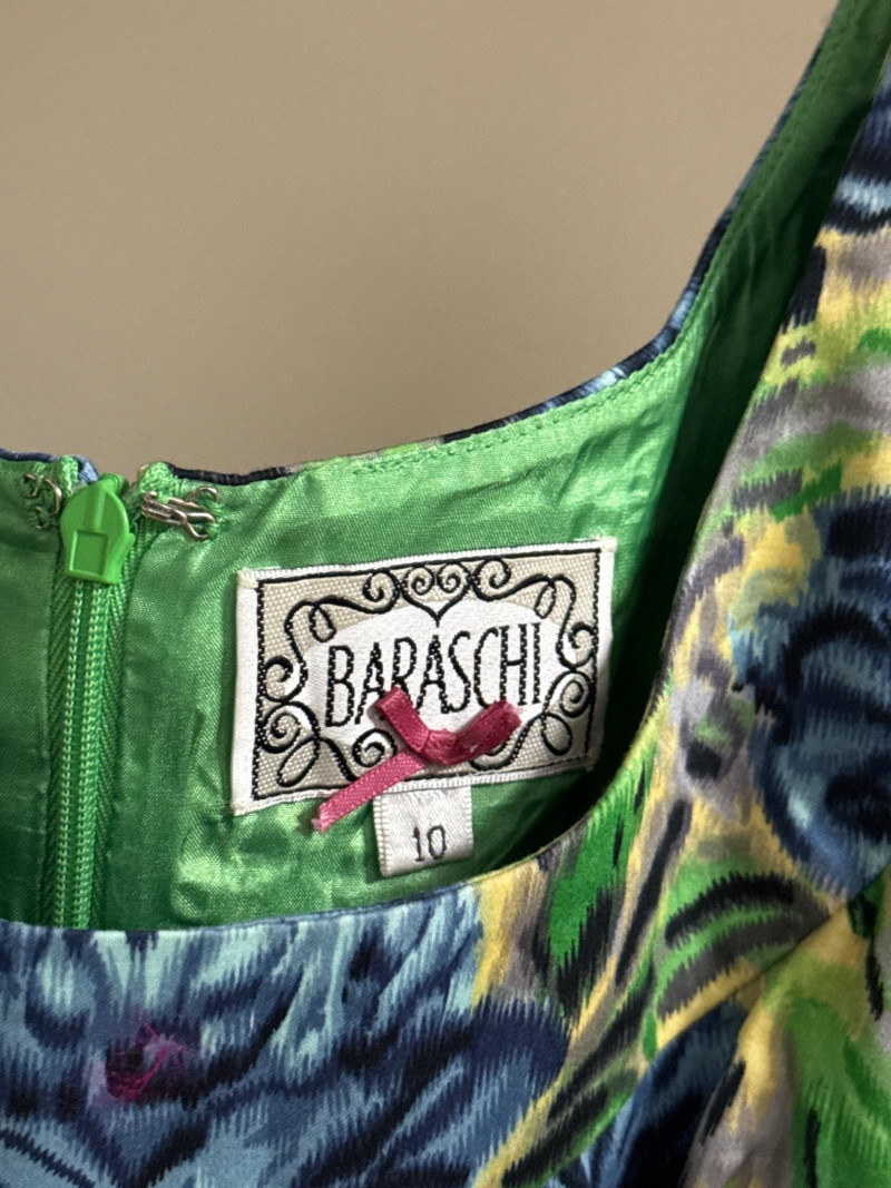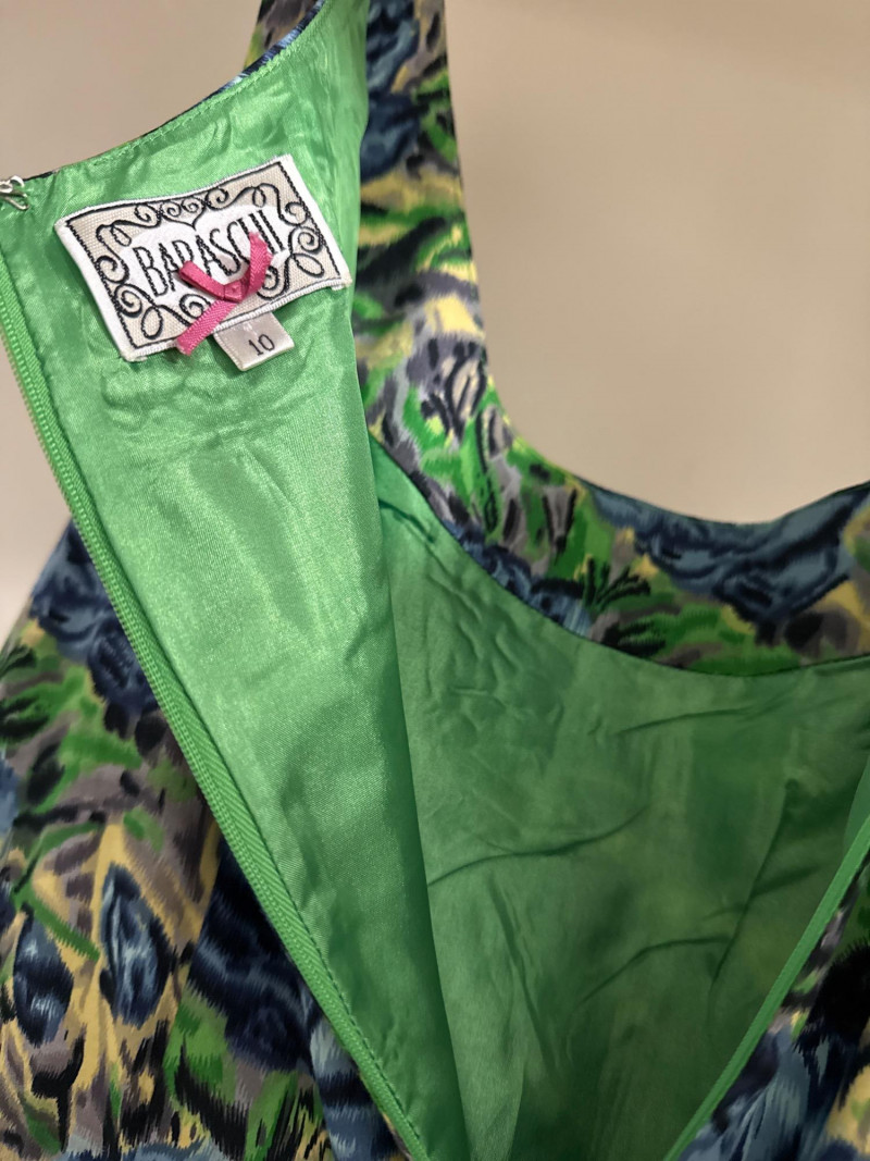 dress is a vibrant green and blue printed sheath gown by Baraschi, designed in