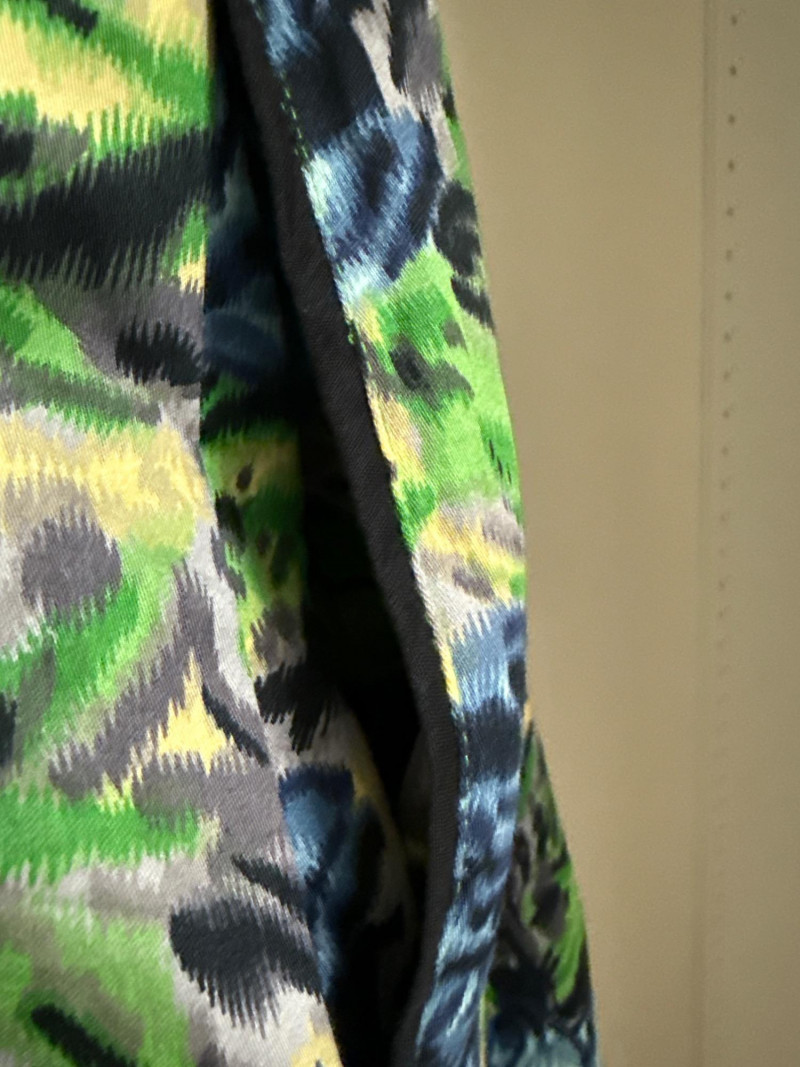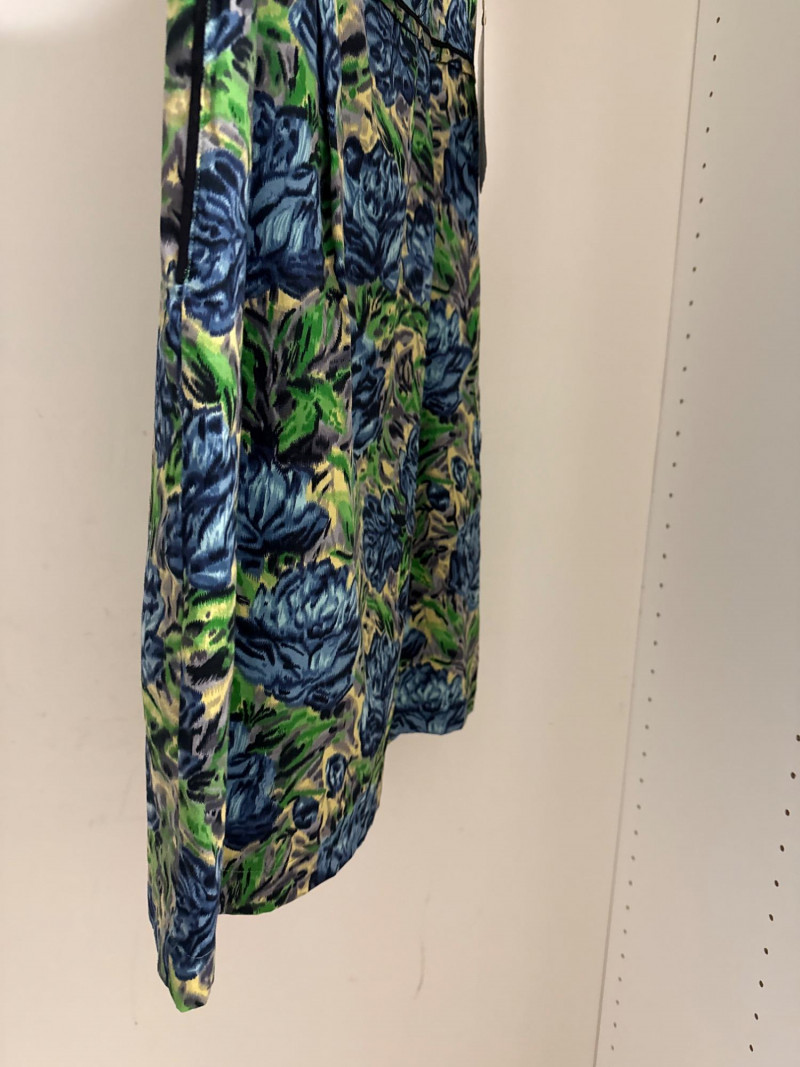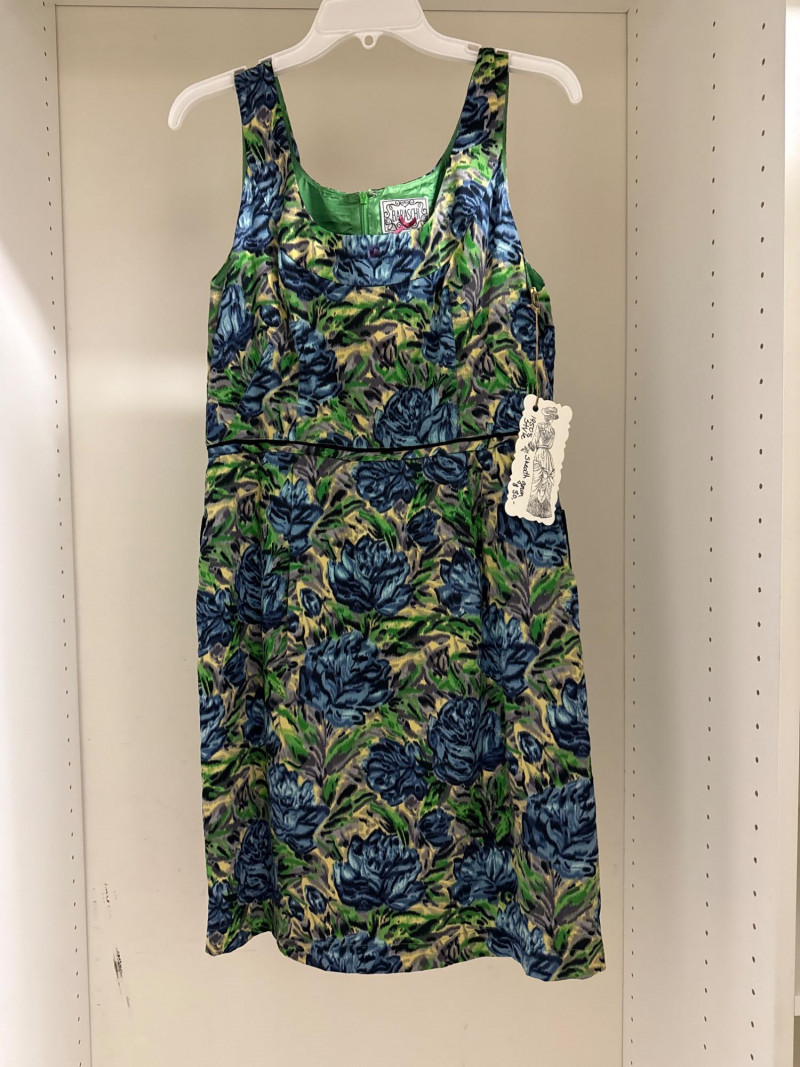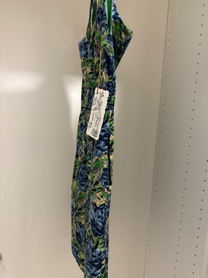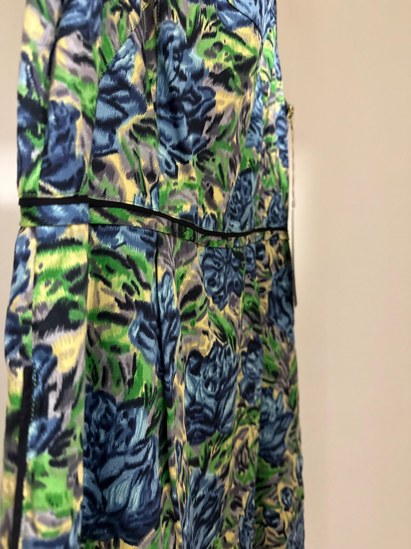 dress is a vibrant green and blue printed sheath gown by Baraschi, designed in