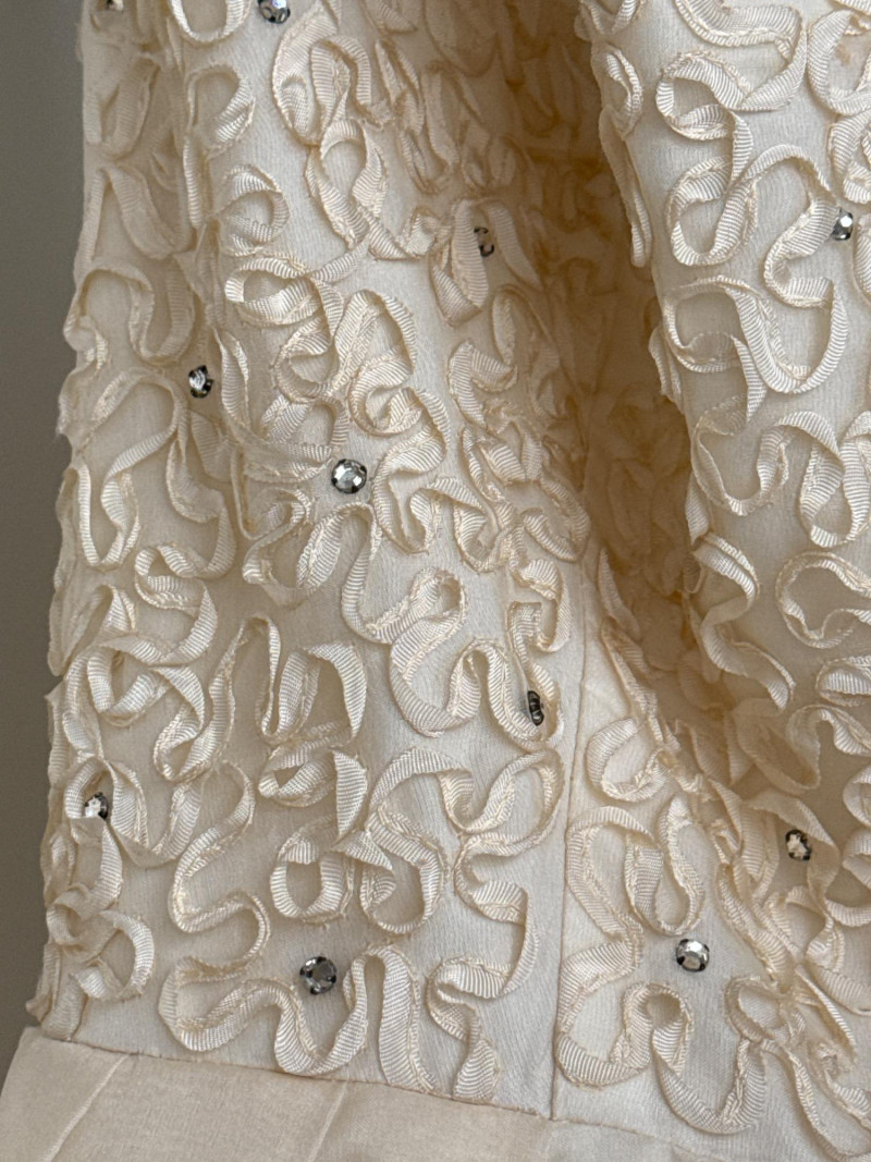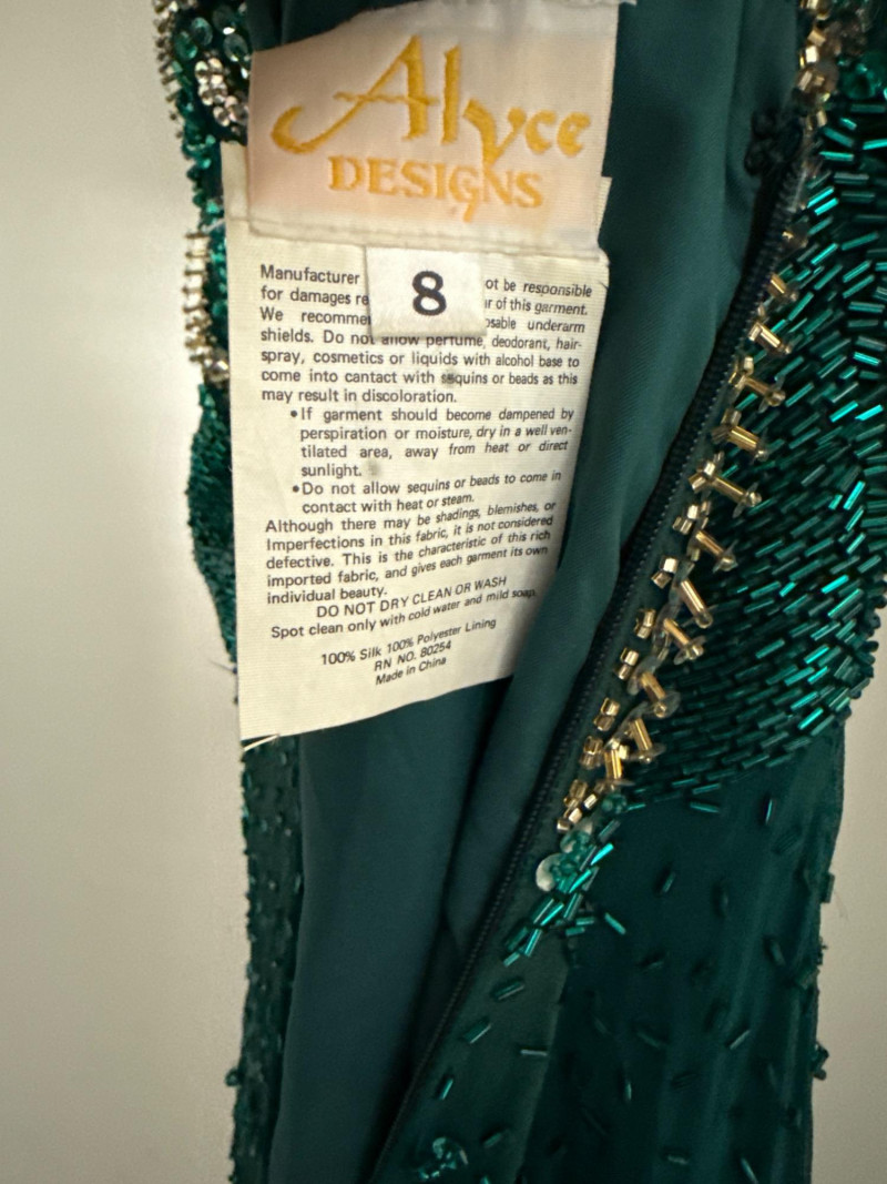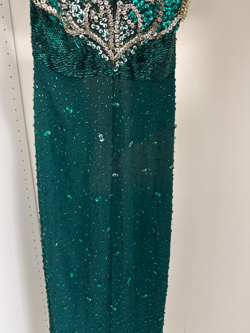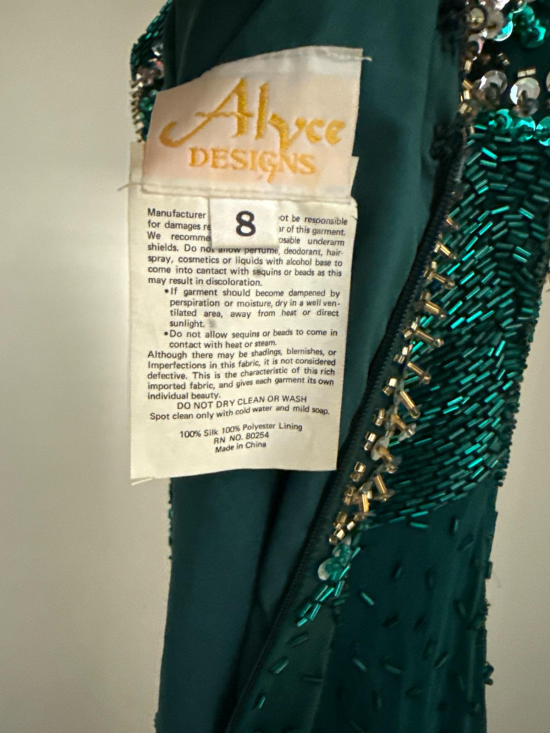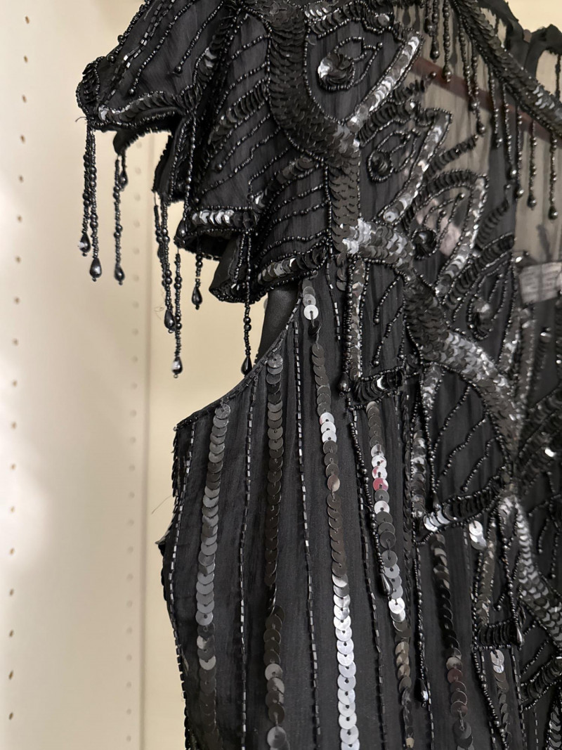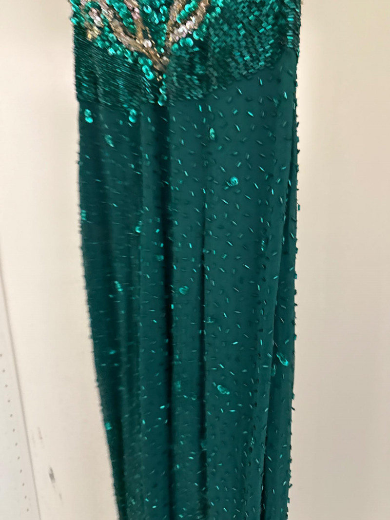 and sequins across the bodice and extending down the skirt. The original label