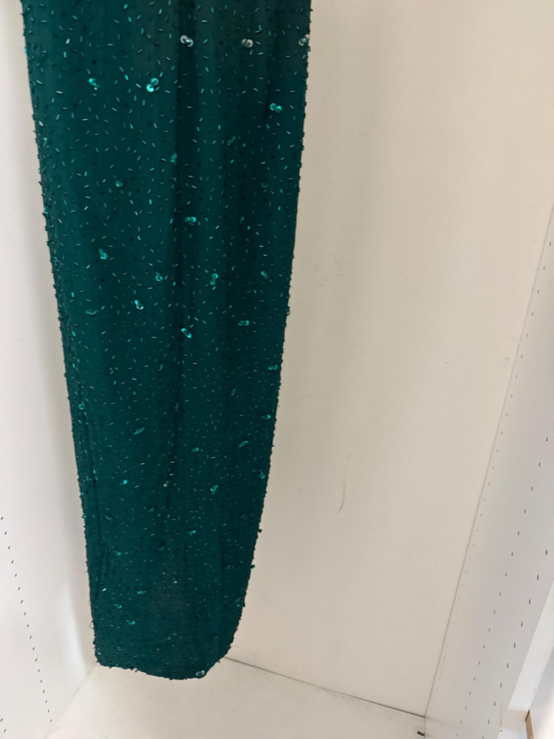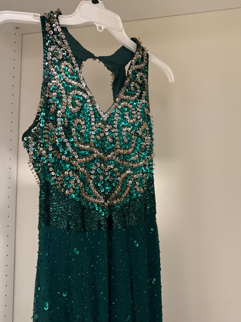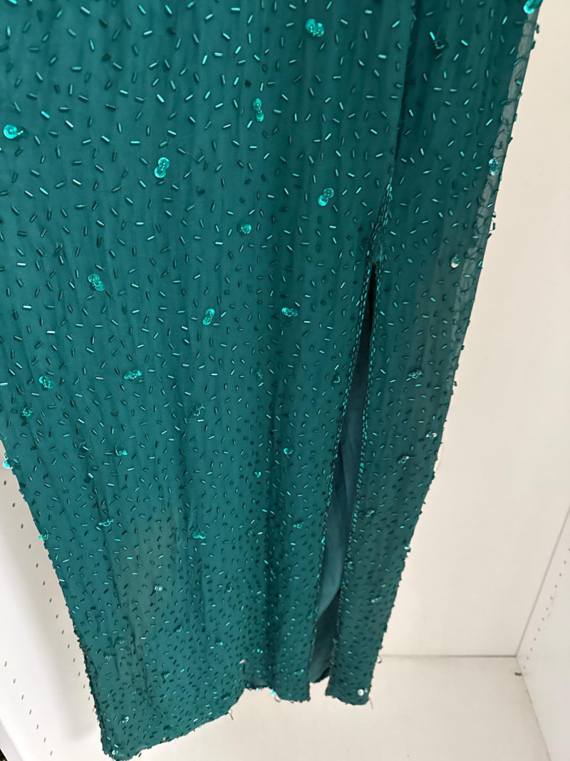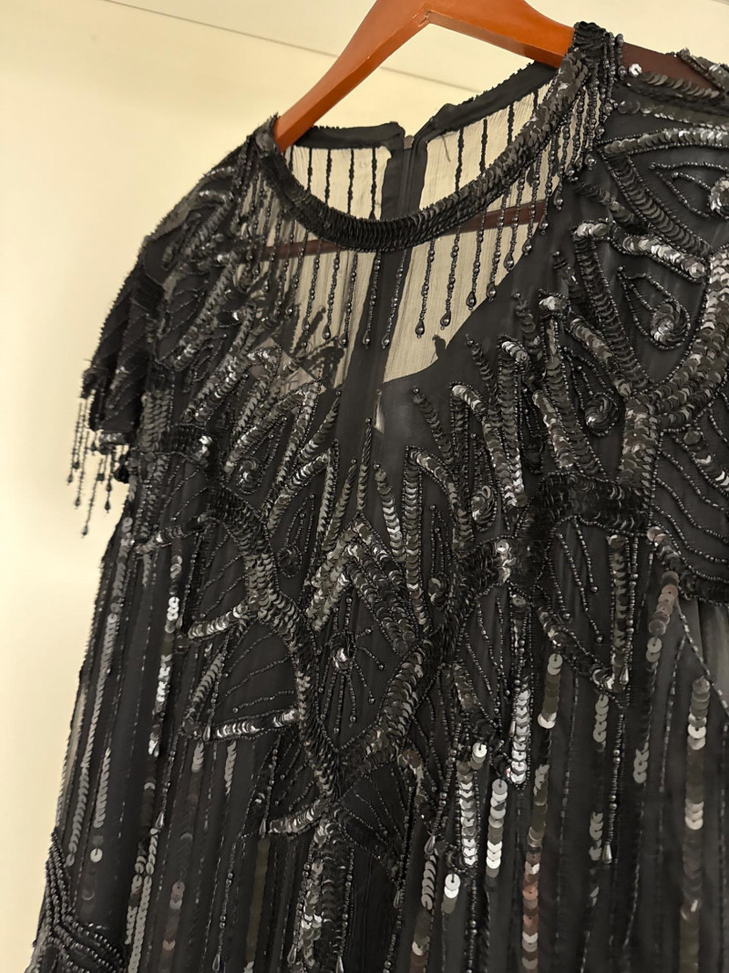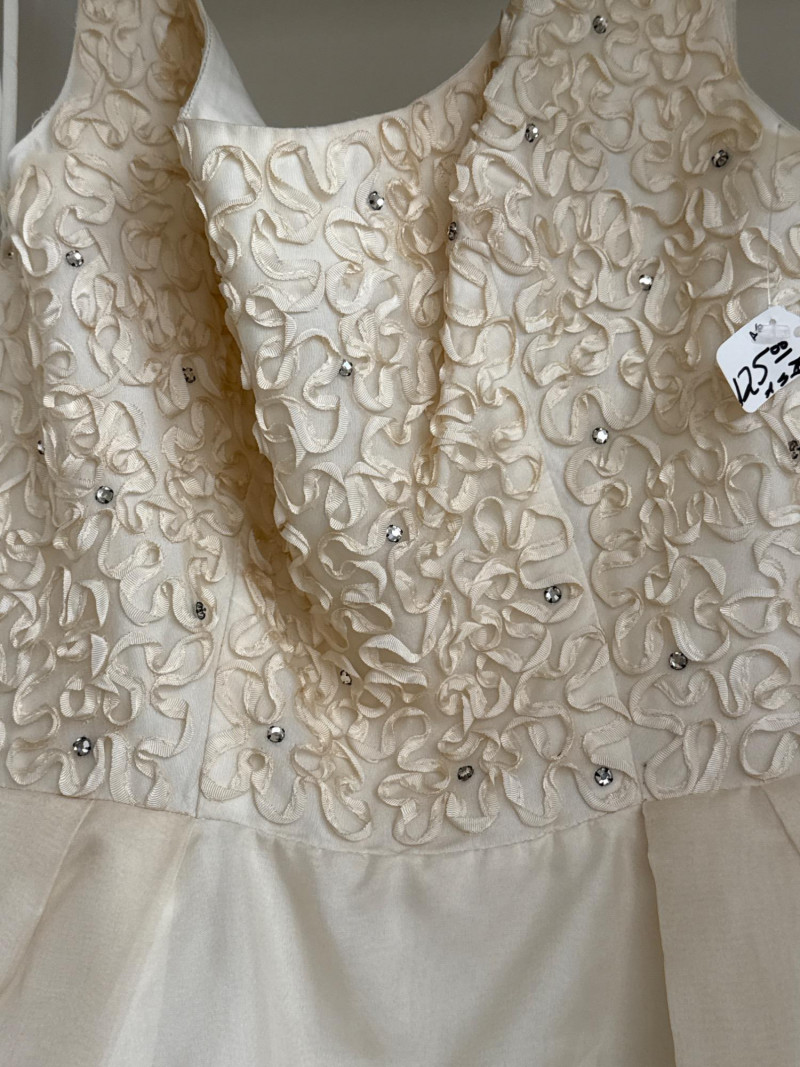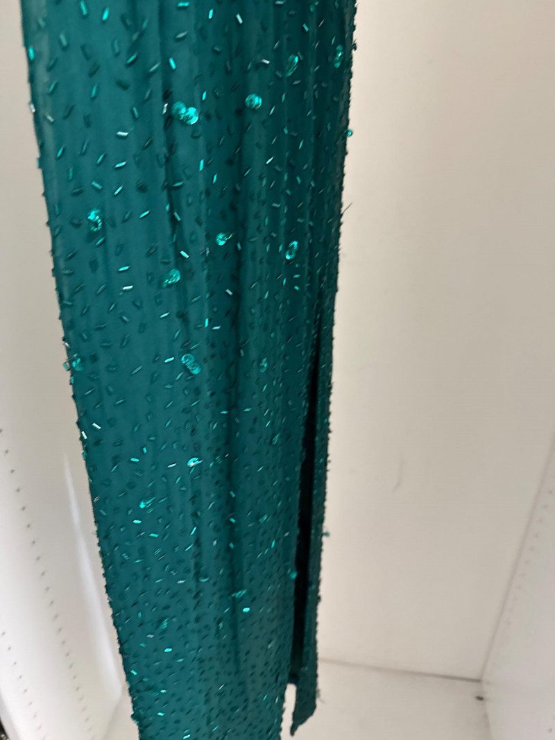 and sequins across the bodice and extending down the skirt. The original label