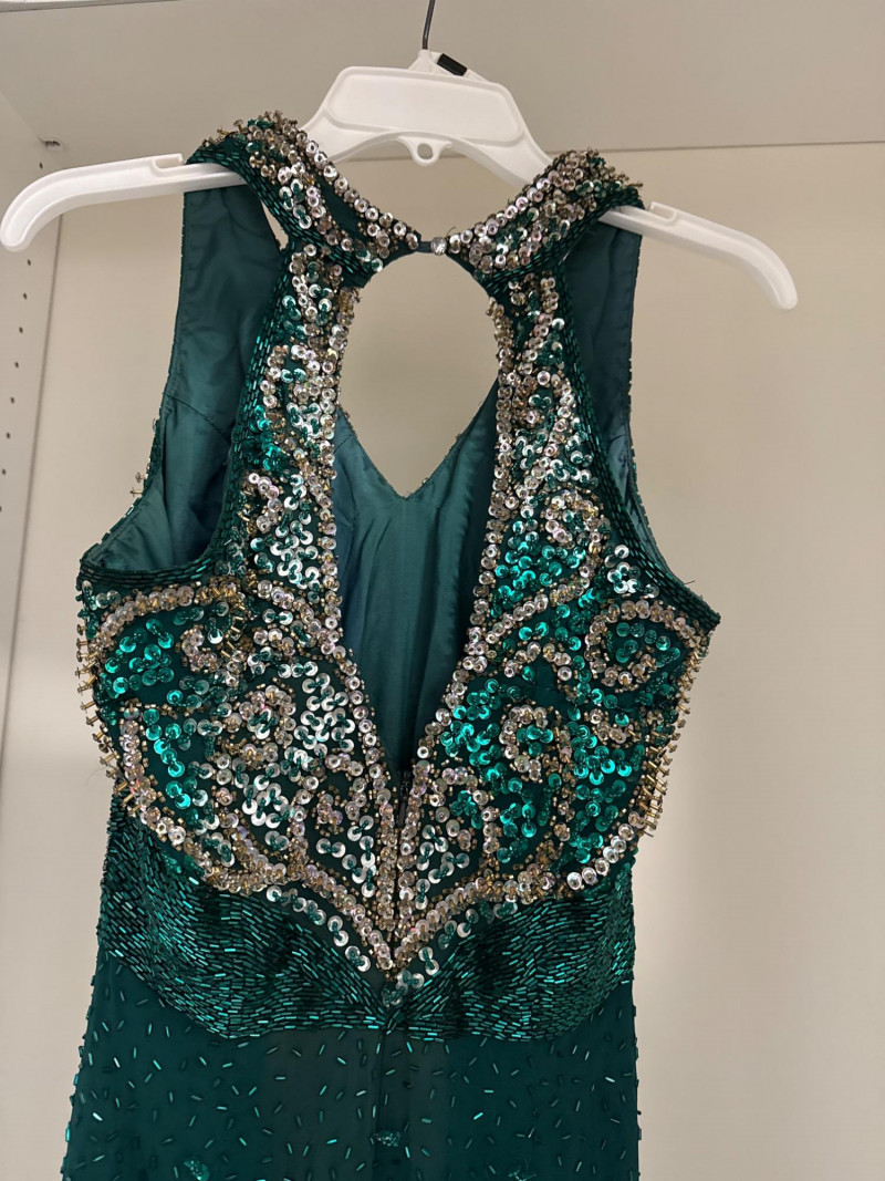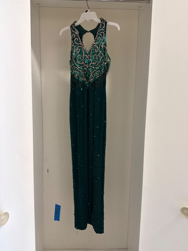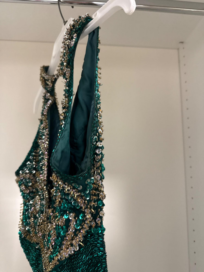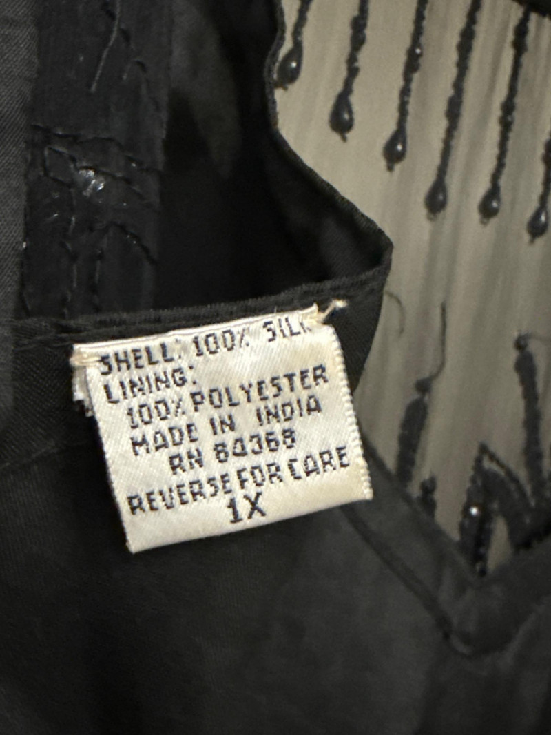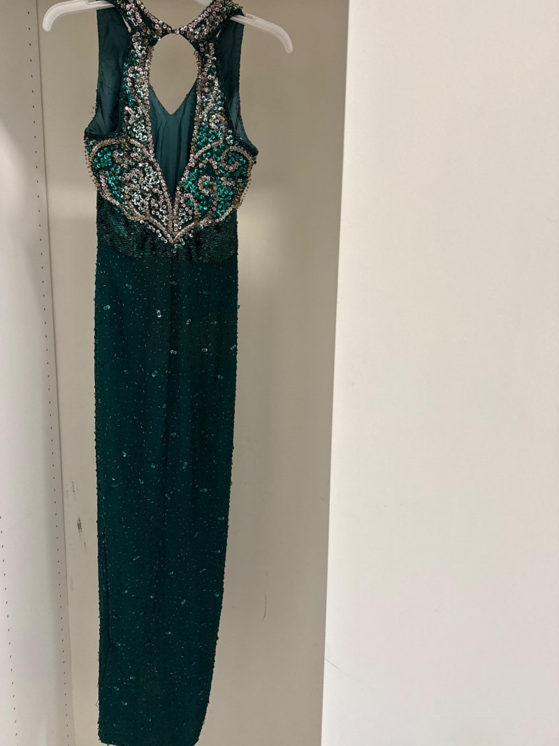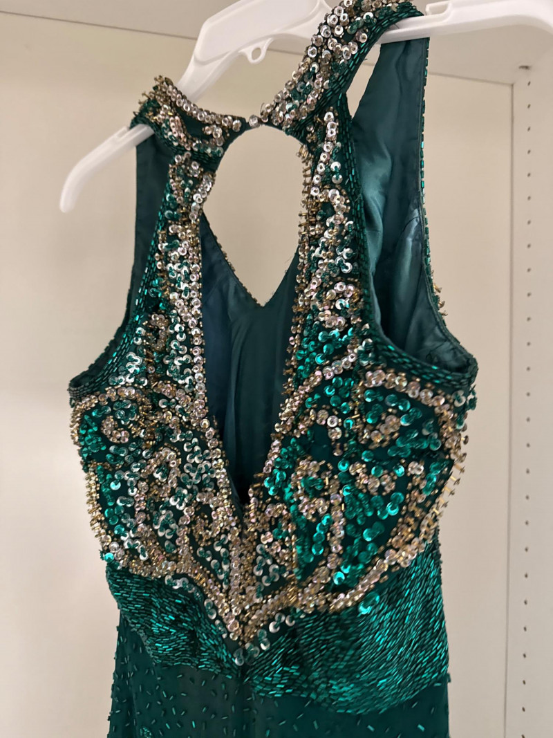 and sequins across the bodice and extending down the skirt. The original label