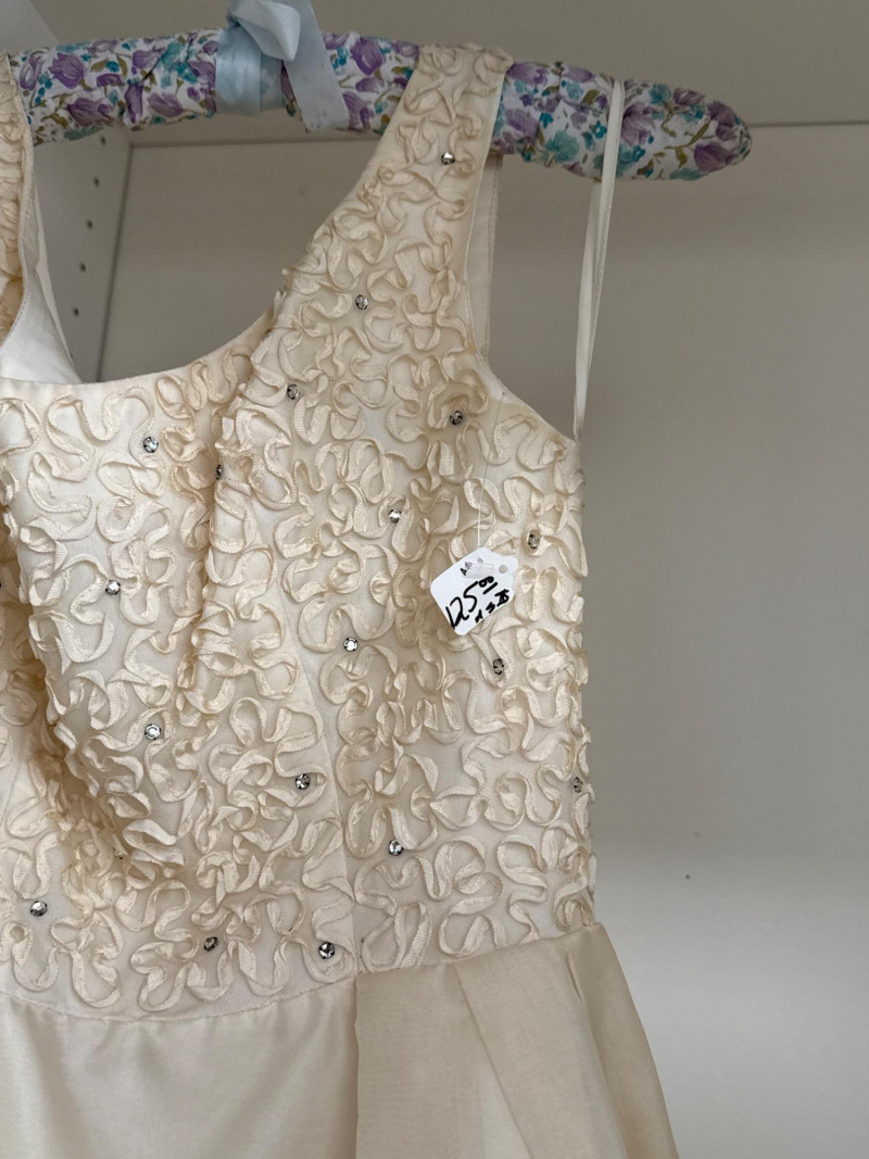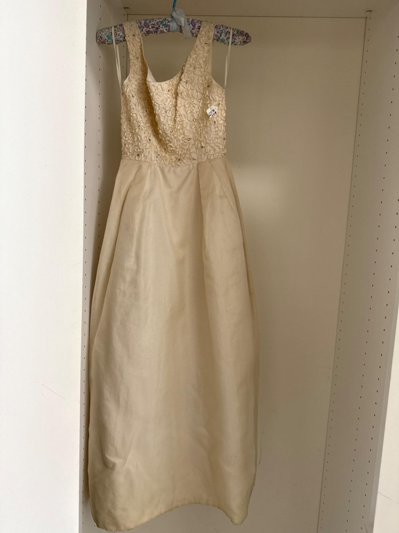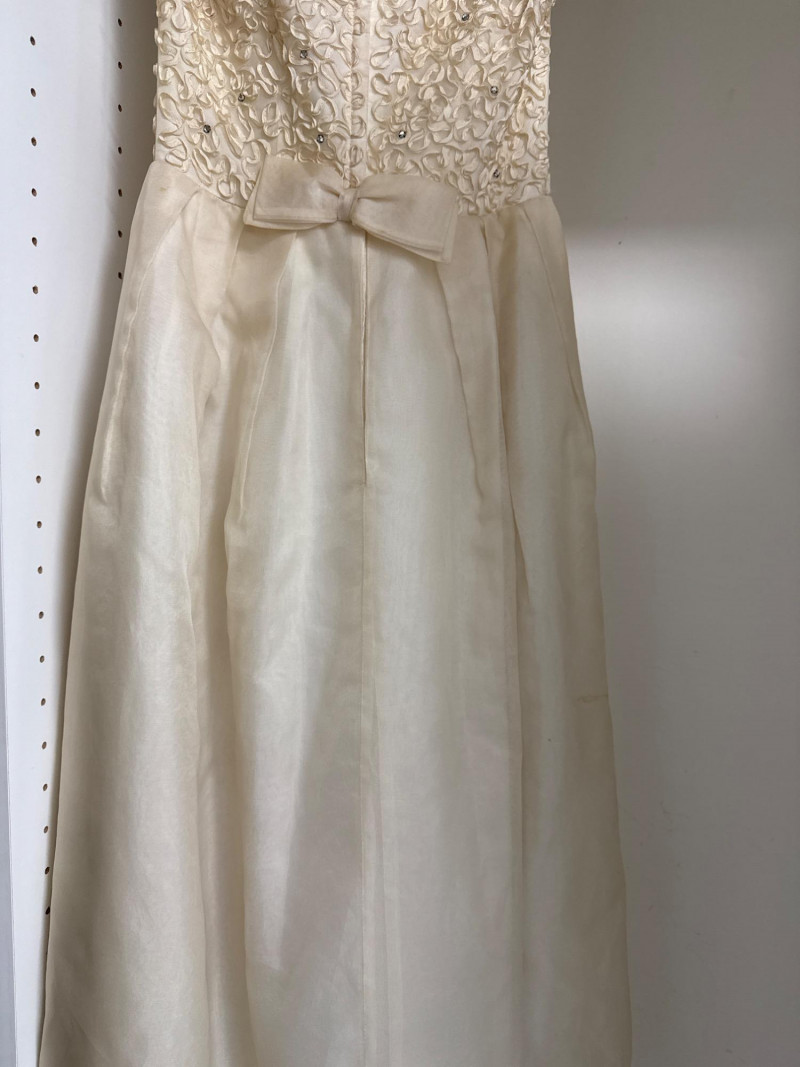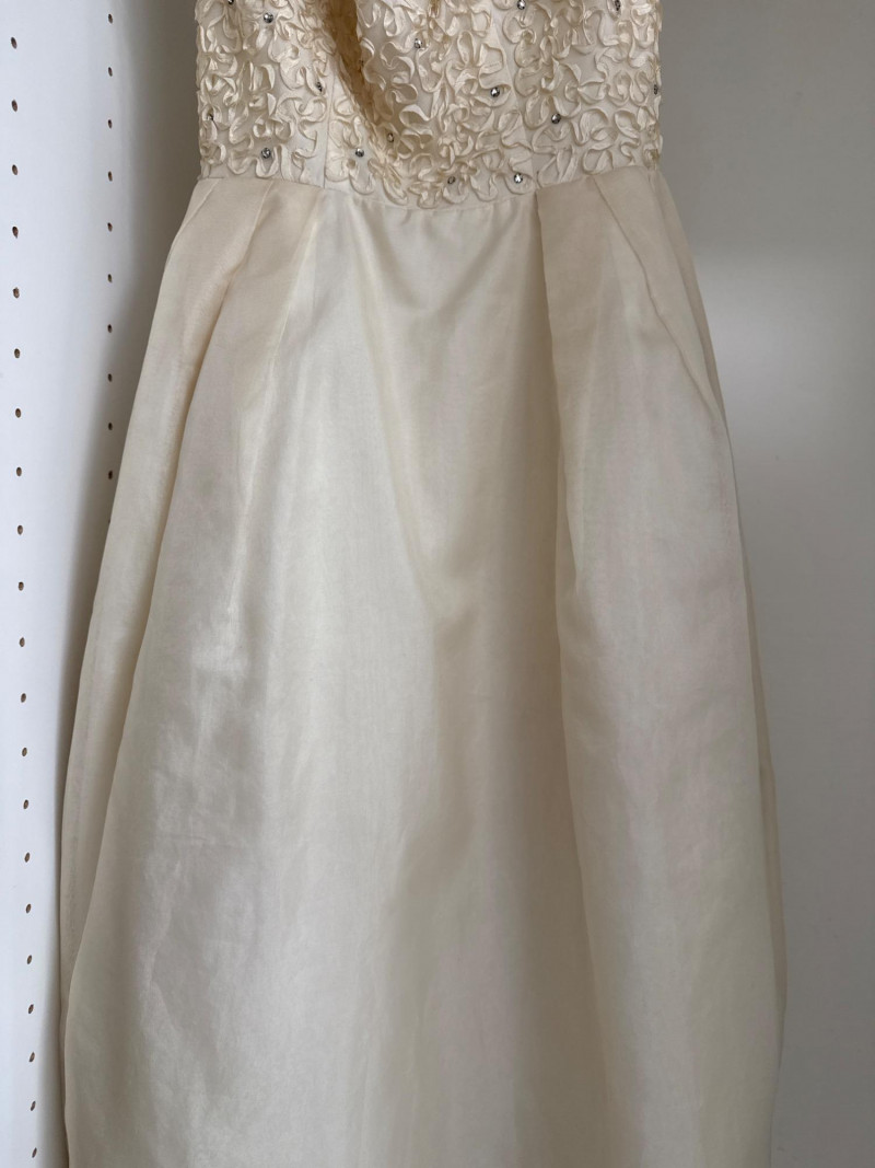 an ivory bridal-style gown with a fitted bodice and full skirt, adorned with
