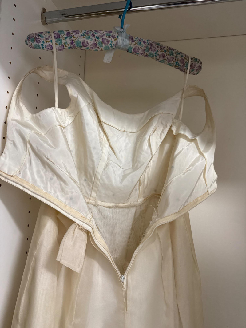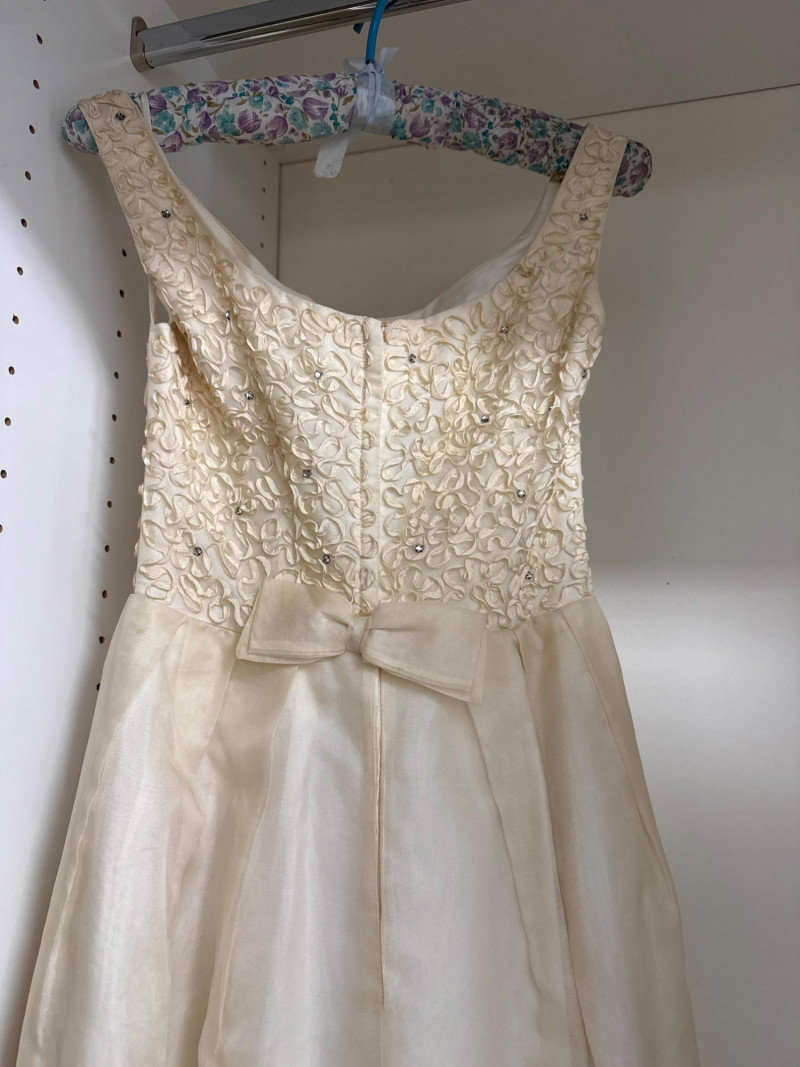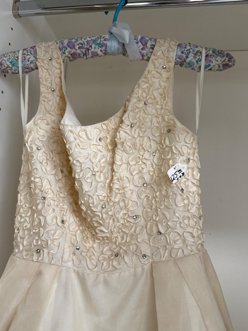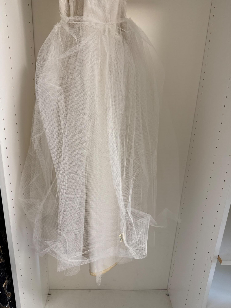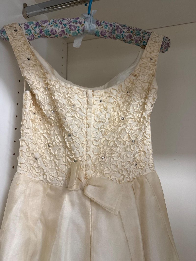 an ivory bridal-style gown with a fitted bodice and full skirt, adorned with
