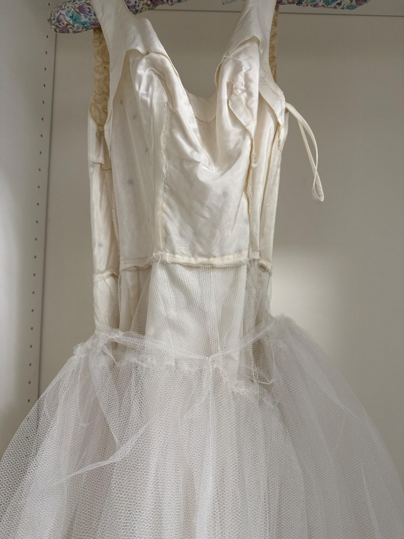 collectible examples of formal and bridal wear from notable fashion periods. Materials made of: Silk, Polyester, Tulle, Lace Category: Clothing & Accessories > Vintage Dresses > Mixed Lot Measurements: White Dress: Length 49 1/4" x Width 11 1/4"