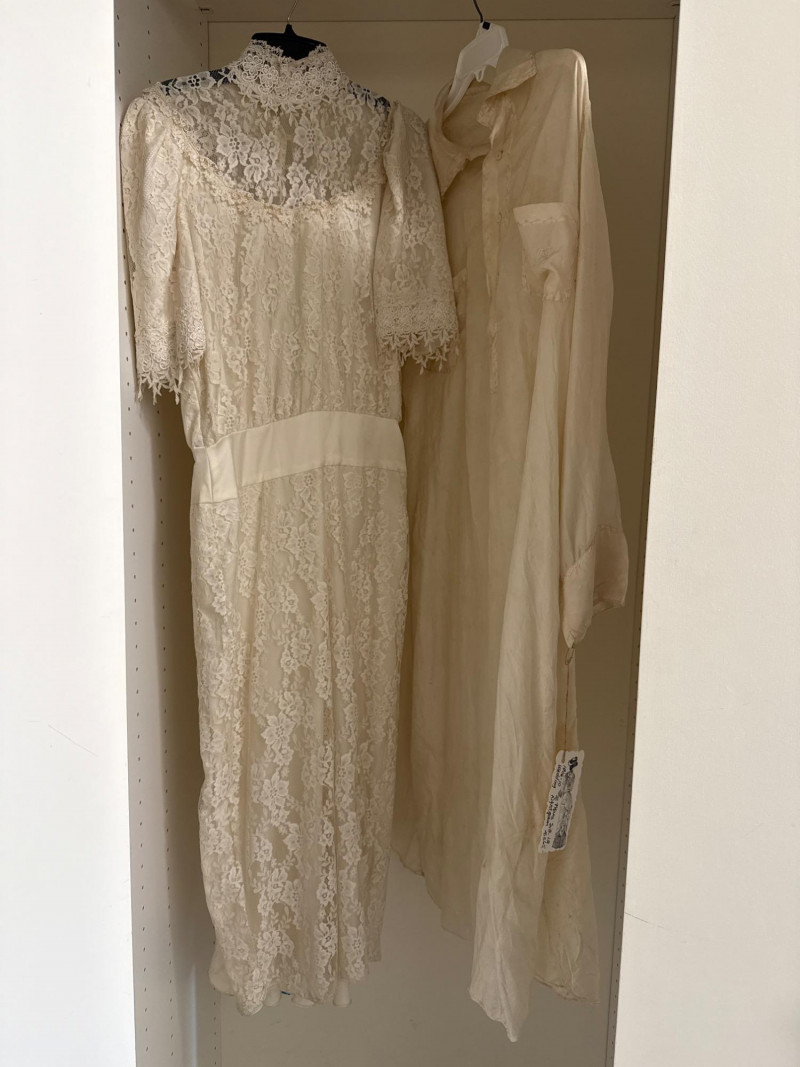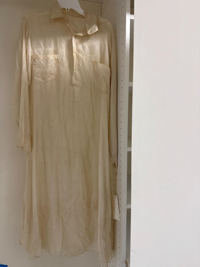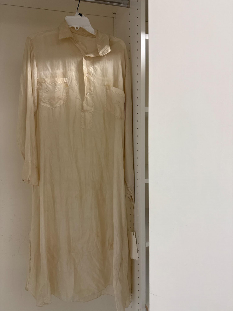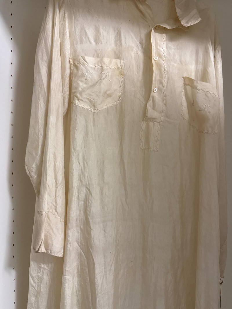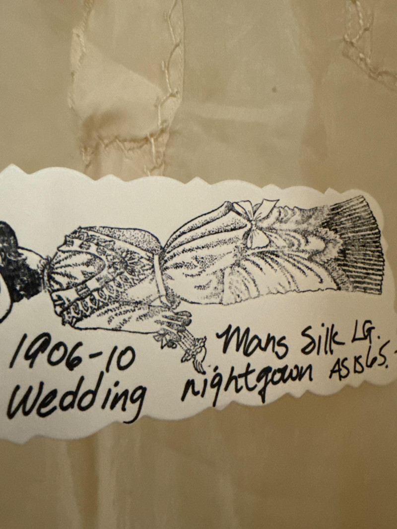 the Edwardian era (circa 1906–1910). The second piece is a men’s silk nightgown