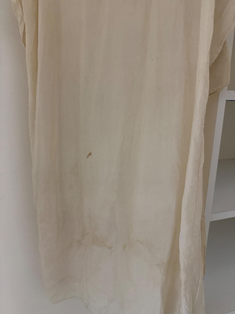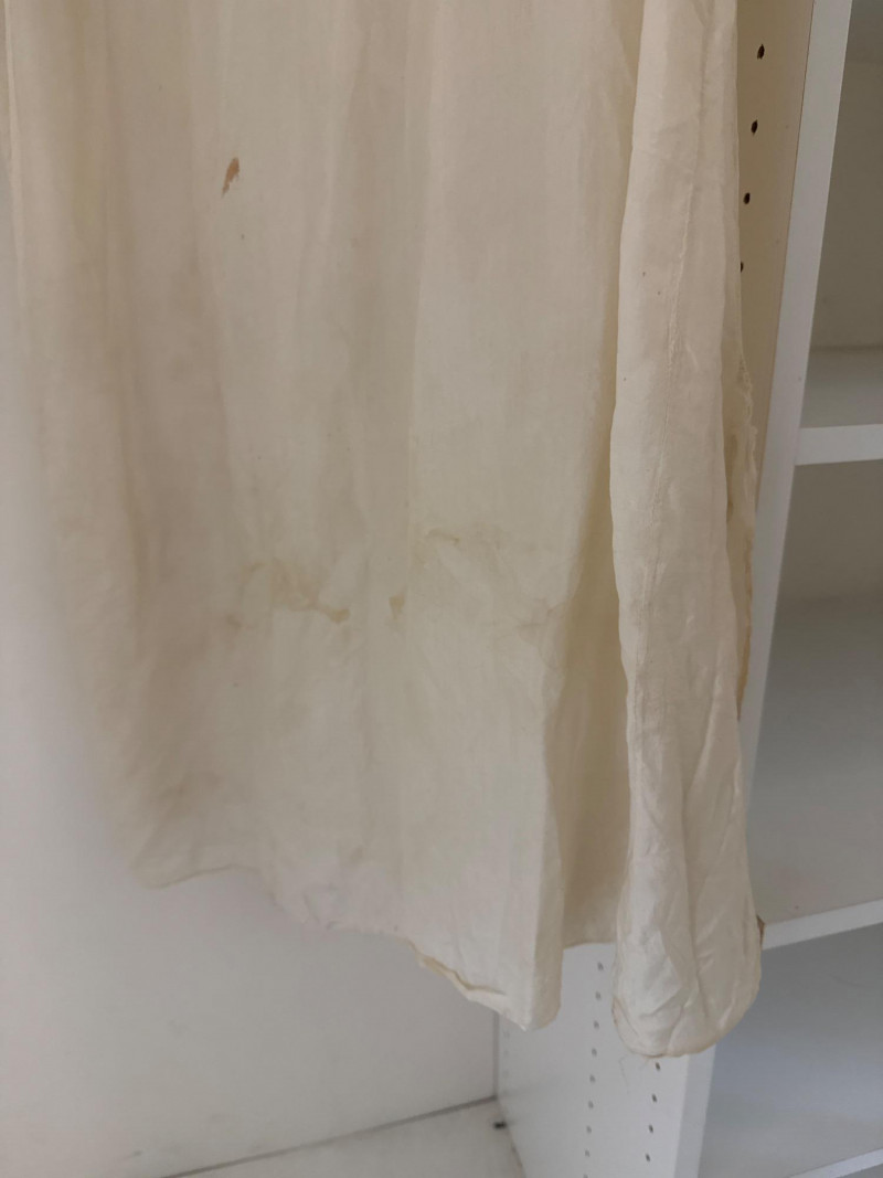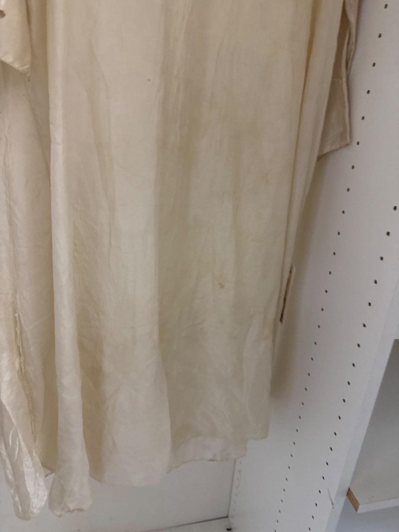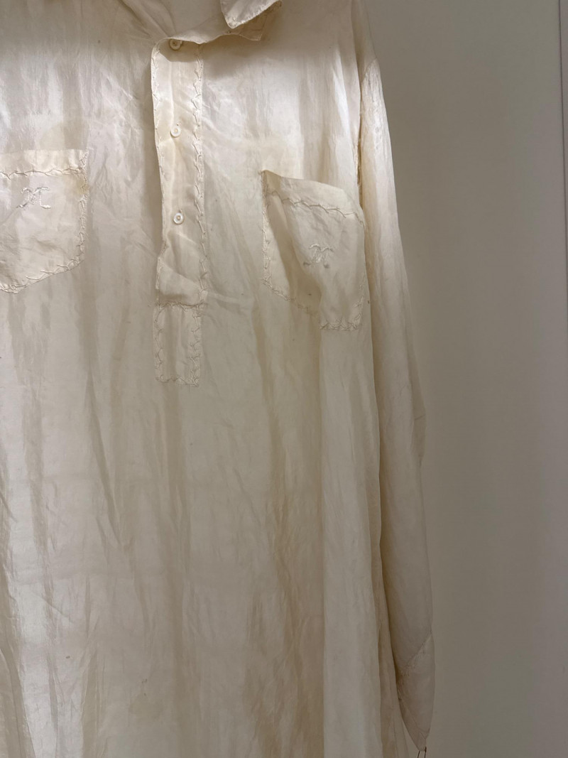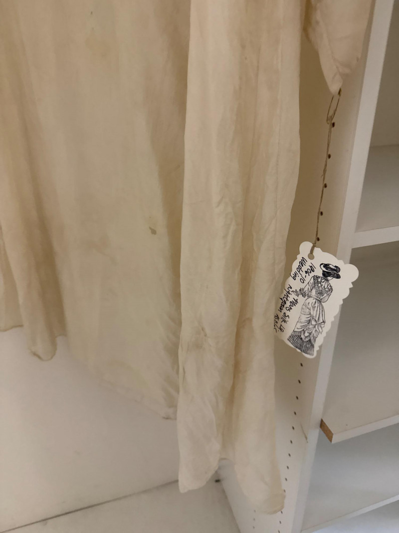 the Edwardian era (circa 1906–1910). The second piece is a men’s silk nightgown