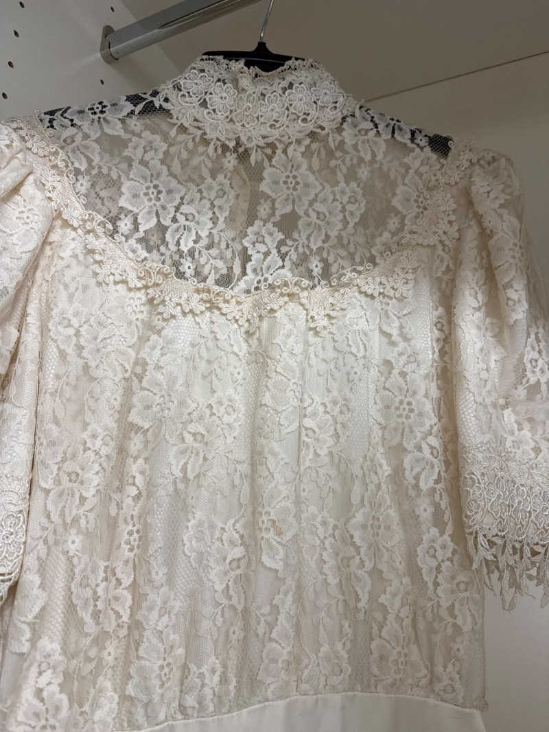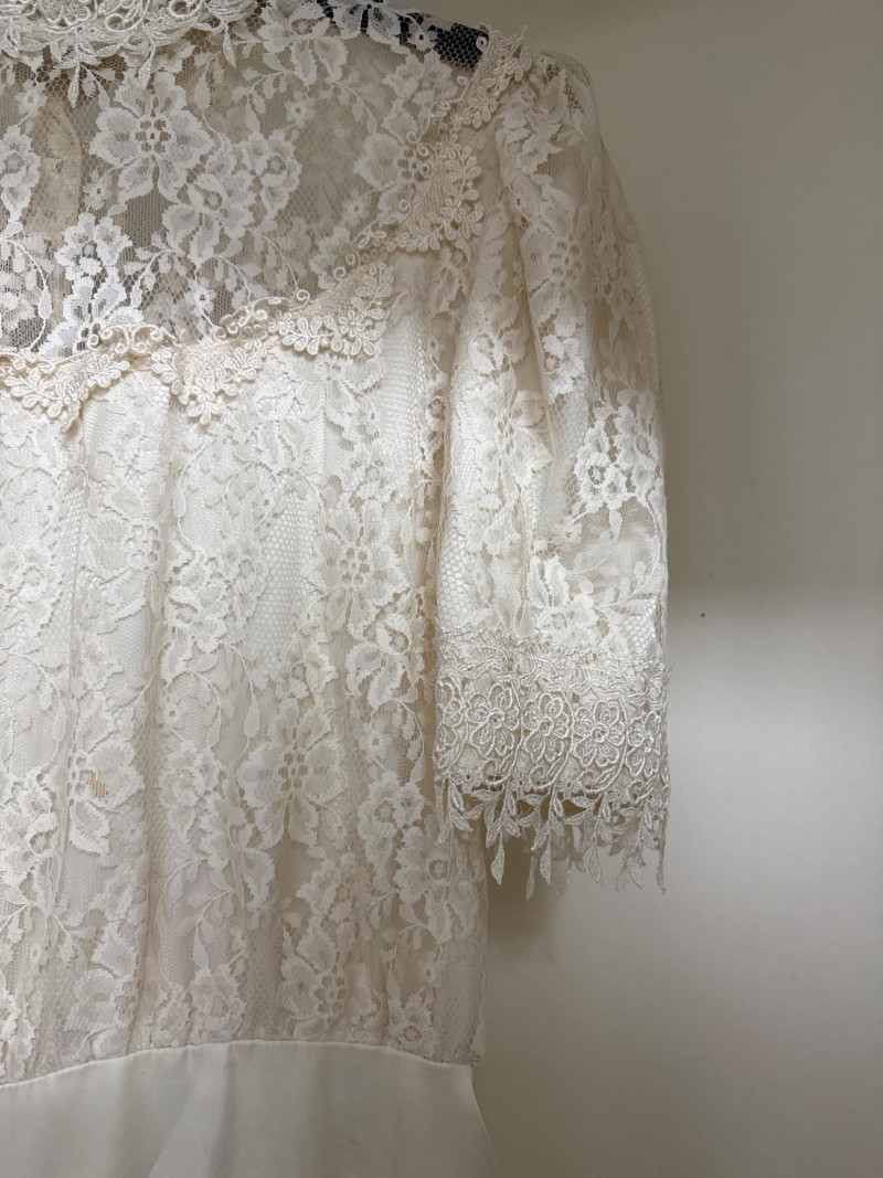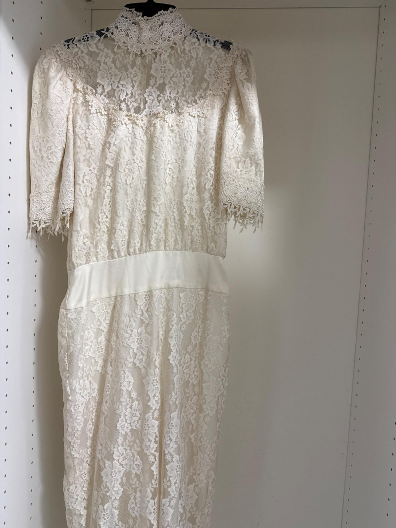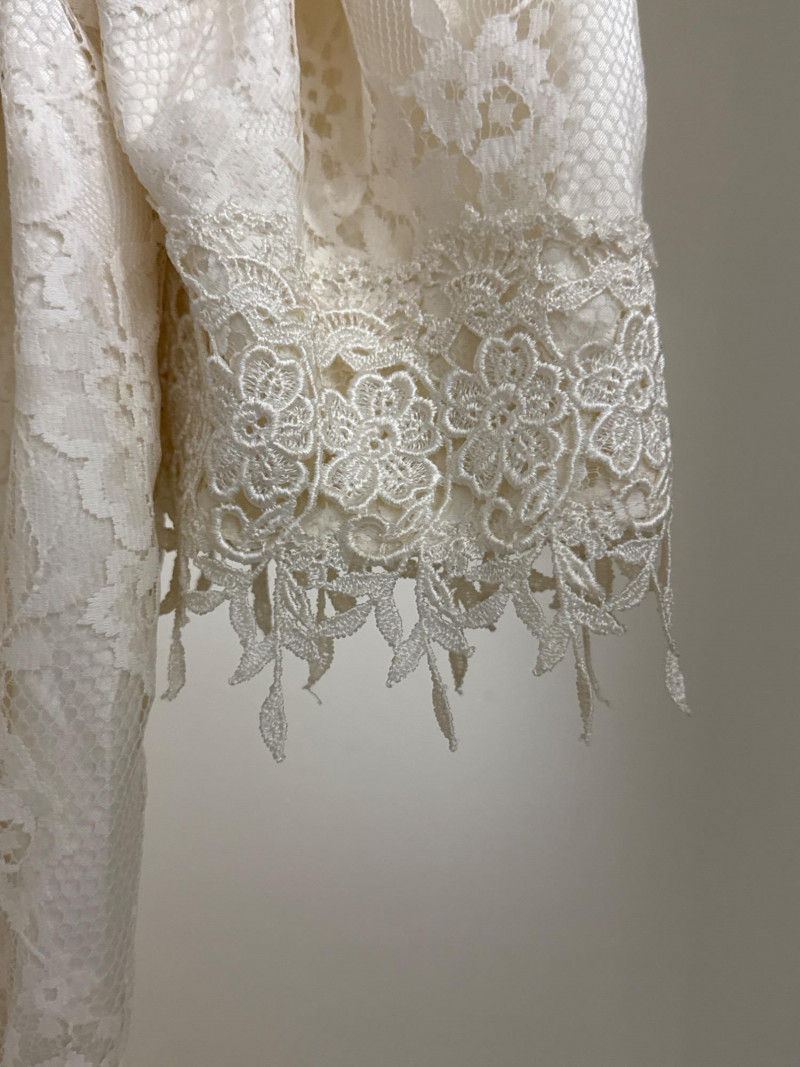 ivory lace over a satin base, featuring a high neckline, half sleeves with