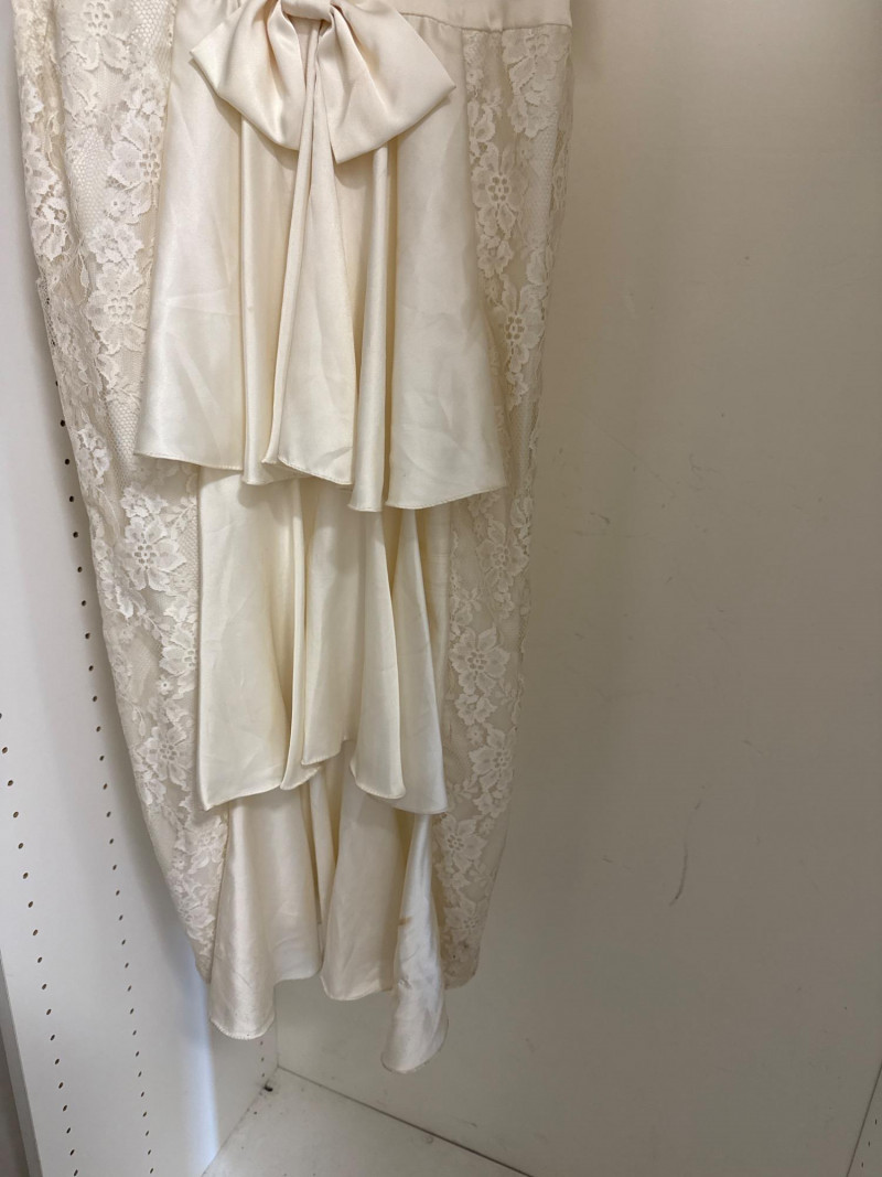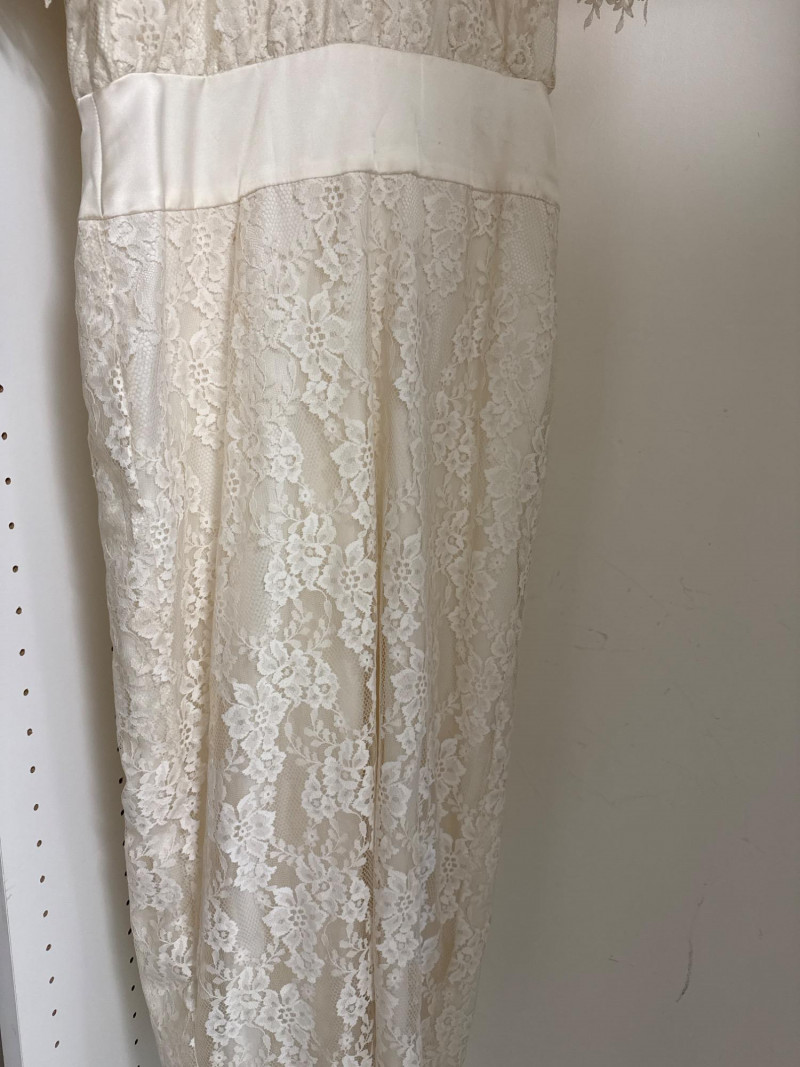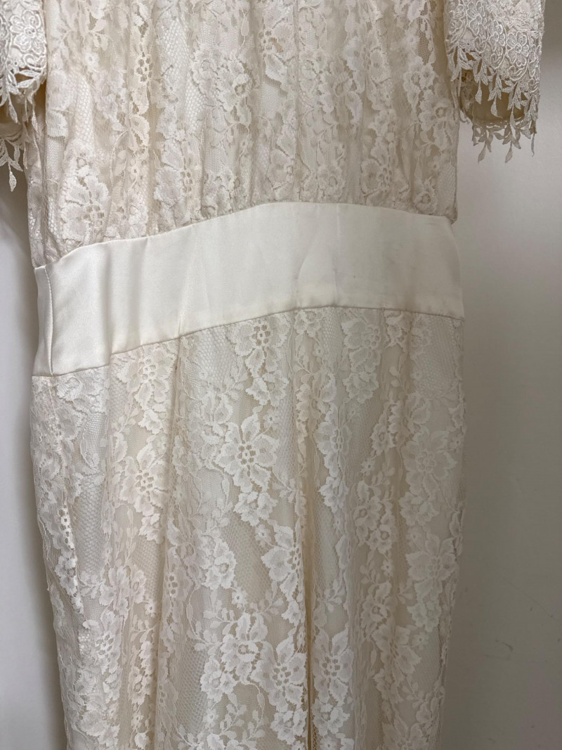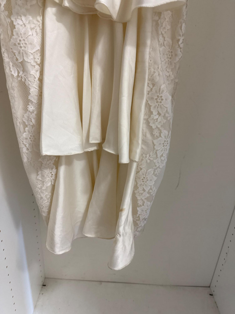 antique clothing. Materials made of: Lace, Satin, Silk Category: Collectibles > Antique Clothing > Wedding & Formal Wear Measurements: Wedding Dress: Length 50" x Width 13 1/4" x Sleeves' Length 14" All clothes is this entire auction needs to be cleaned