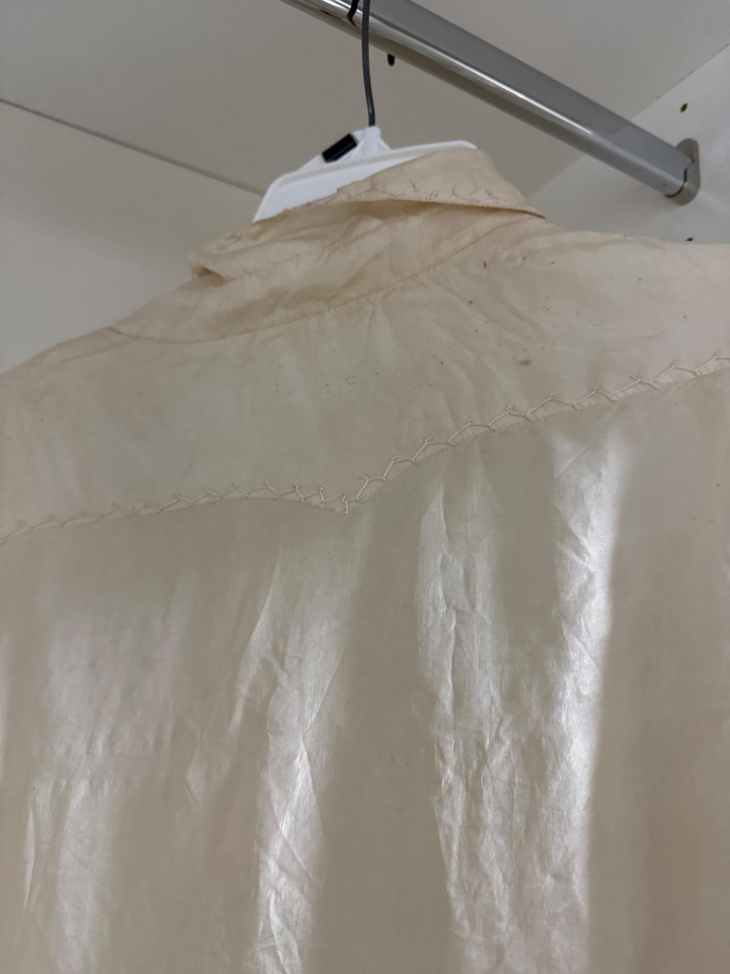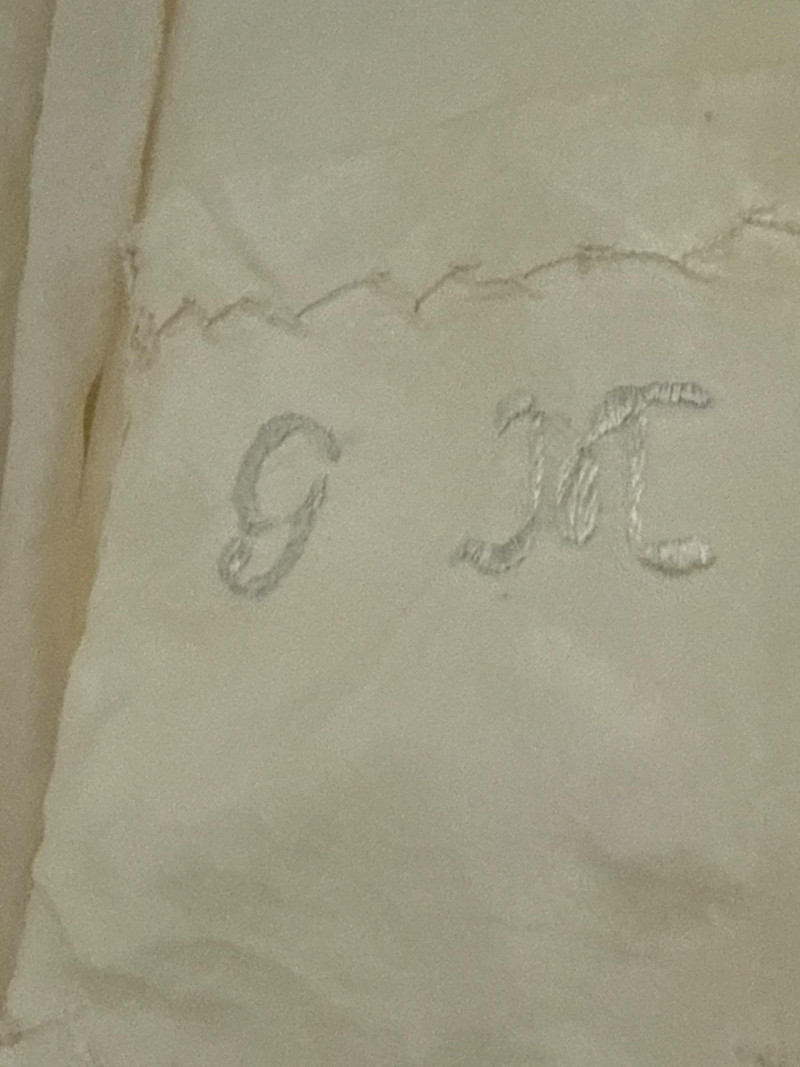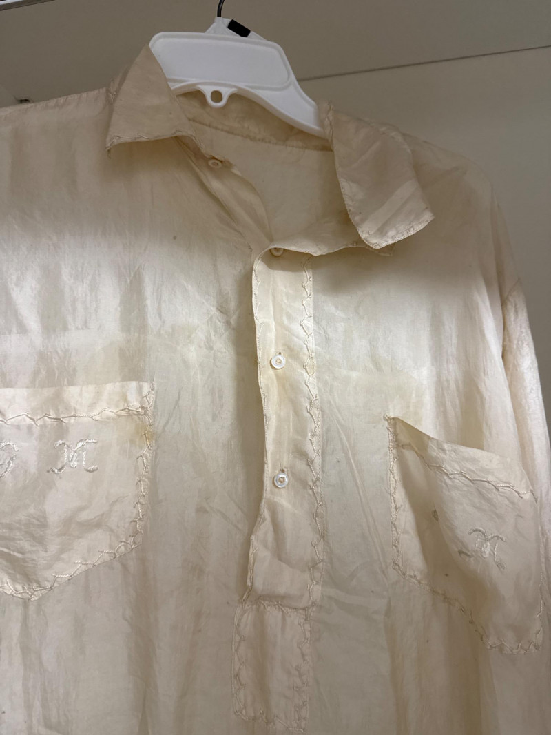 placket, two breast pockets, and hand-embroidered initials “G M” on the