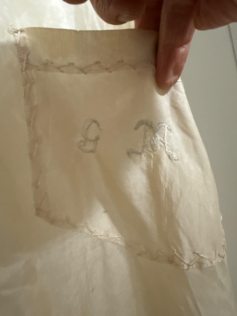 pockets. This garment represents early 20th-century luxury sleepwear, emphasizing