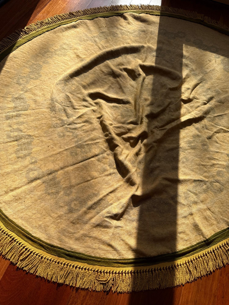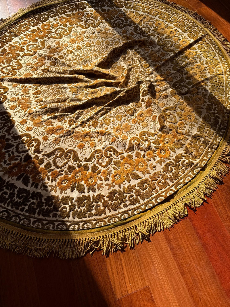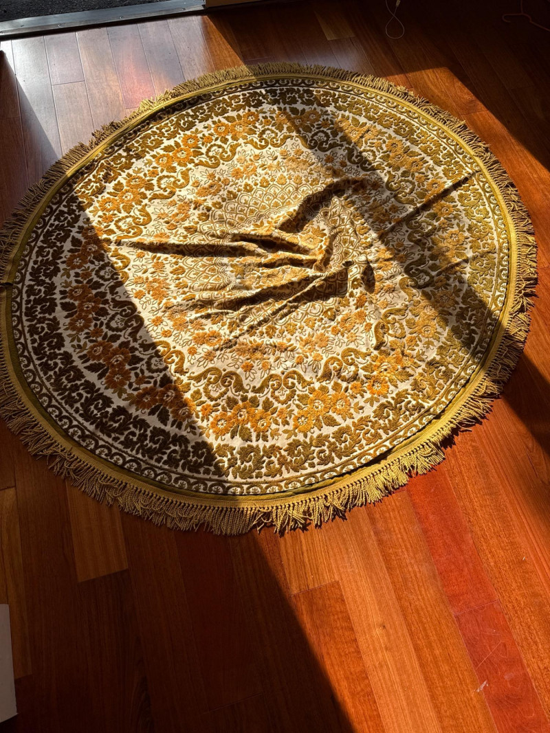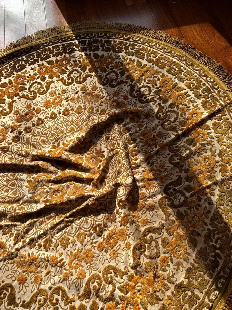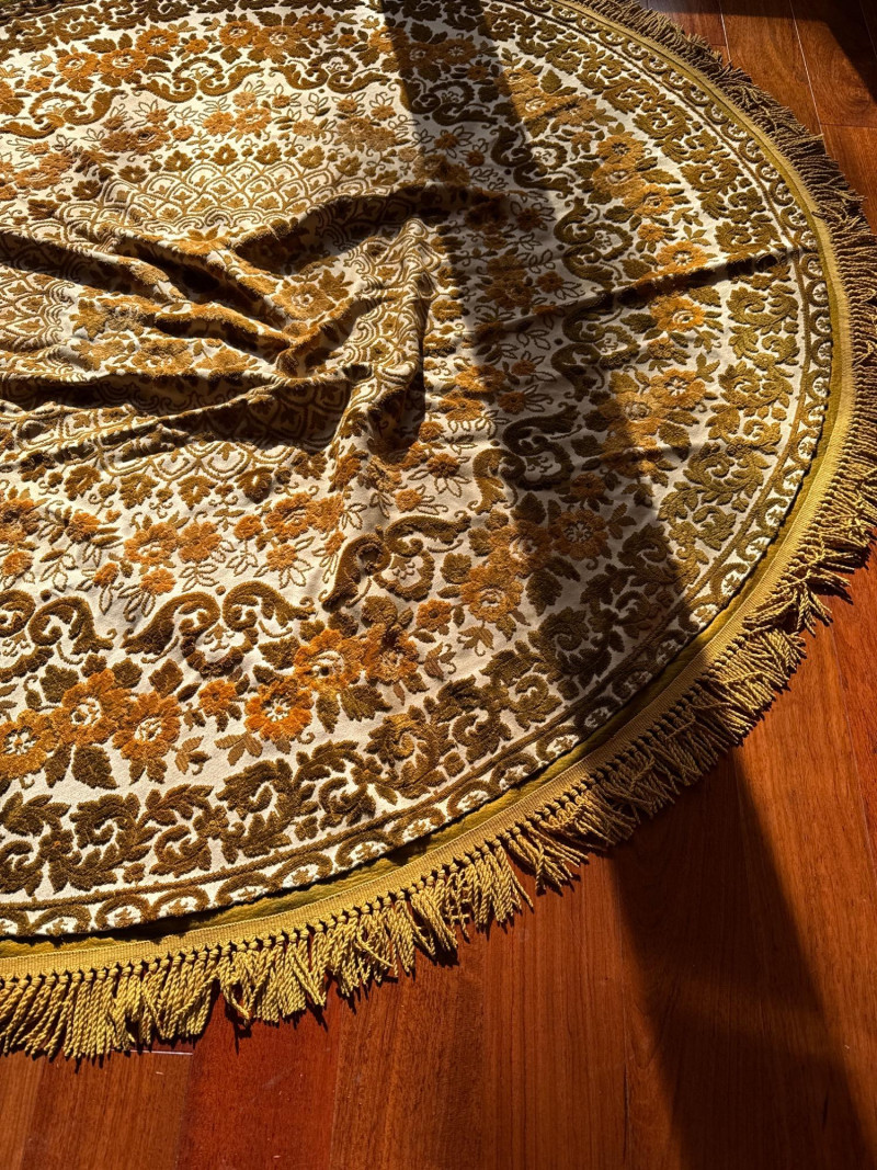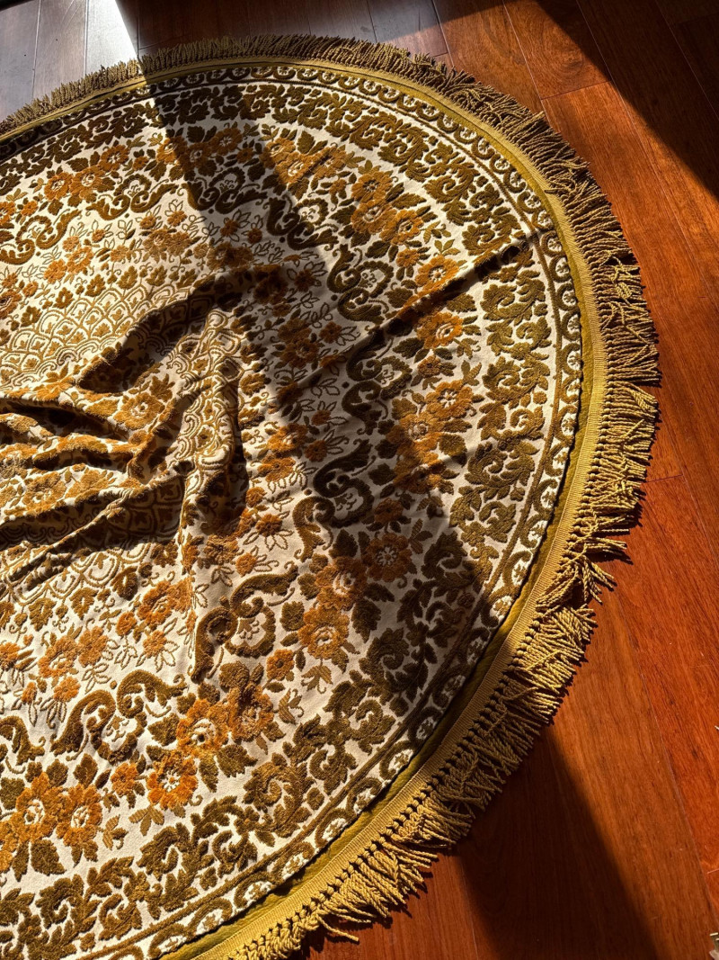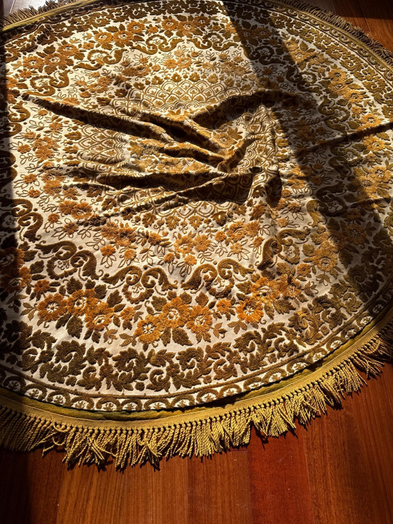 Vintage Belgian Round Rug – 66" – Made by EKasyS Beautiful 66-inch round Belgian rug crafted by EKasyS, known for their quality textile work and richly detailed designs. This piece features a stunning gold, olive, and cream floral medallion pattern with ornate borders and classic fringe edging. Features: Made in Belgium by EKasyS Large round size – approx. 66" diameter Rich mid-century floral pattern in gold, olive, and cream tones Soft pile with excellent texture Decorative fringe border Perfect as a centerpiece rug, under a 5' round table, or as an accent in any vintage-inspired space Condition: All clothes and table clothes is this entire auction needs to be cleaned