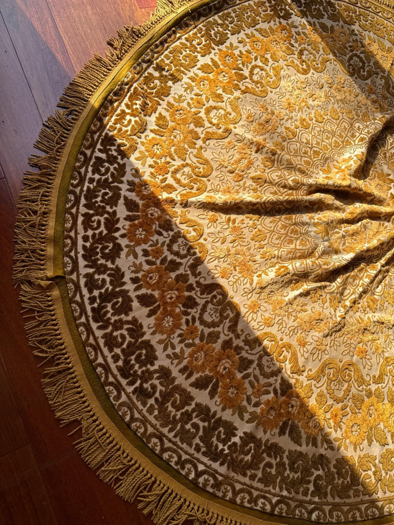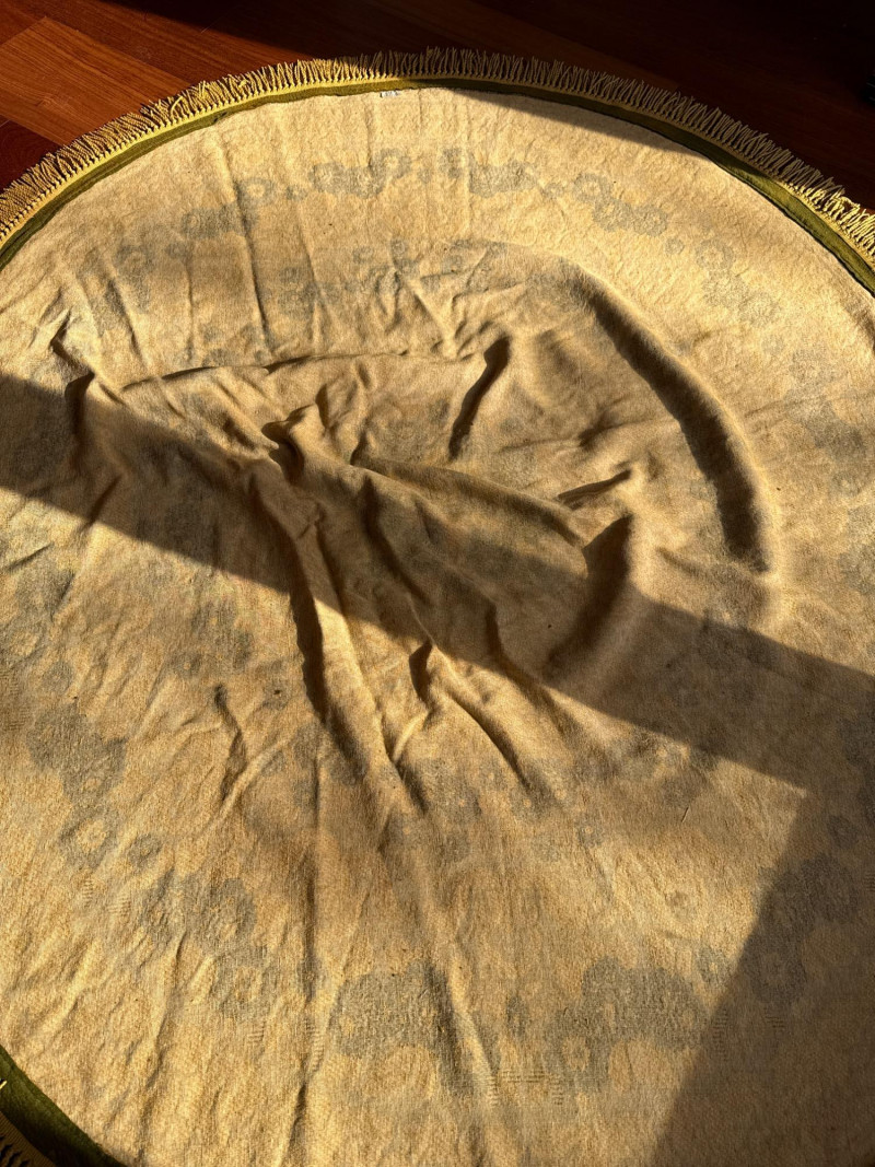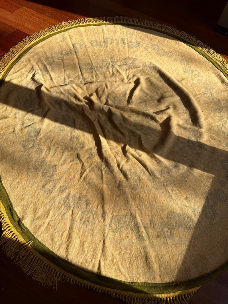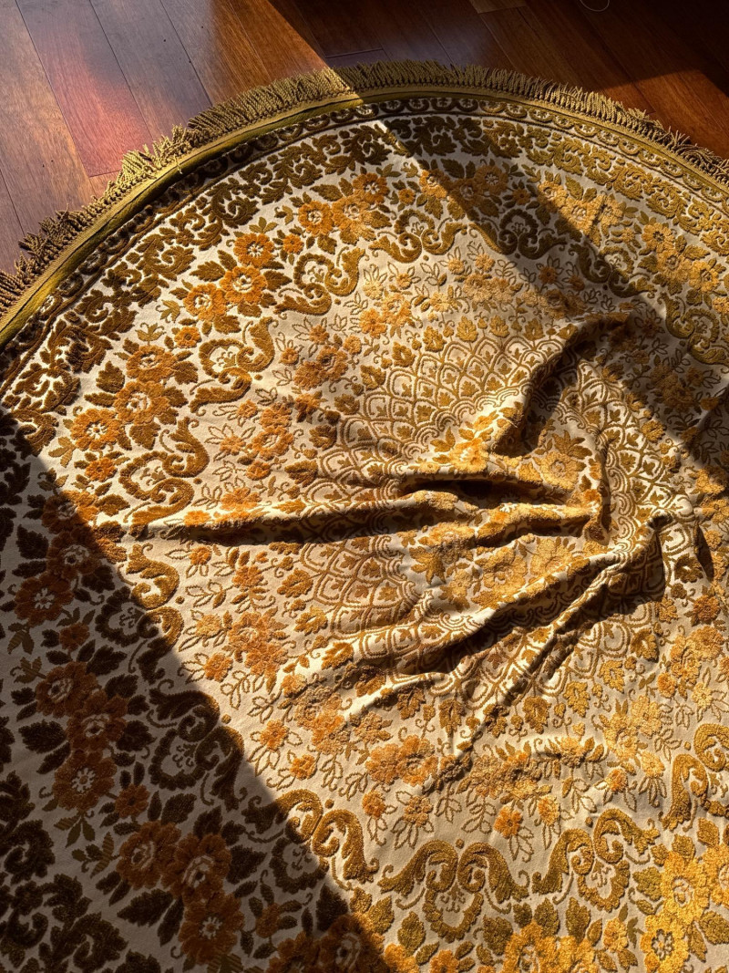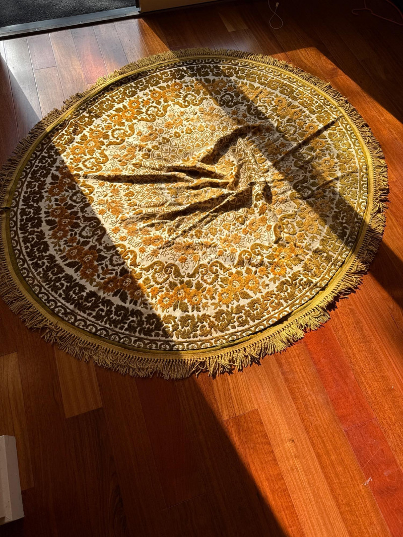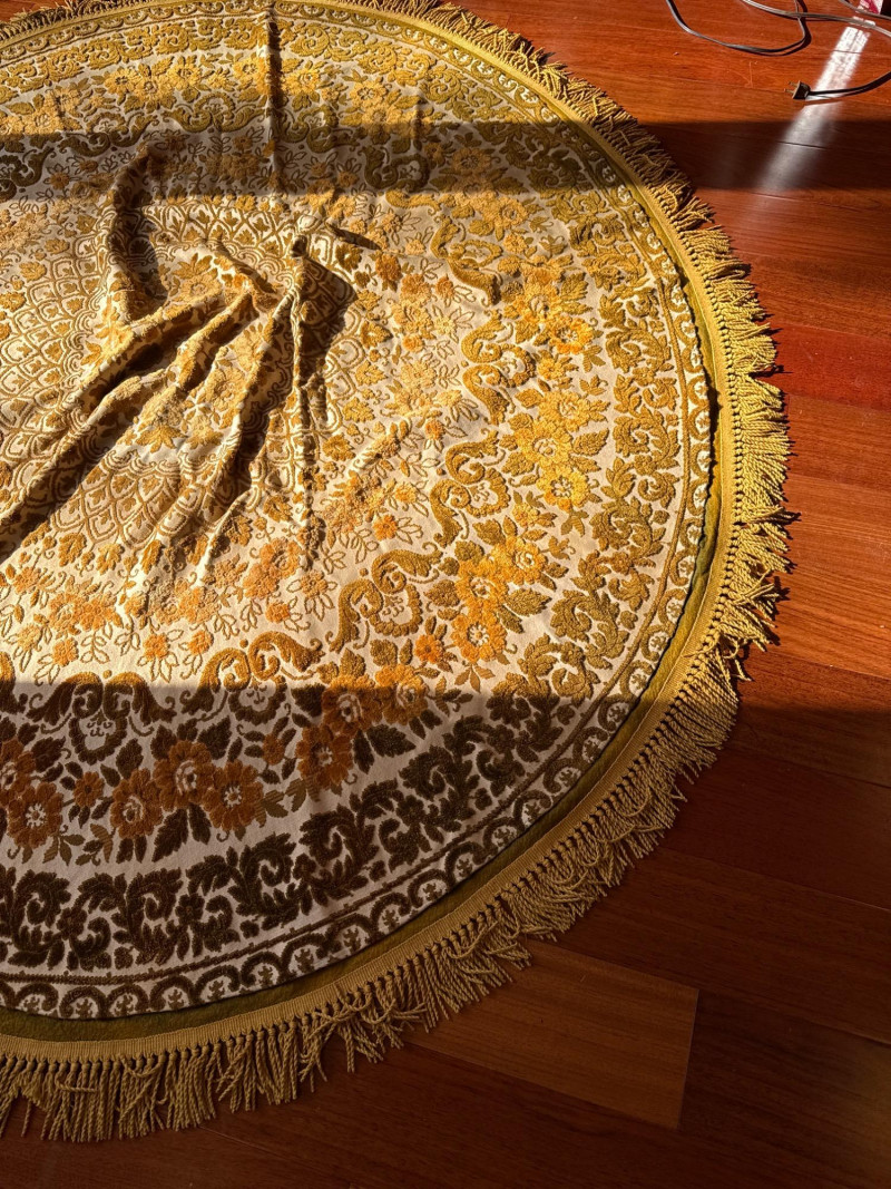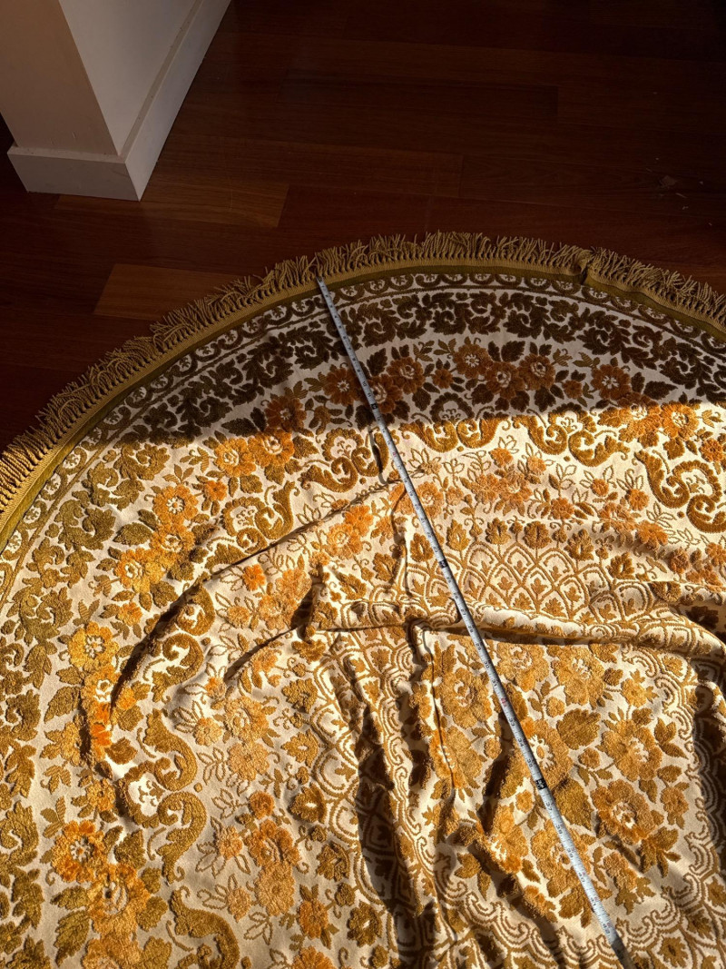 Vintage Belgian Round Rug – 66" – Made by EKasyS Beautiful 66-inch round Belgian rug crafted by EKasyS, known for their quality textile work and richly detailed designs. This piece features a stunning gold, olive, and cream floral medallion pattern with ornate borders and classic fringe edging. Features: Made in Belgium by EKasyS Large round size – approx. 66" diameter Rich mid-century floral pattern in gold, olive, and cream tones Soft pile with excellent texture Decorative fringe border Perfect as a centerpiece rug, under a 5' round table, or as an accent in any vintage-inspired space Condition: All clothes and table clothes is this entire auction needs to be cleaned