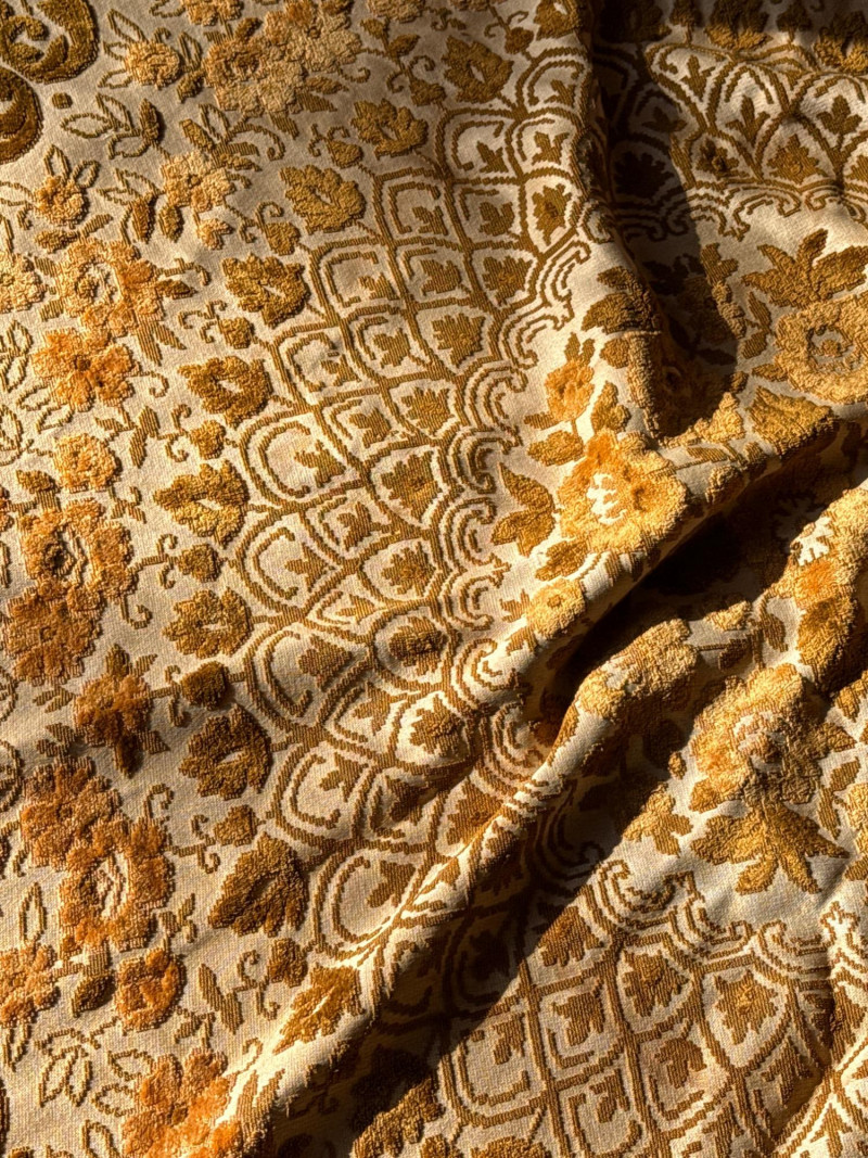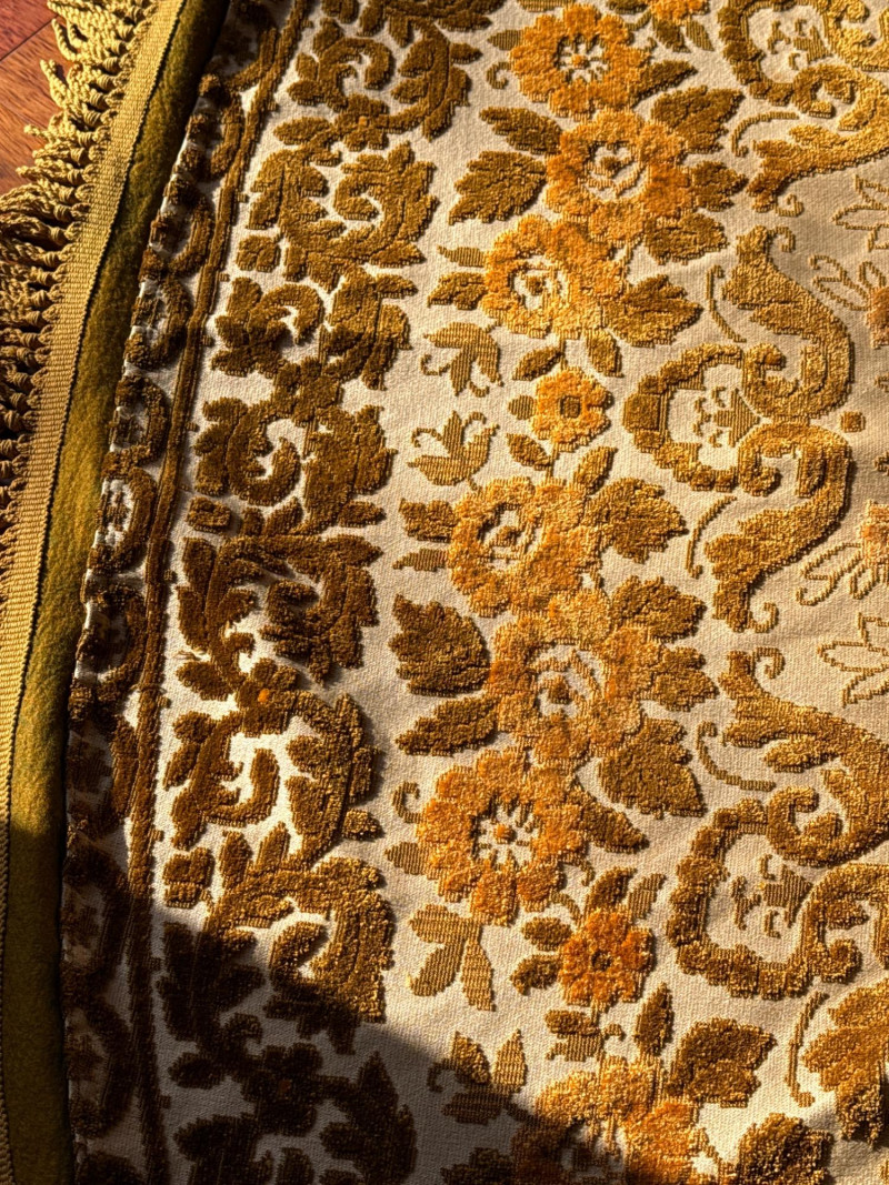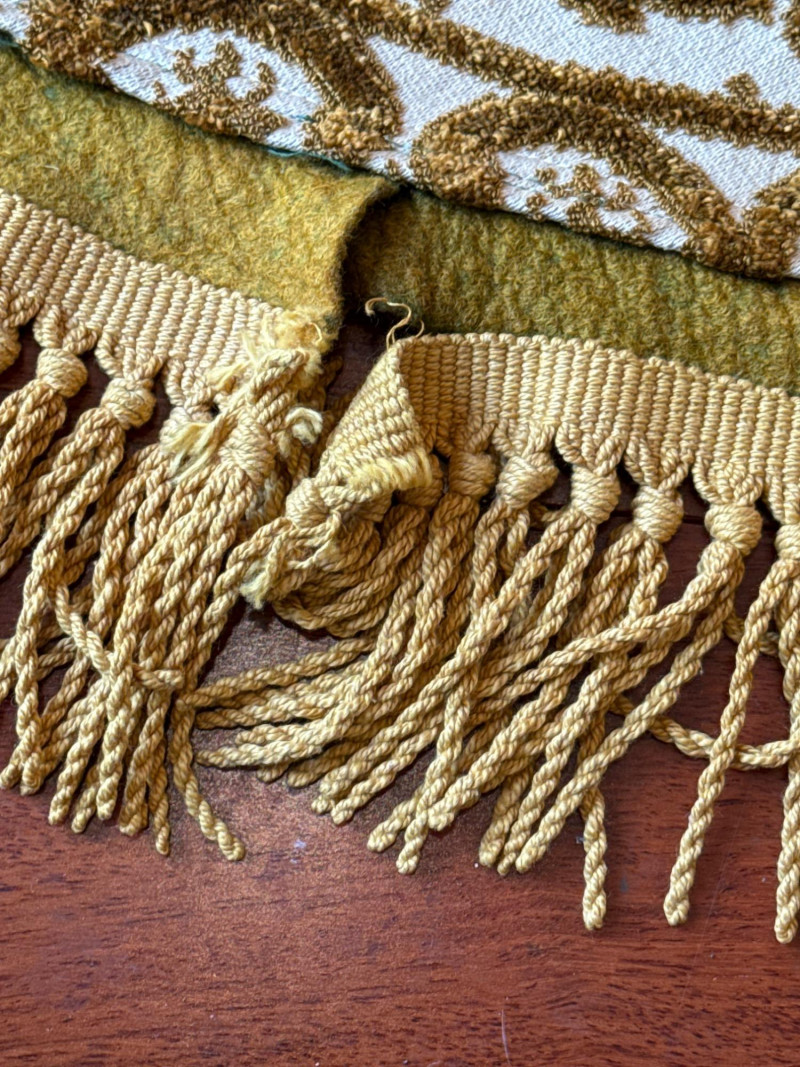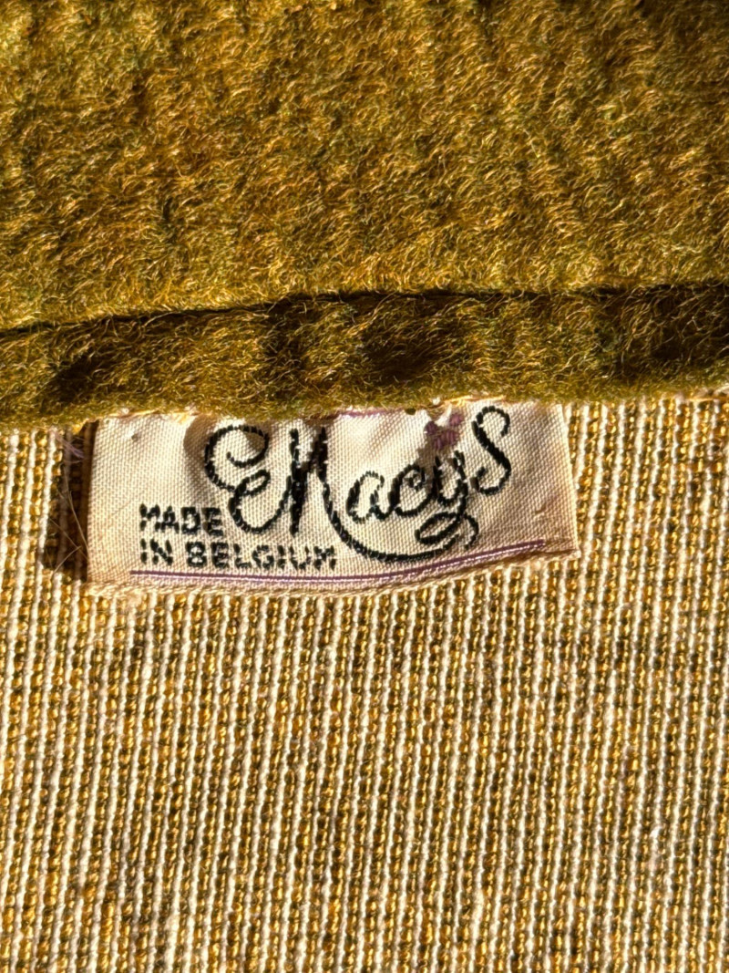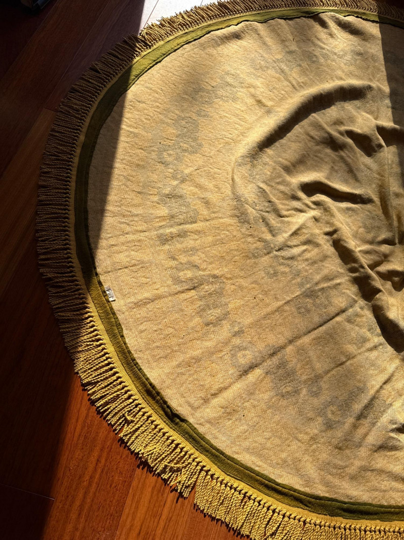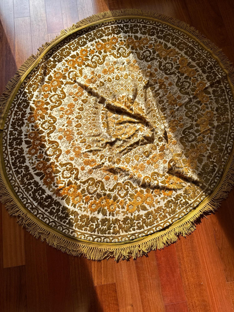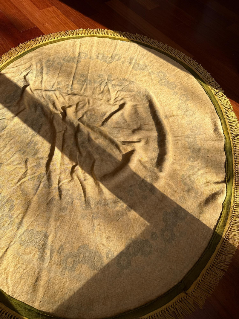 Vintage Belgian Round Rug – 66" – Made by EKasyS Beautiful 66-inch round Belgian rug crafted by EKasyS, known for their quality textile work and richly detailed designs. This piece features a stunning gold, olive, and cream floral medallion pattern with ornate borders and classic fringe edging. Features: Made in Belgium by EKasyS Large round size – approx. 66" diameter Rich mid-century floral pattern in gold, olive, and cream tones Soft pile with excellent texture Decorative fringe border Perfect as a centerpiece rug, under a 5' round table, or as an accent in any vintage-inspired space Condition: All clothes and table clothes is this entire auction needs to be cleaned