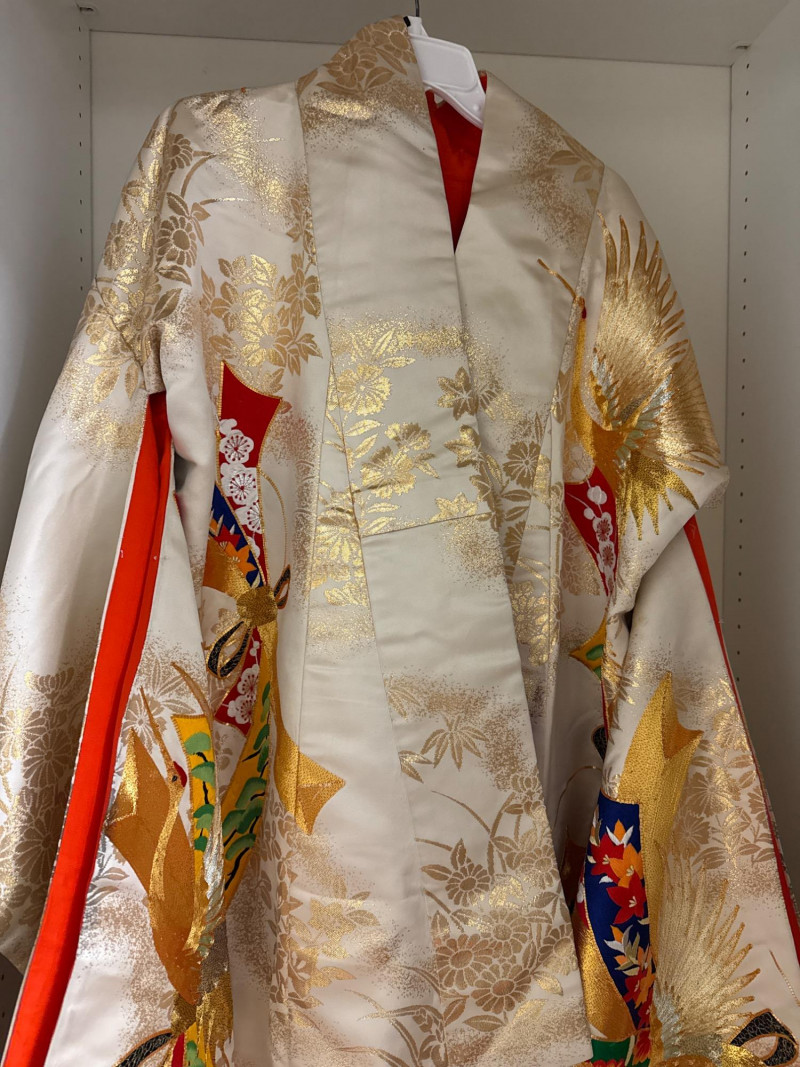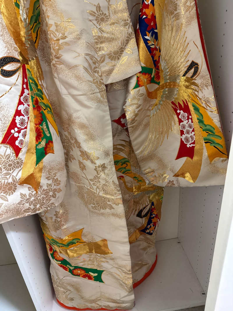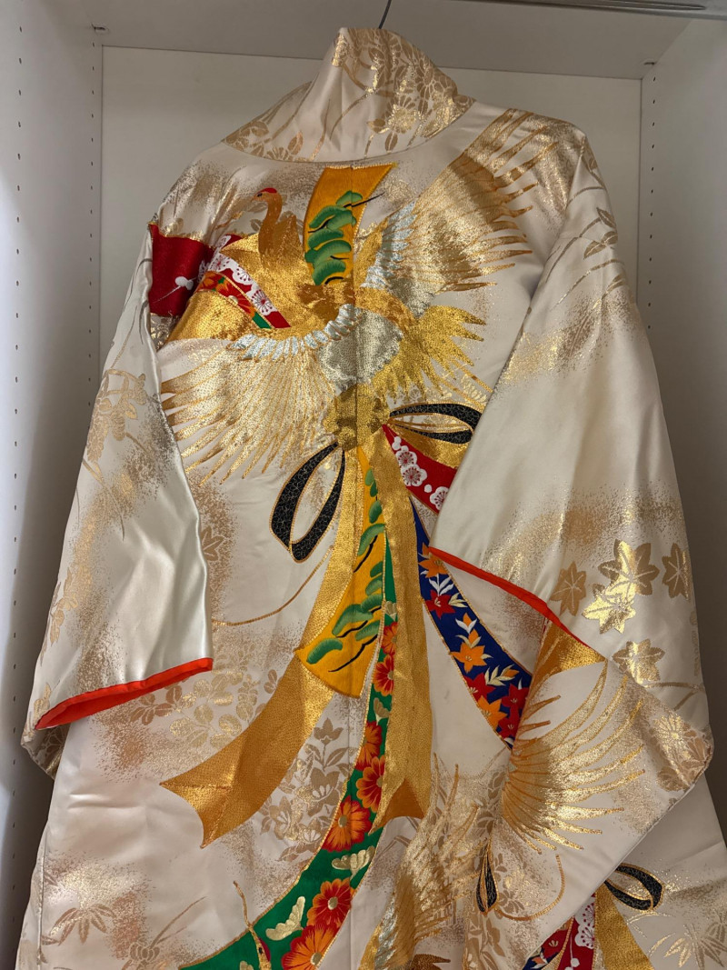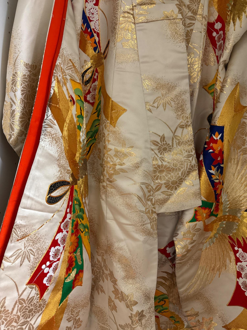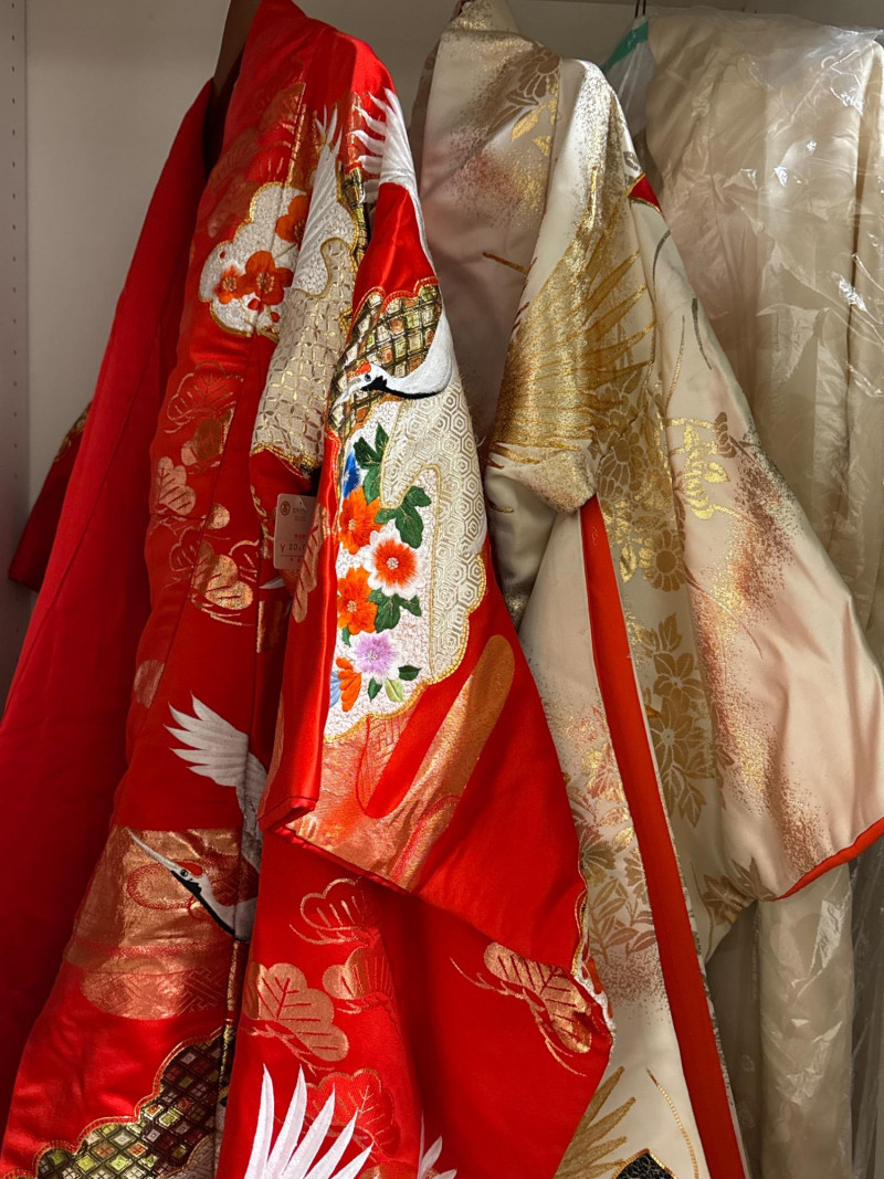 wedding attire, including two uchikake wedding kimonos and one coordinating