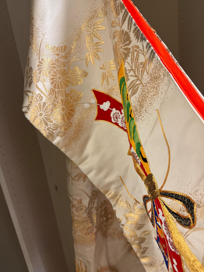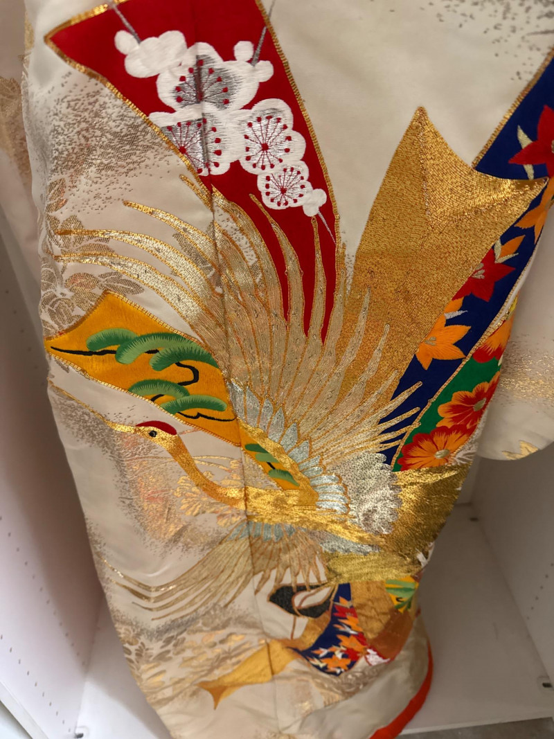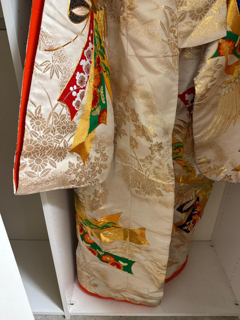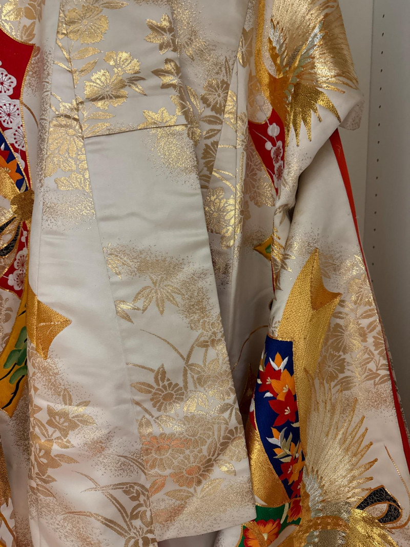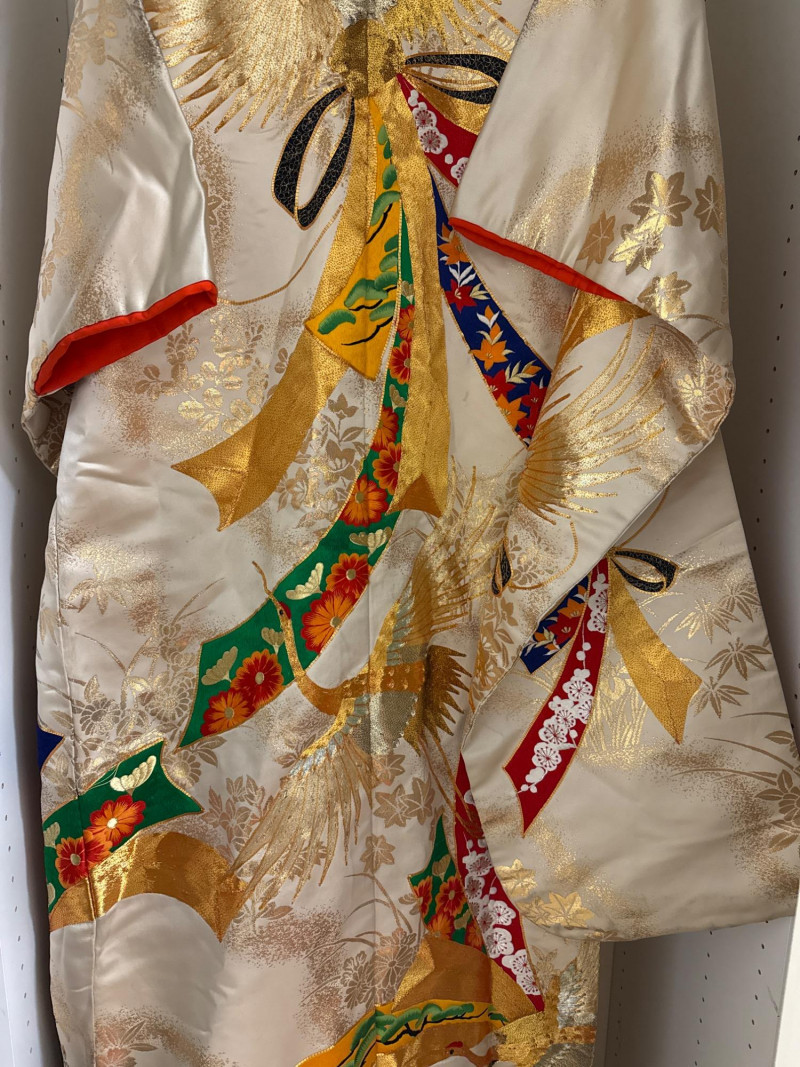 wedding attire, including two uchikake wedding kimonos and one coordinating