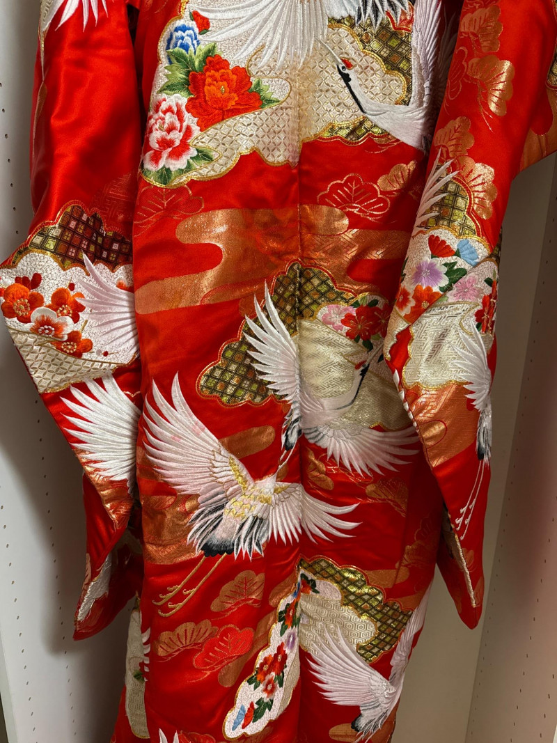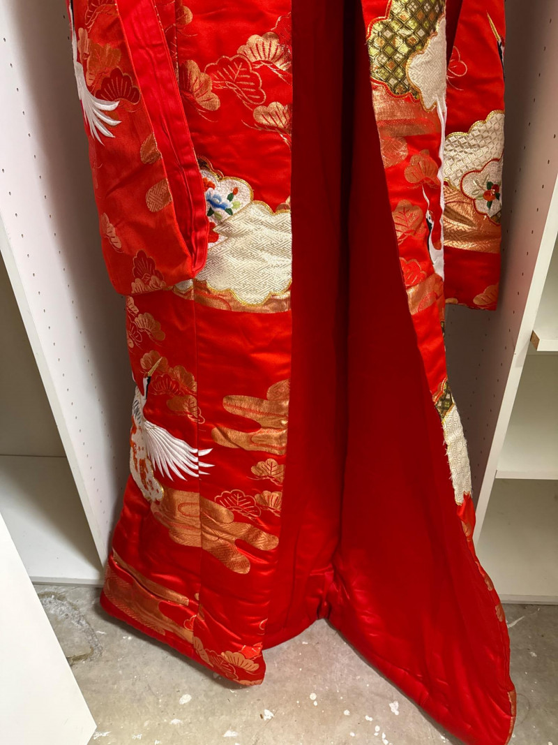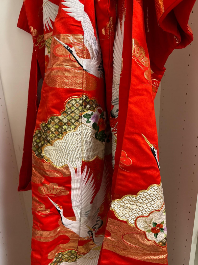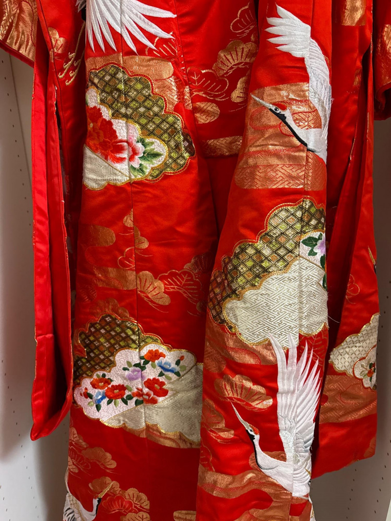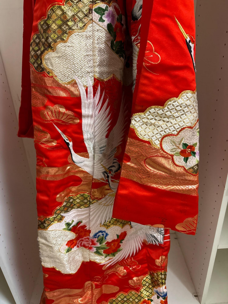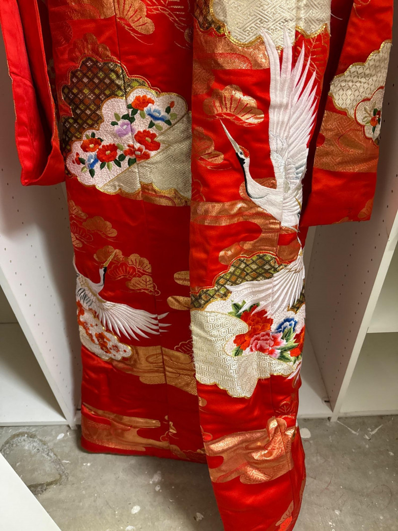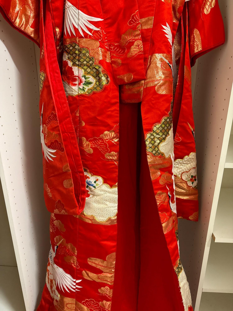 robe. The first garment is a vibrant red silk uchikake richly decorated with