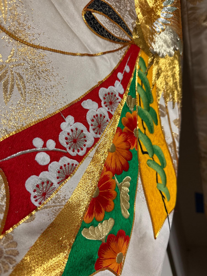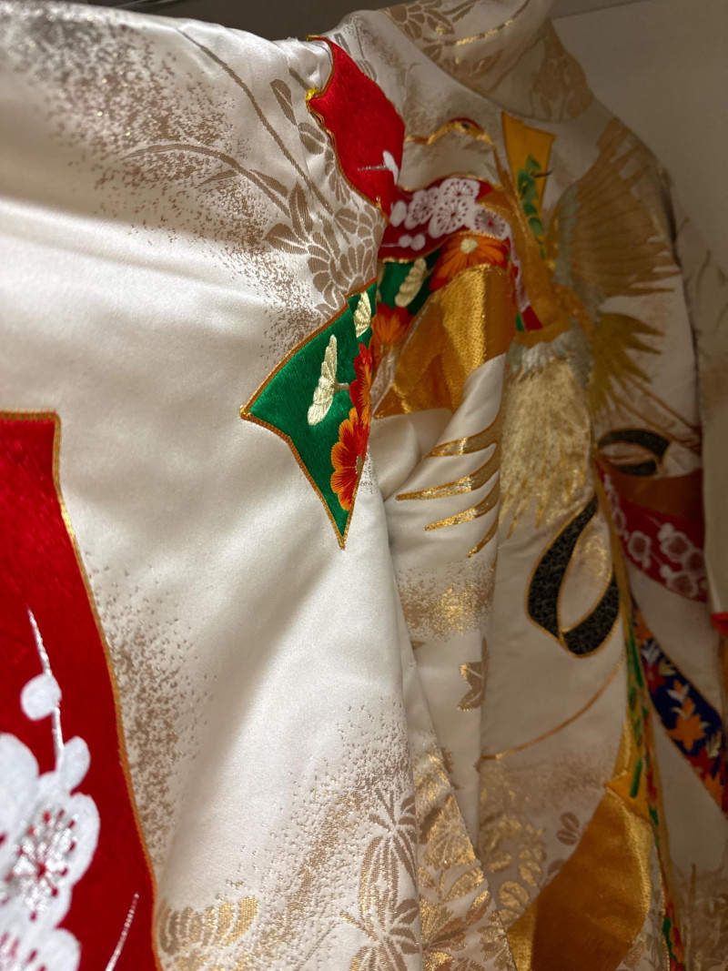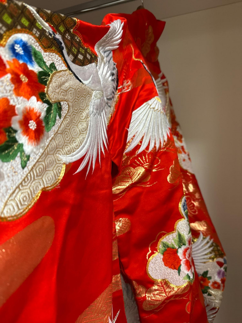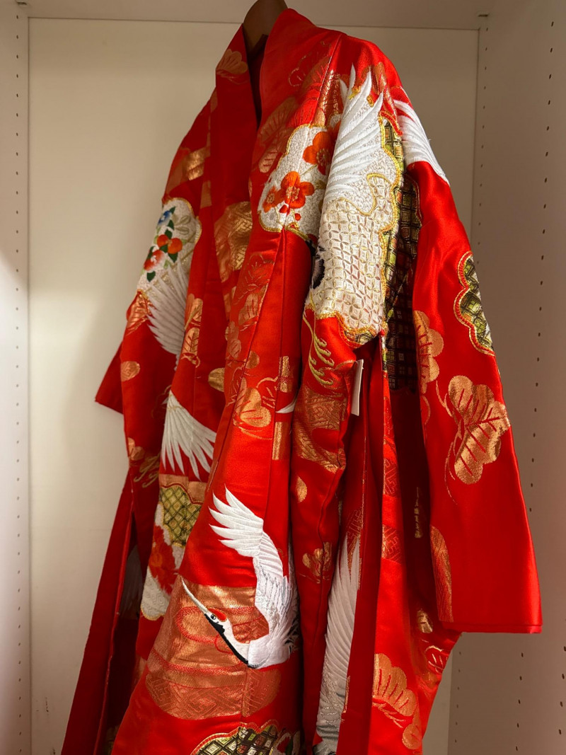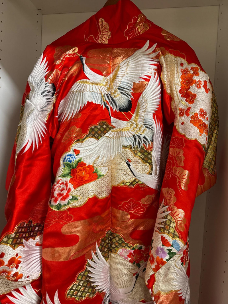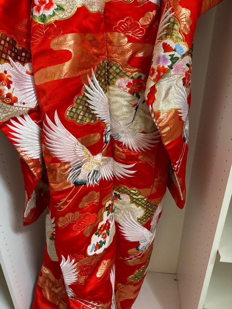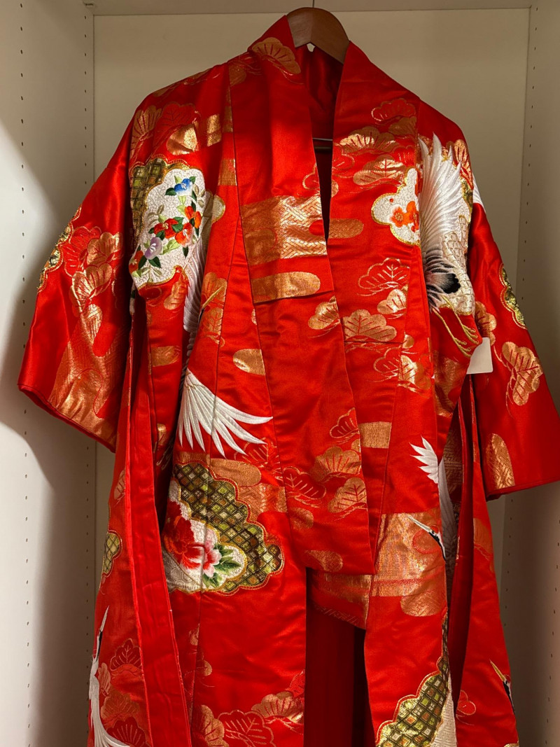 robe. The first garment is a vibrant red silk uchikake richly decorated with