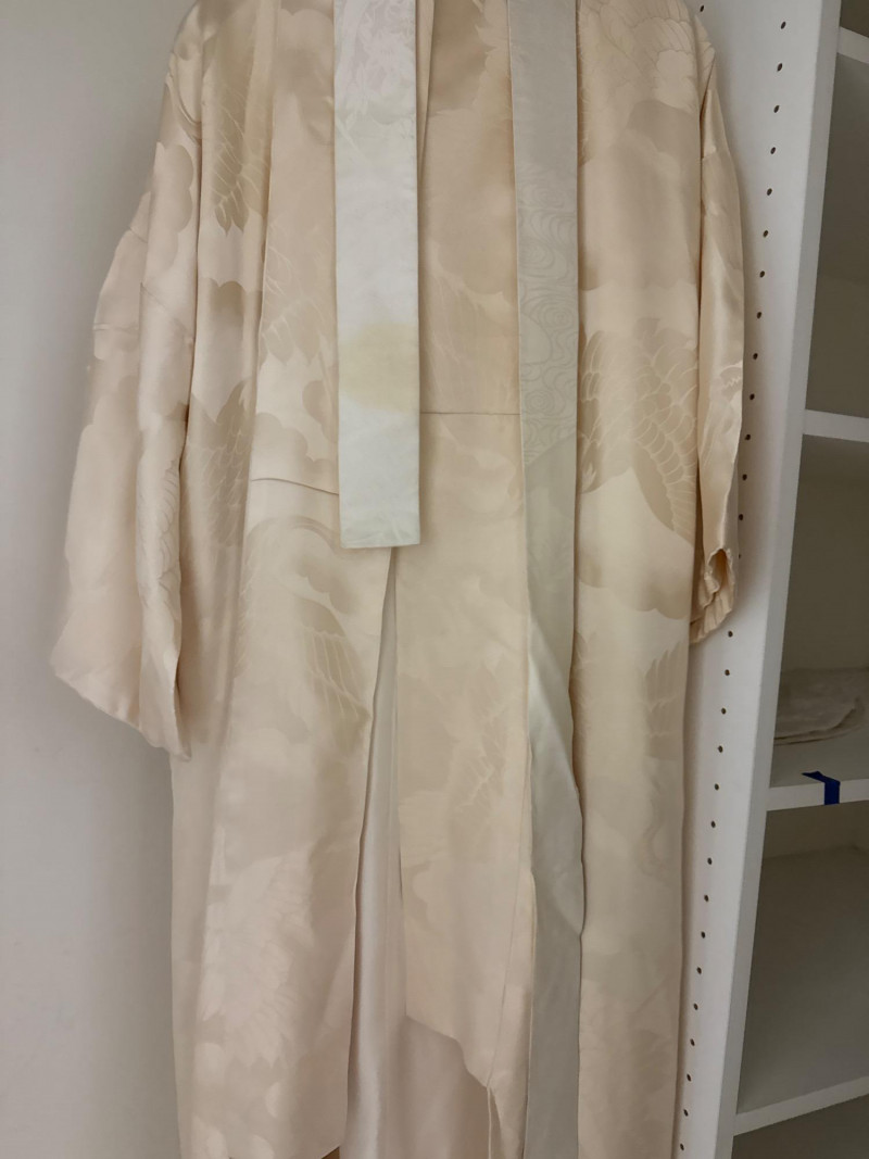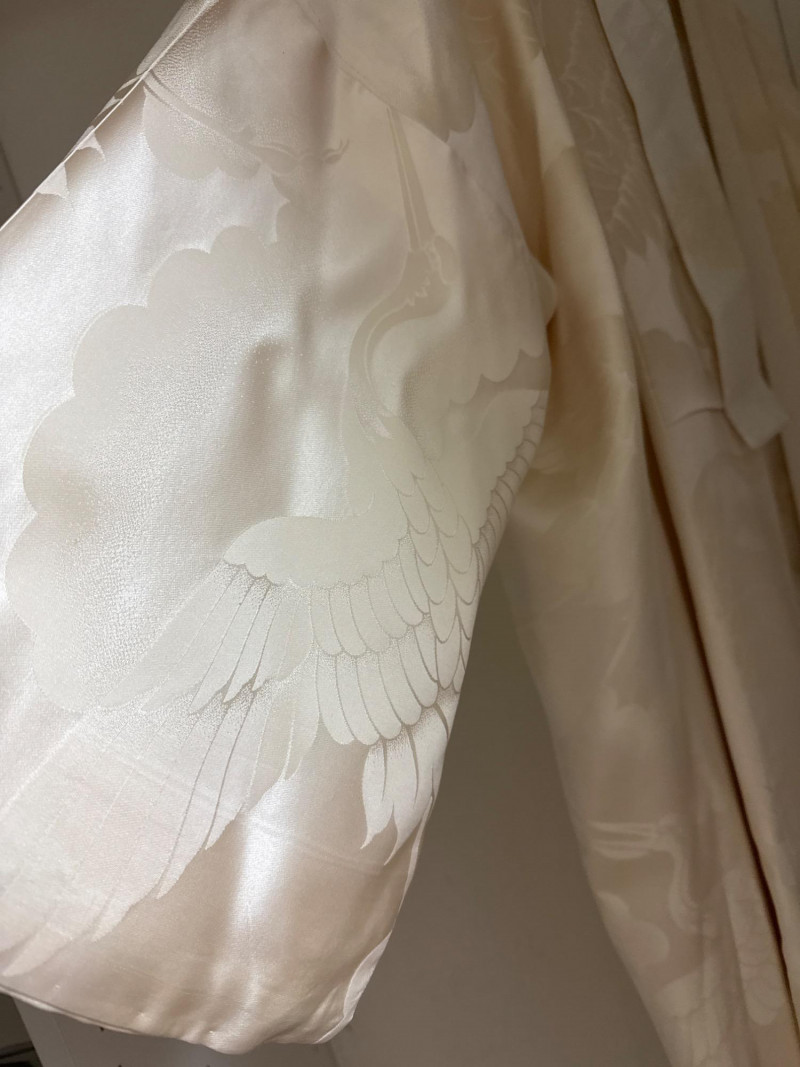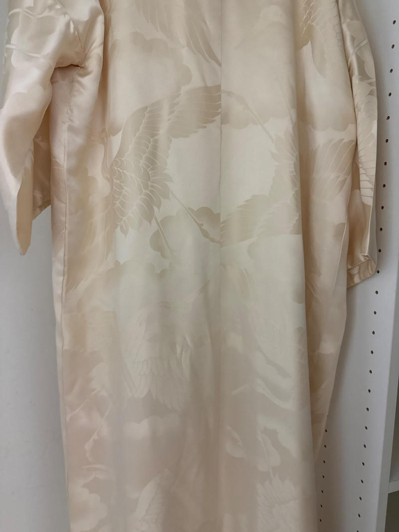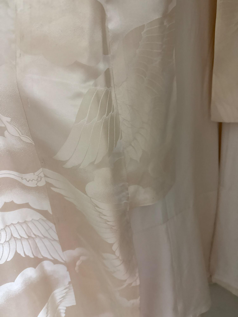 longevity and happiness in Japanese culture. The second garment is an ivory silk