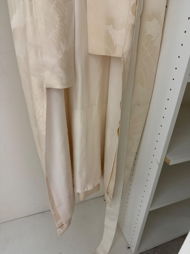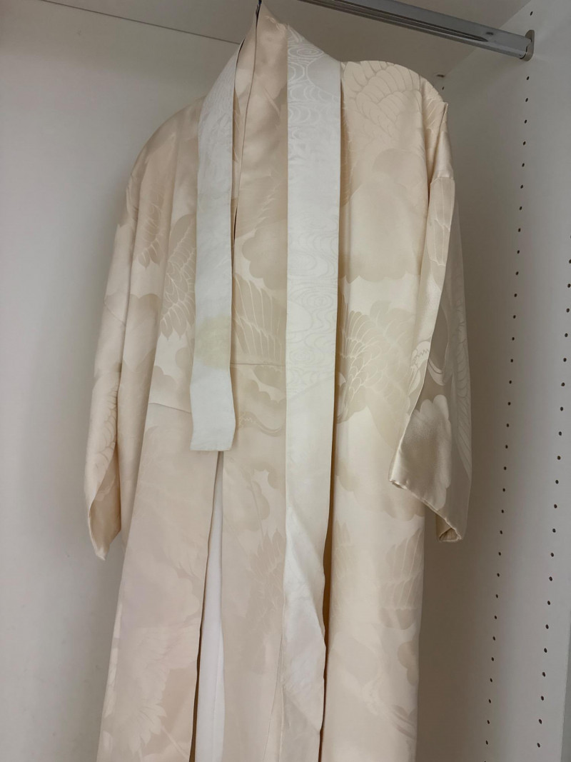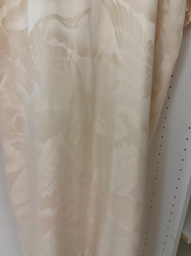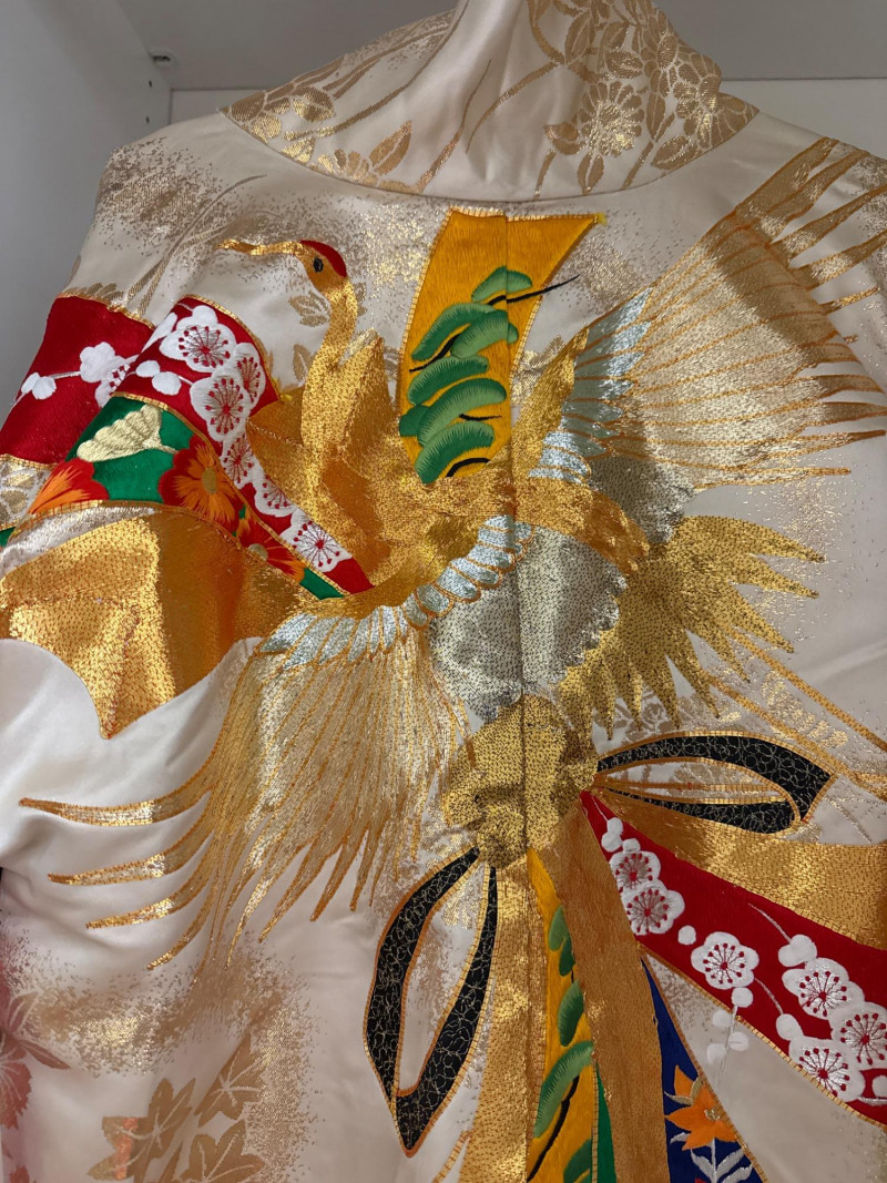 longevity and happiness in Japanese culture. The second garment is an ivory silk