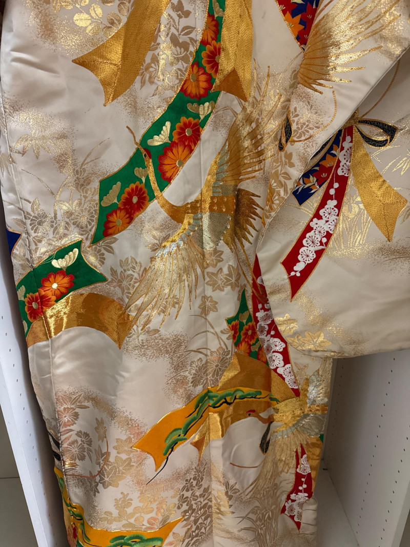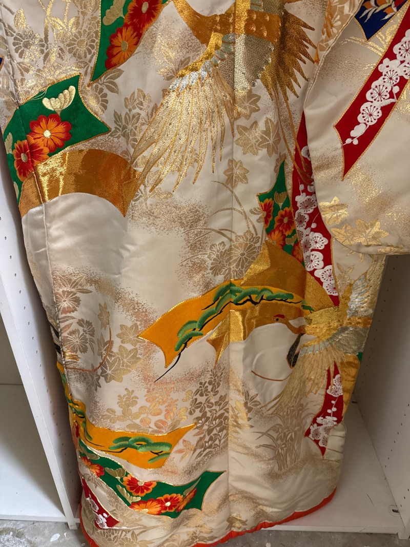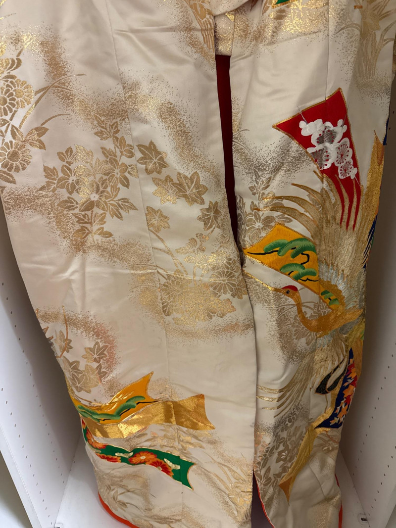 Japanese Bridal Uchikake And Robe Ensemble With Gold Embroidered Cranes This lot consists of three traditional Japanese garments associated with