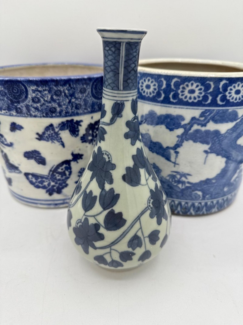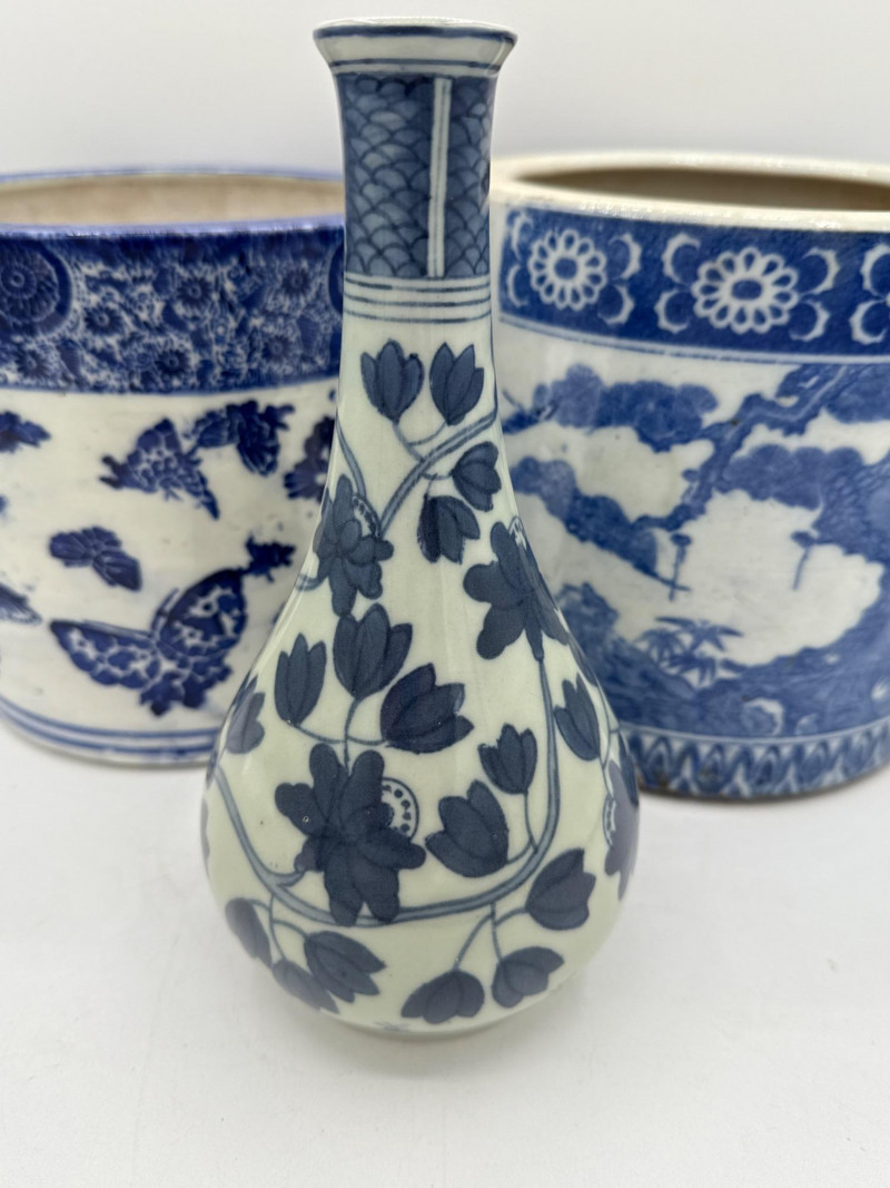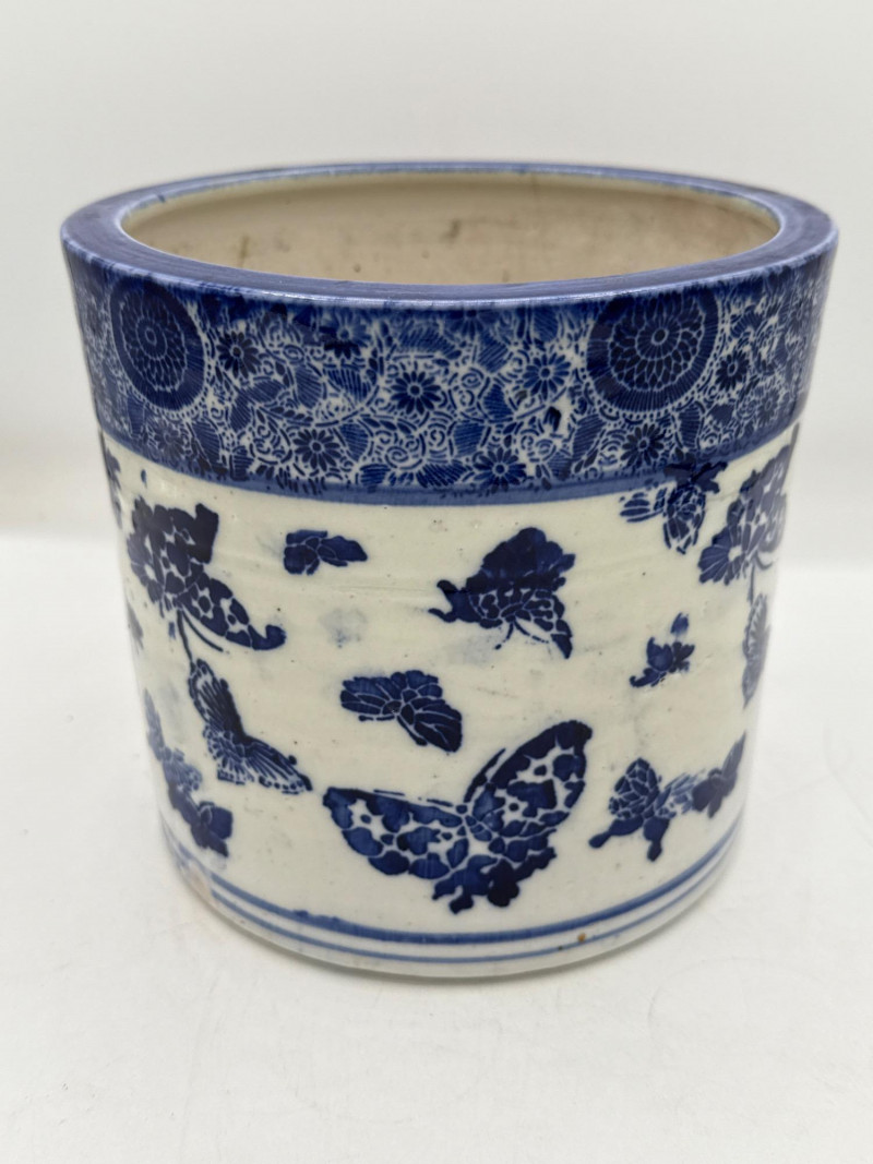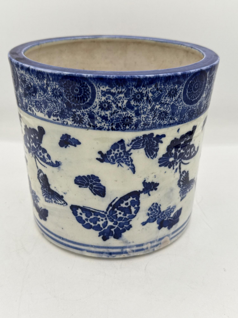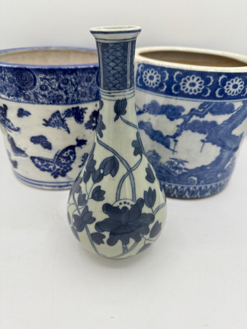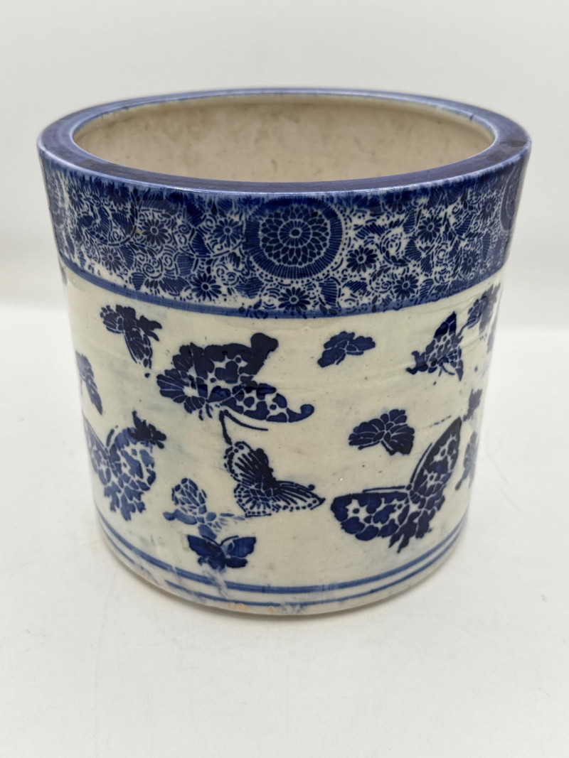 cylindrical planters with intricate cobalt designs: one featuring butterfly