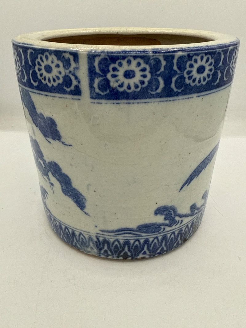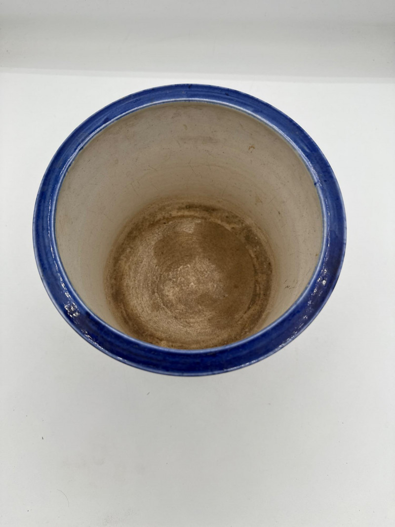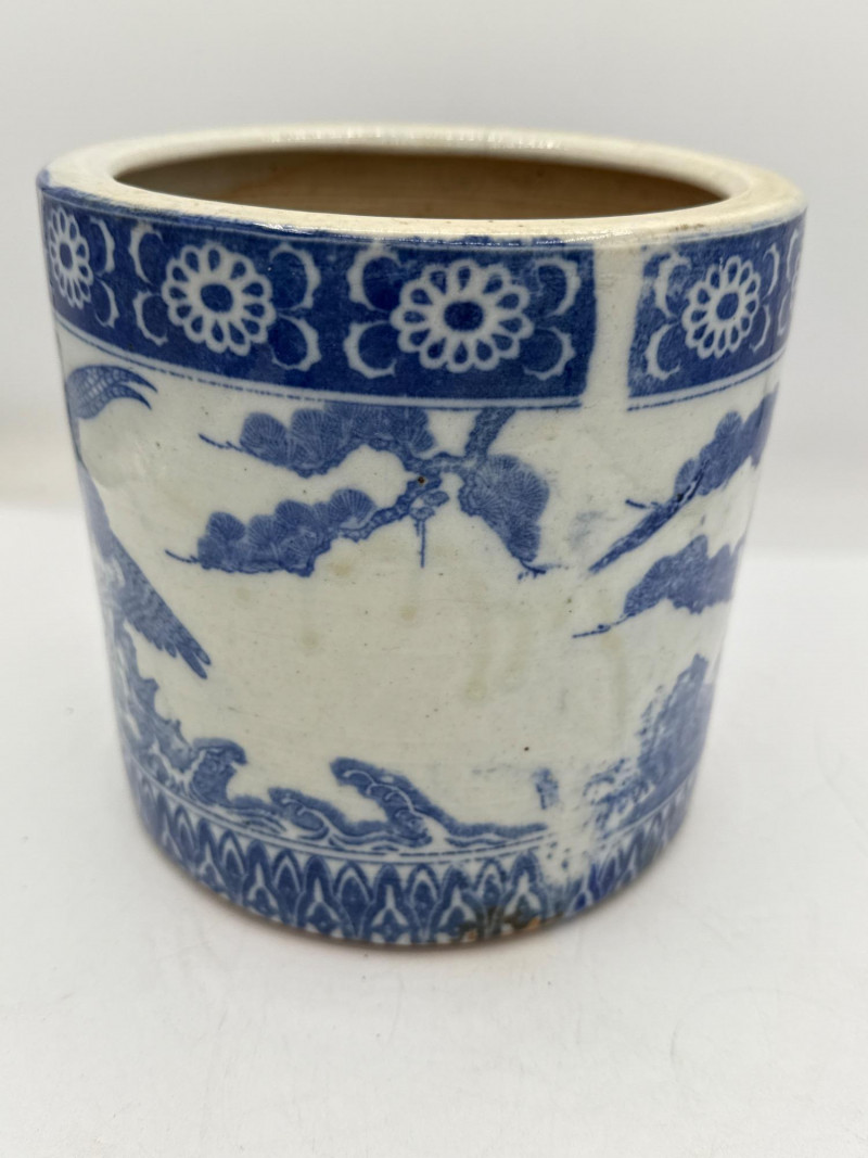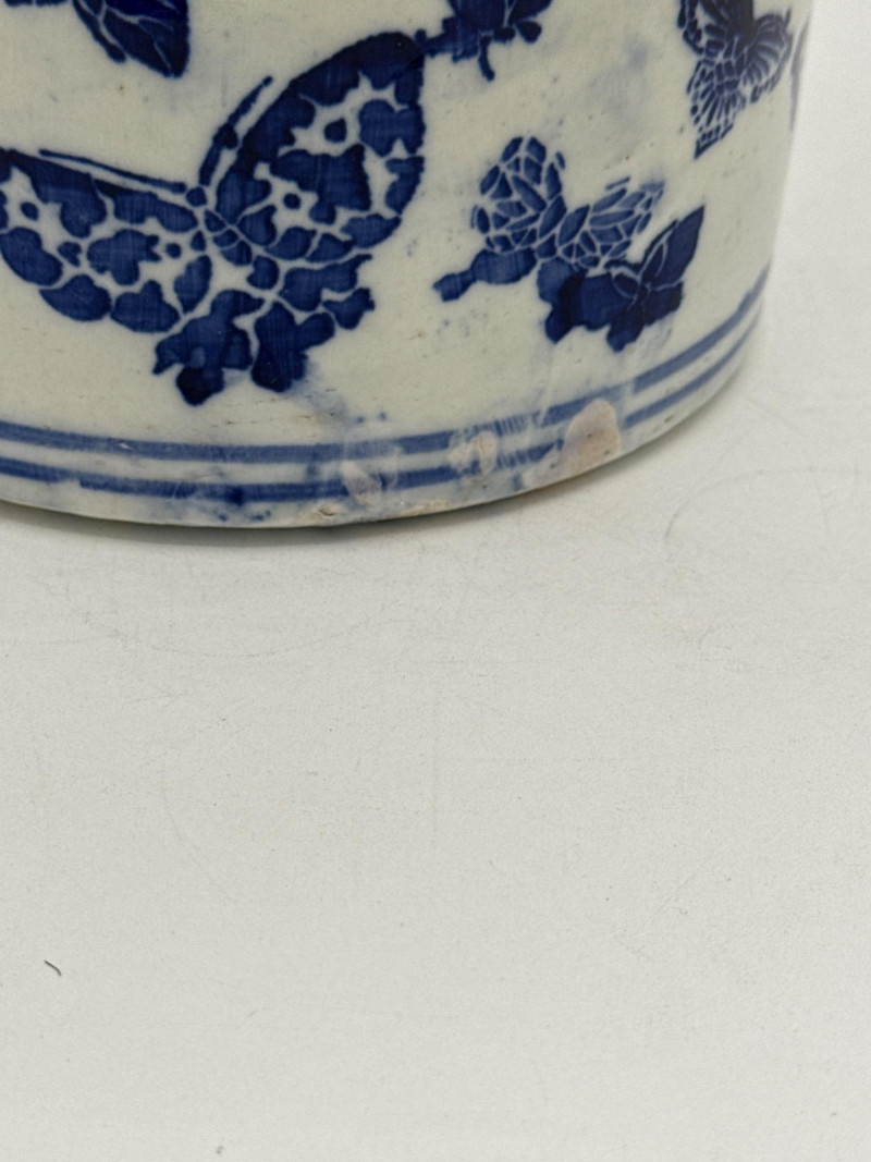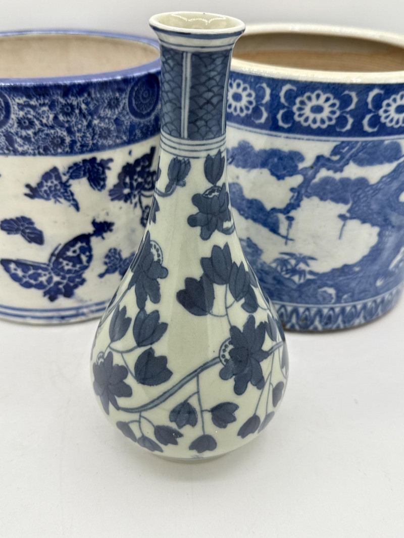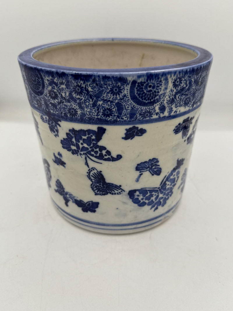 cylindrical planters with intricate cobalt designs: one featuring butterfly