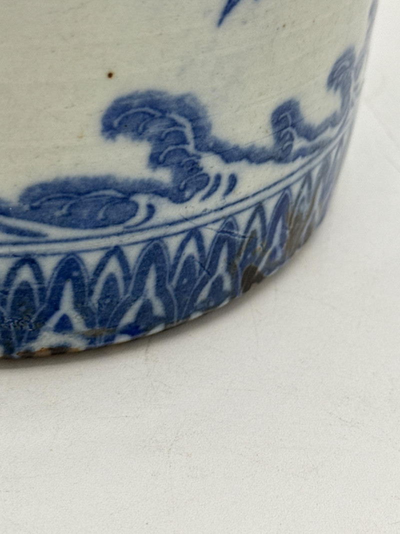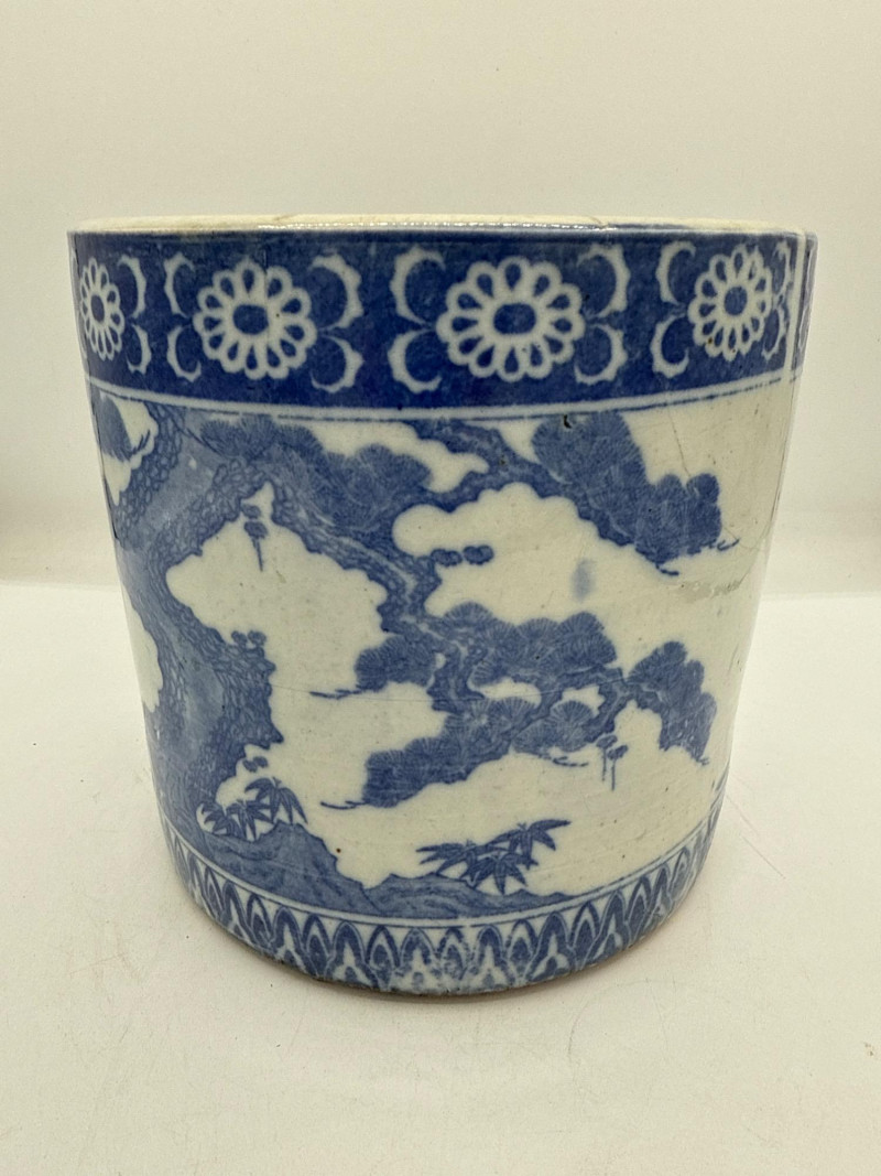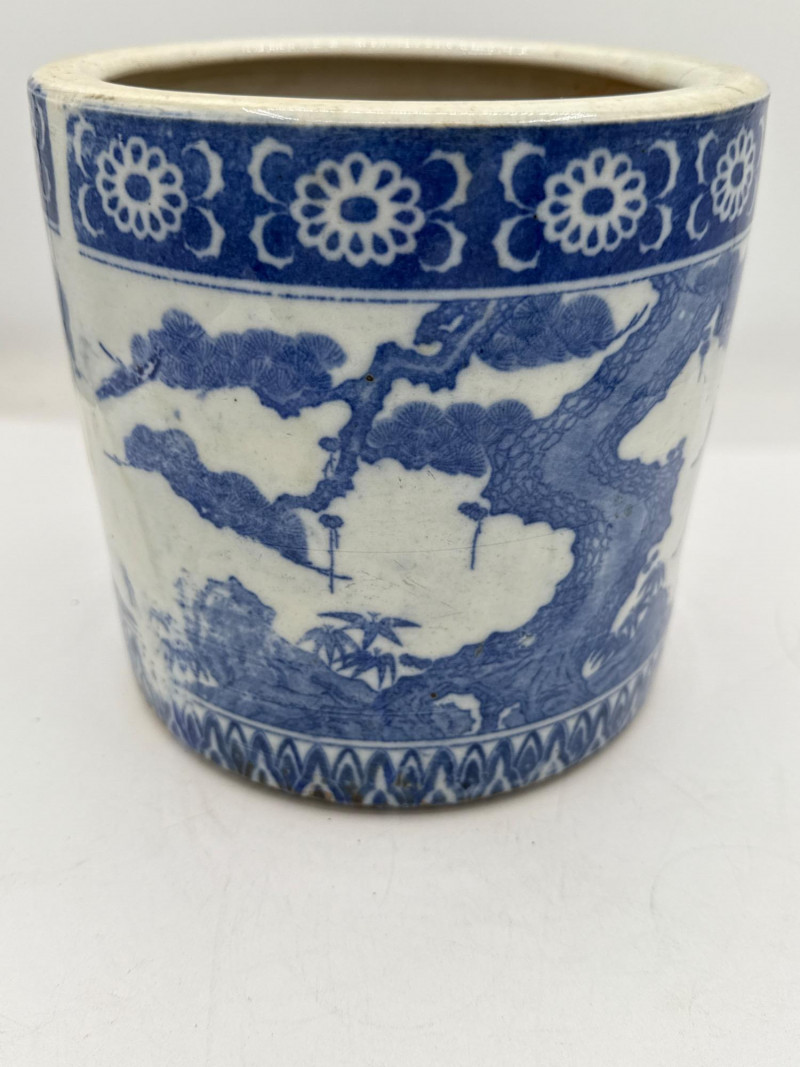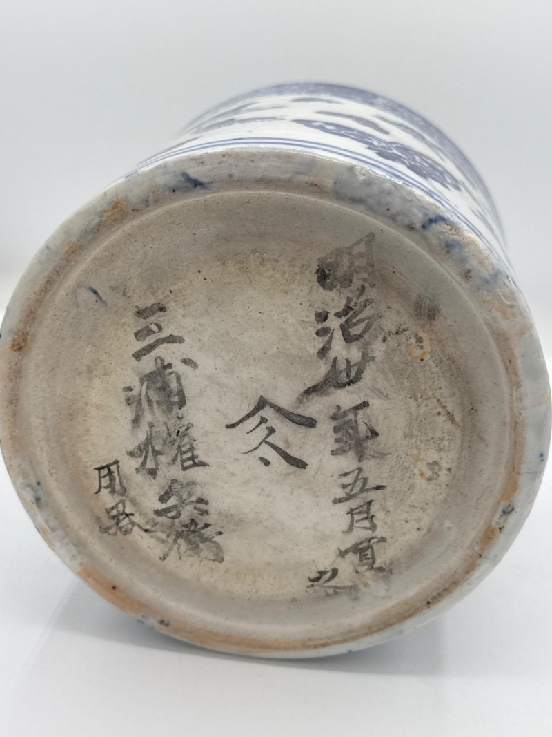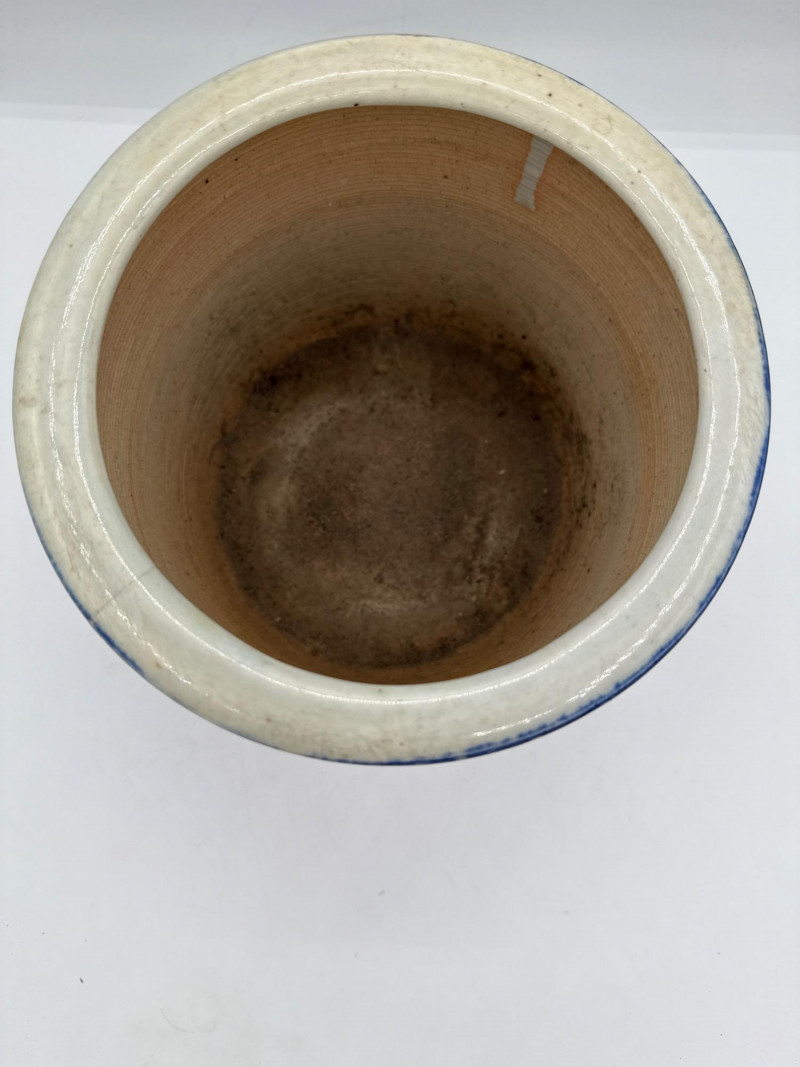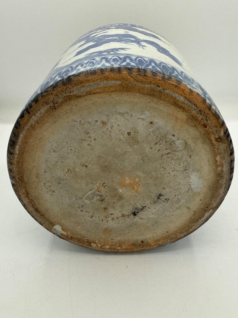 cylindrical planters with intricate cobalt designs: one featuring butterfly