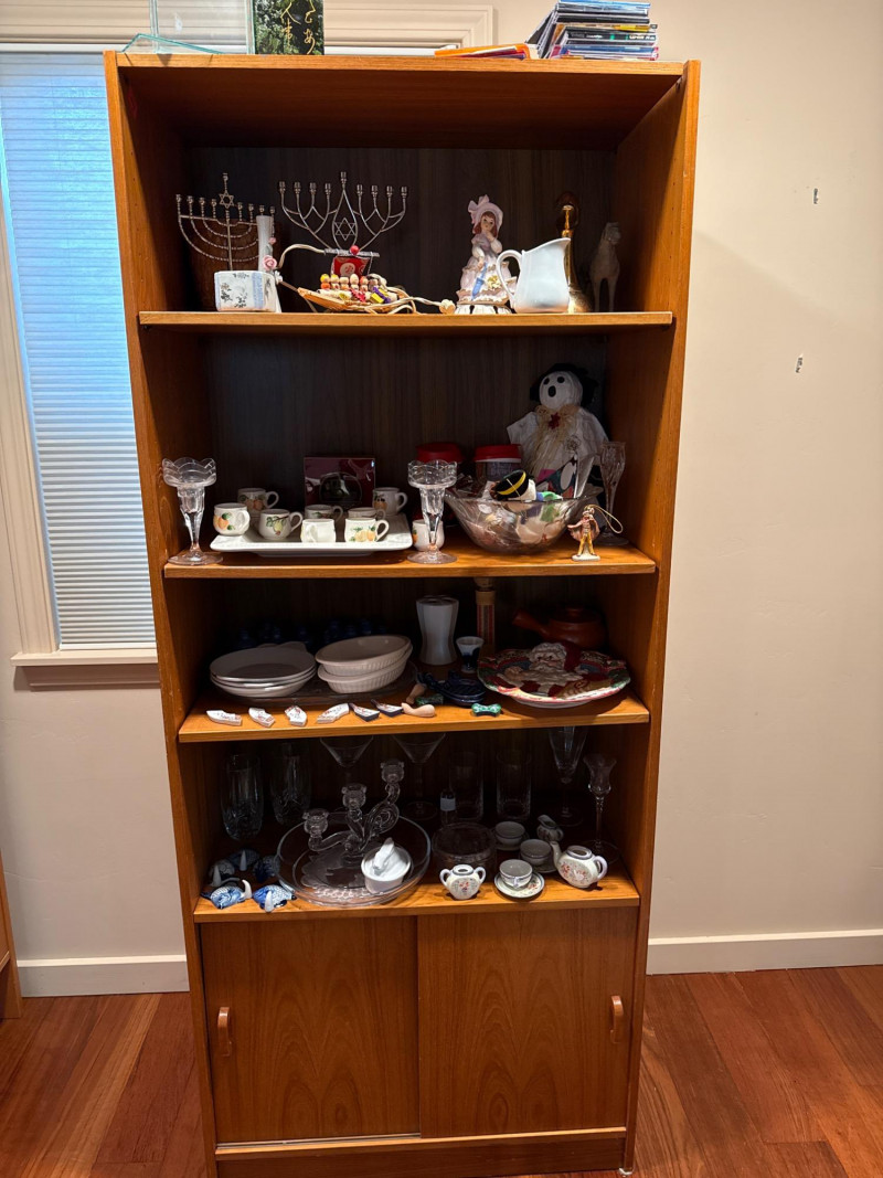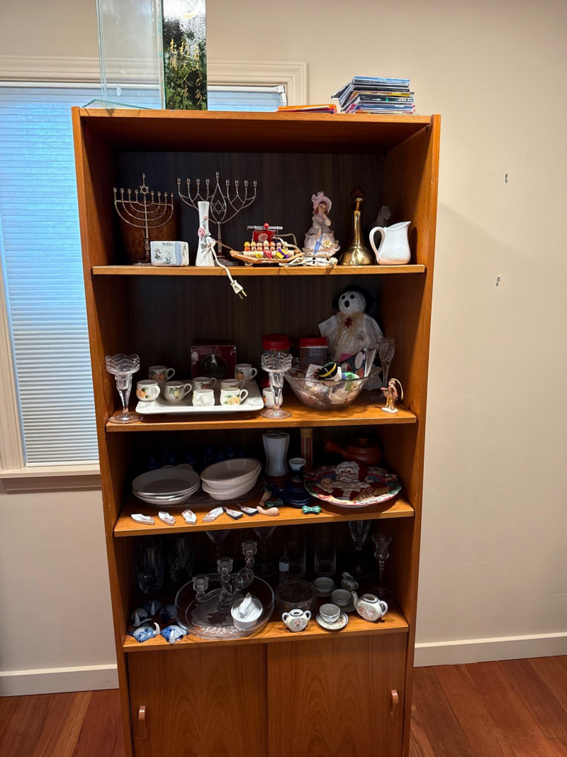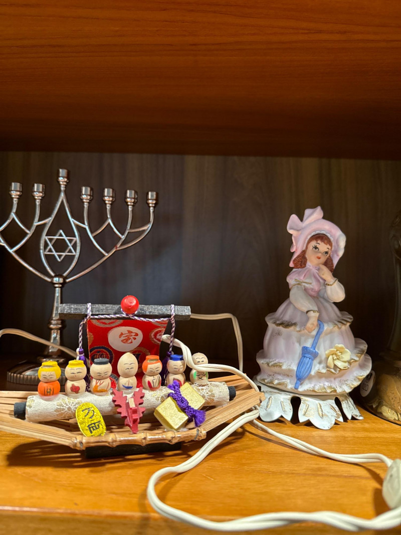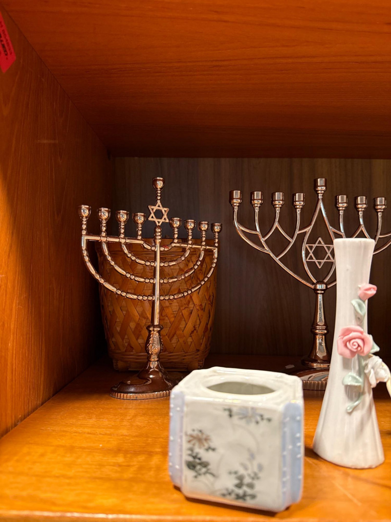 wooden kokeshi doll. Judaica elements include two metal menorahs with Star of