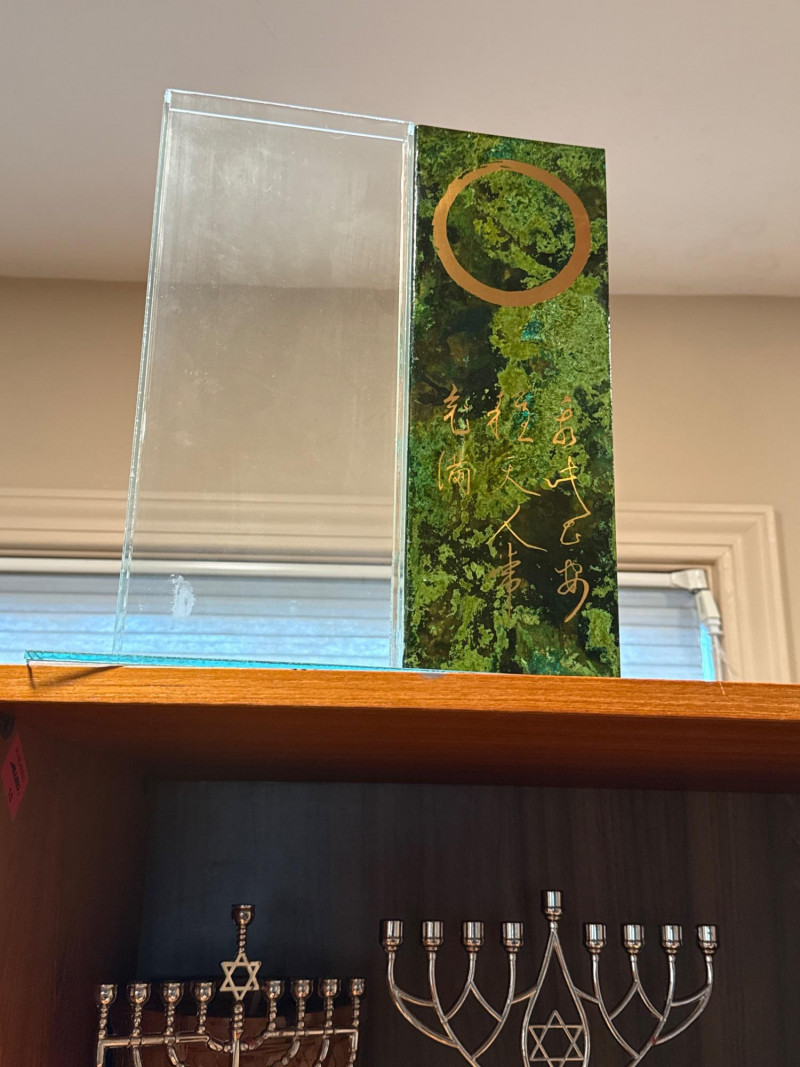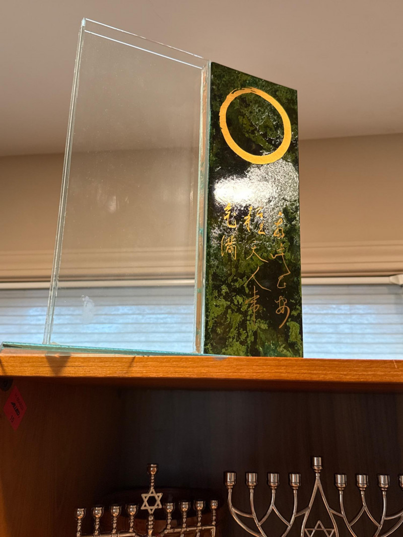 green and gold accents featuring Asian script, assorted novelty ornaments, and