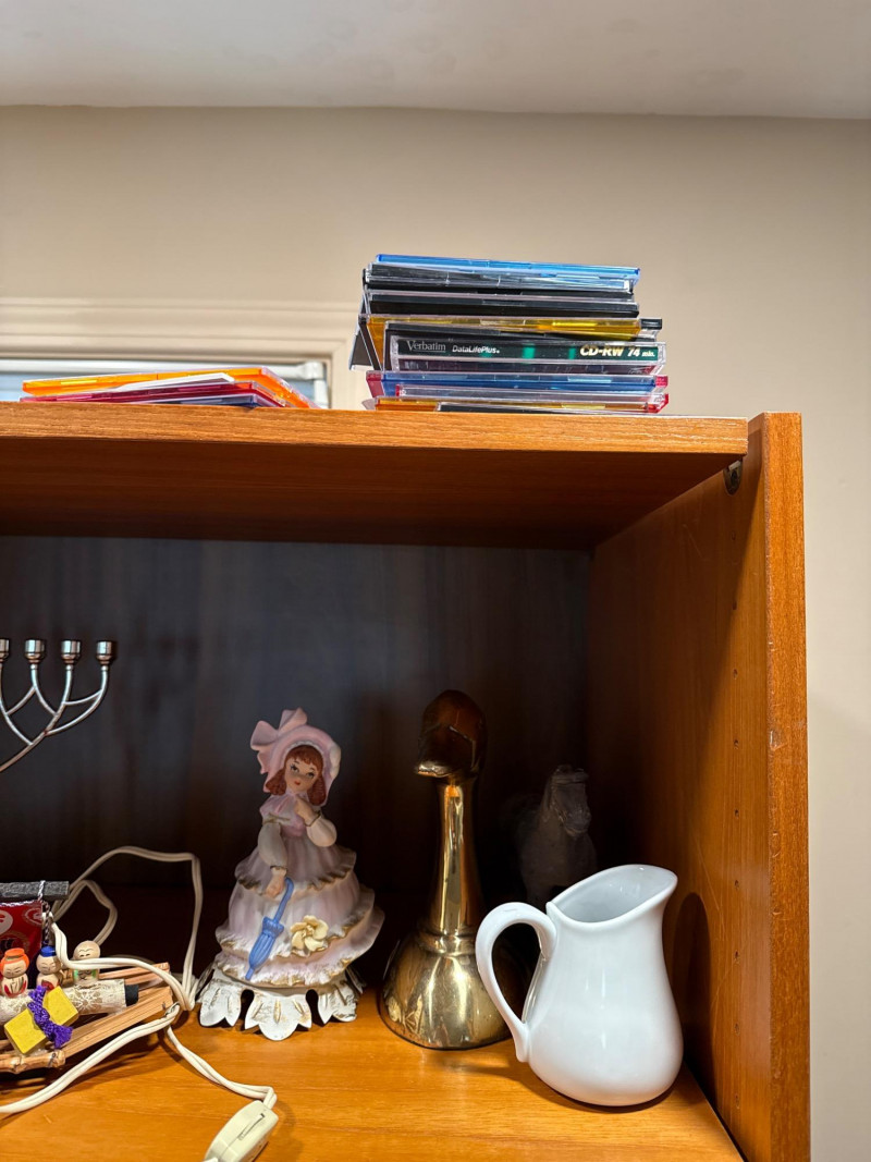 arranged on a wooden shelving unit with sliding doors. The collection includes