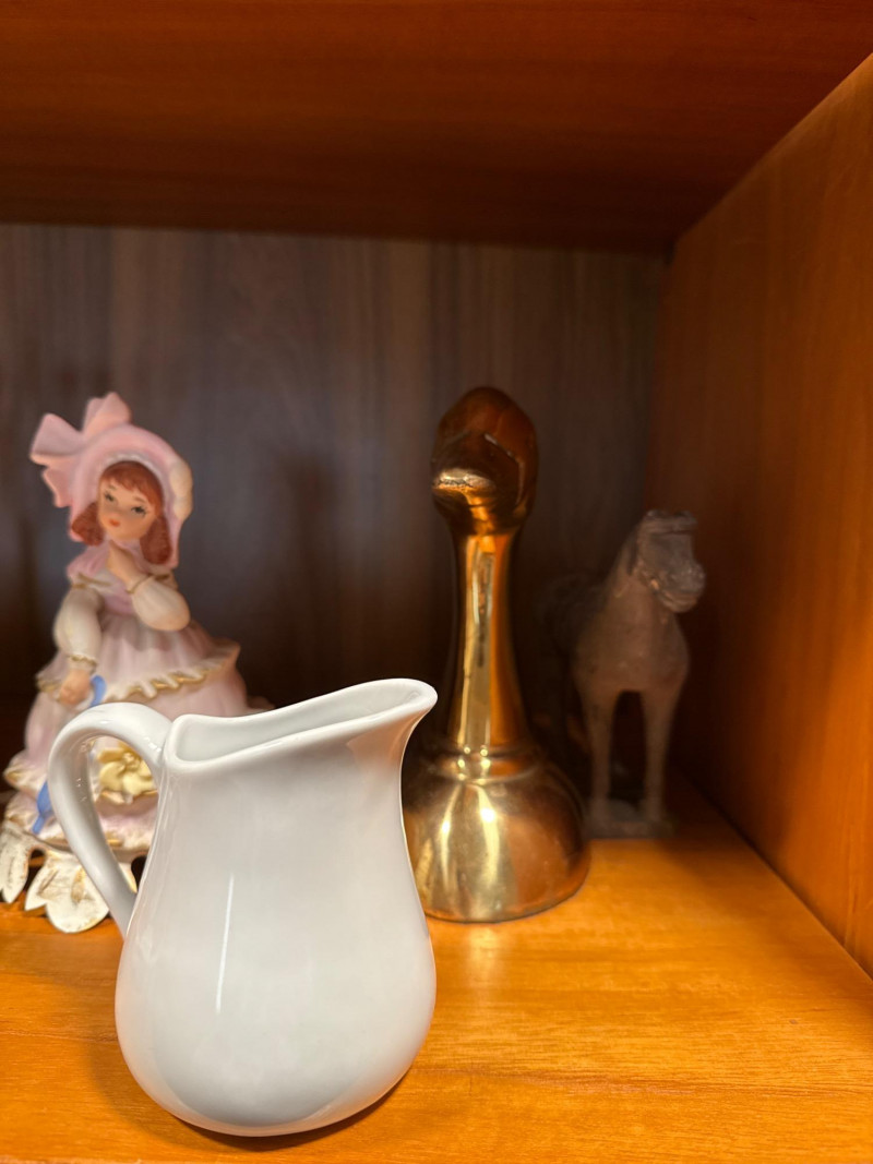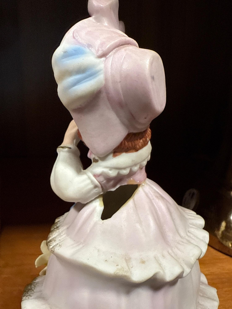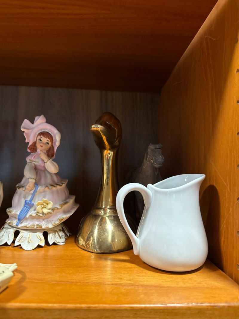 swan-shaped figure, a porcelain figurine in period attire, and a handcrafted