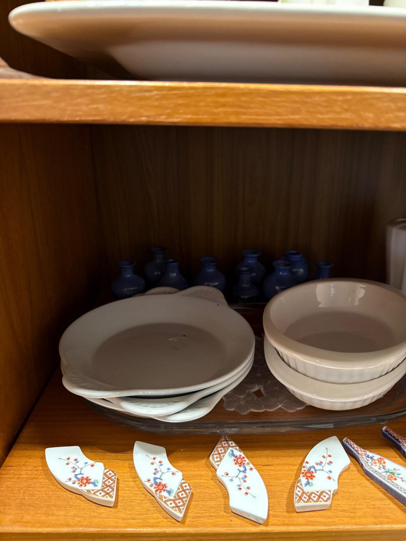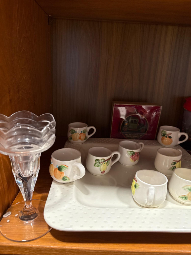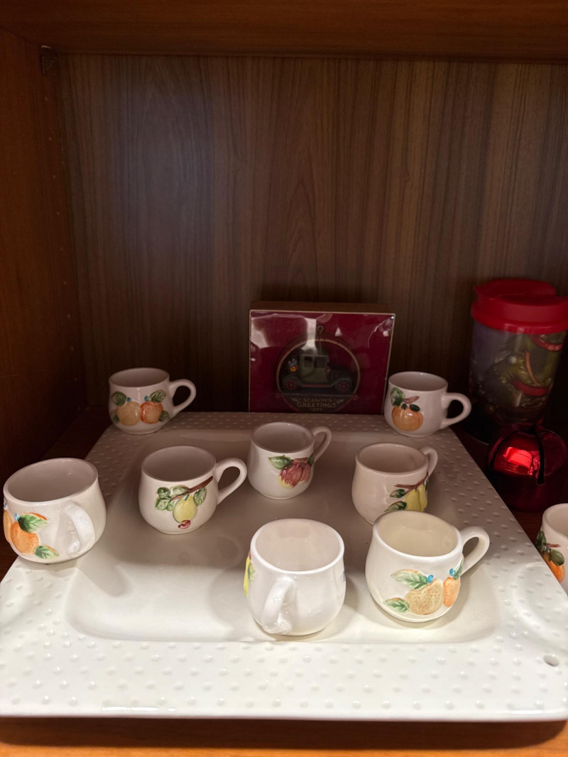 miniature blue vases, and a set of small cups with fruit motifs displayed on a