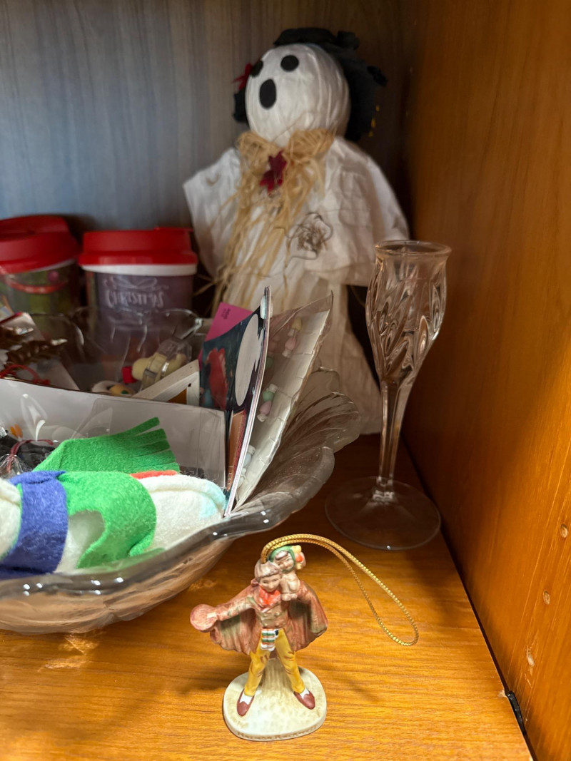 of holiday-themed décor. Several ornamental items are present, such as a brass