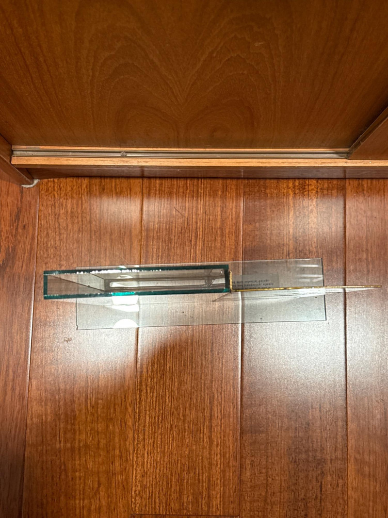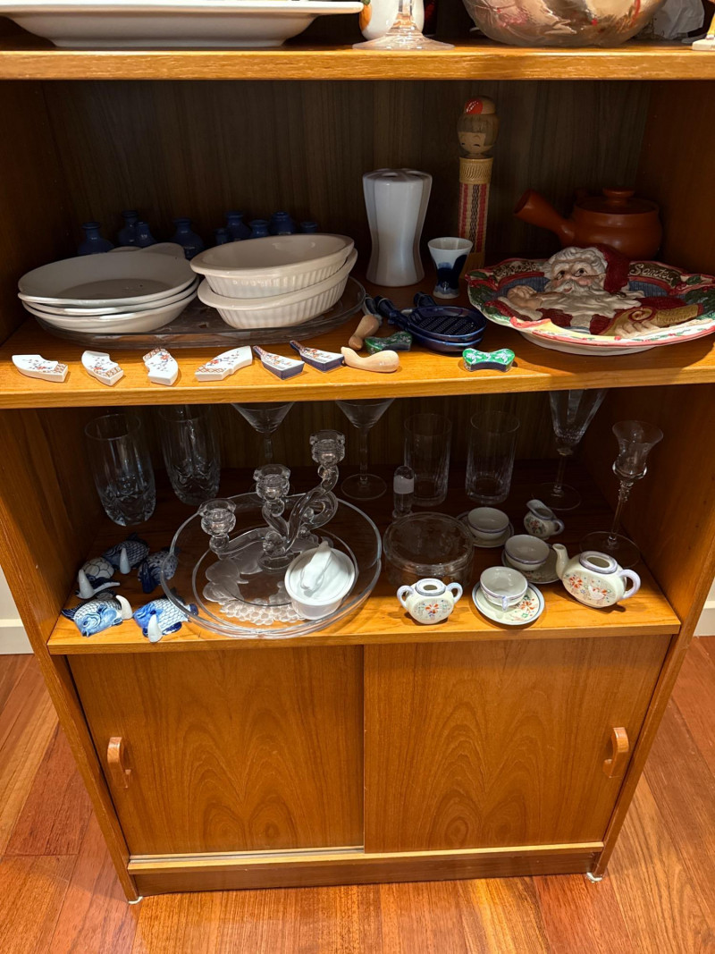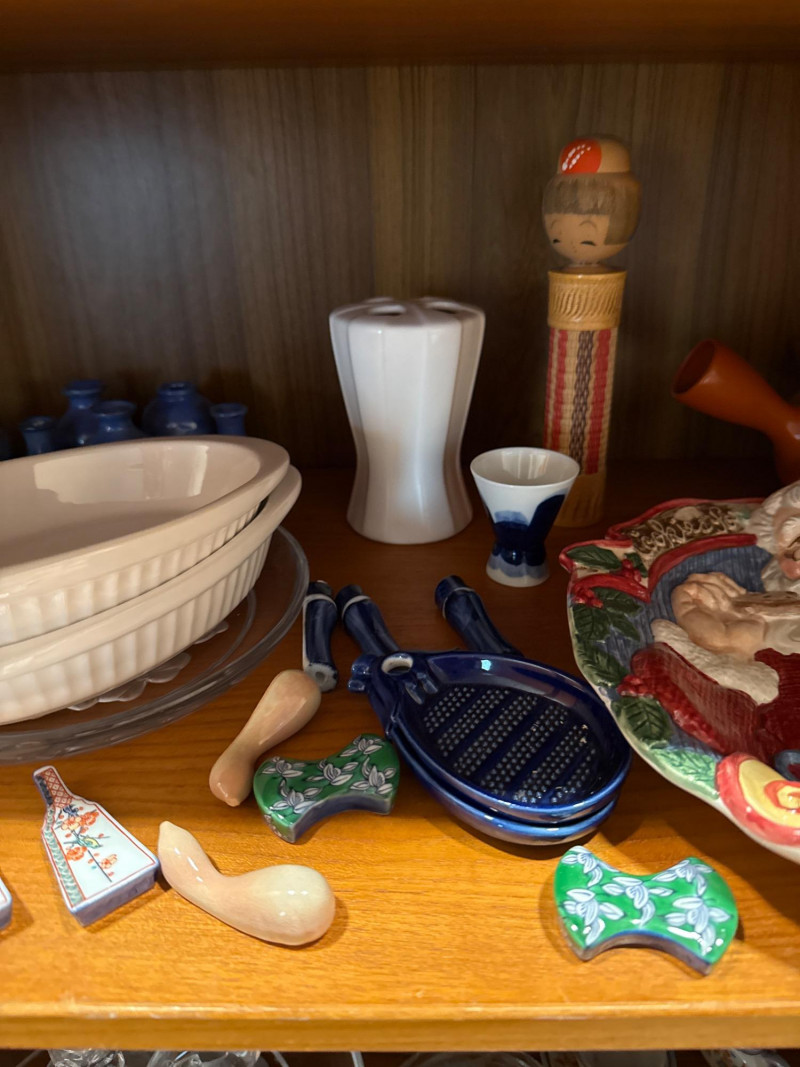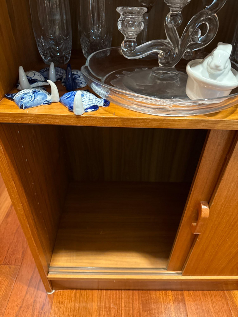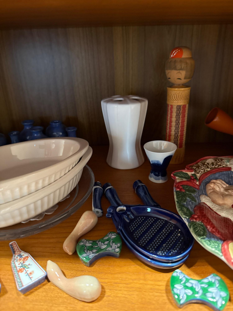 a set of decorative ceramic fragments with painted patterns. The lower cabinet