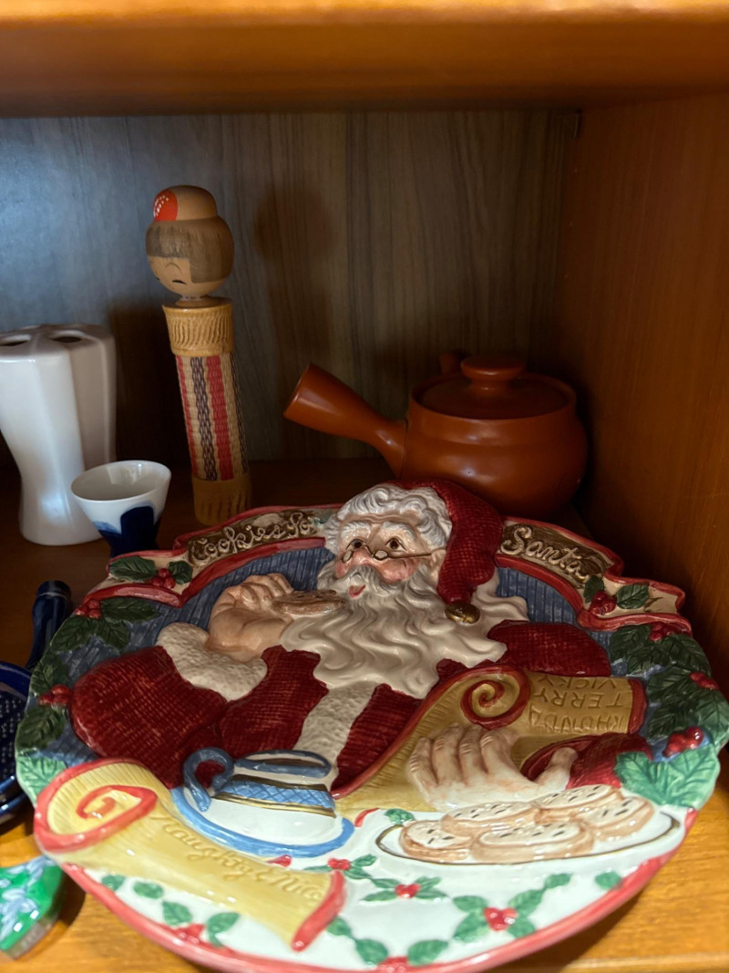 floral designs, and a festive plate depicting Santa Claus in relief, indicative